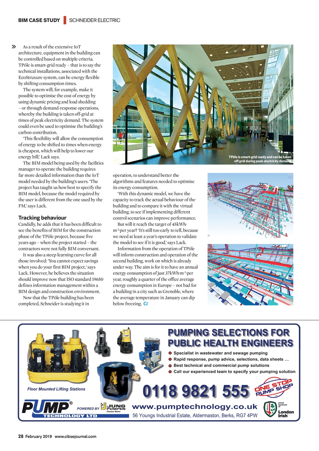BIM CASE STUDY | SCHNEIDER ELECTRIC As a result of the extensive IoT architecture, equipment in the building can be controlled based on multiple criteria. TPle is smart-grid ready that is to say the technical installations, associated with the EcoStruxure system, can be energy flexible by shifting consumption times. The system will, for example, make it possible to optimise the cost of energy by using dynamic pricing and load shedding or through demand-response operations, whereby the building is taken off-grid at timesof peak electricity demand. The system could even be used to optimise the buildings carbon contribution. This flexibility will allow the consumption of energy to be shifted to times when energy is cheapest, which will help to lower our energy bill, Lack says. The BIM model being used by the facilities manager to operate the building requires far more detailed information than the IoT model needed by the buildings users. The project has taught us how best to specify the BIM model, because the model required by the user is different from the one used by the FM, says Lack. Tracking behaviour Candidly, he adds that it has been difficult to see the benefits of BIM for the construction phase of the TPle project, because five years ago when the project started the contractors were not fully BIM conversant. It was also a steep learning curve for all those involved: You cannot expect savings when you do your first BIM project, says Lack. However, he believes the situation should improve now that ISO standard 19650 defines information management within a BIM design and construction environment. Now that the TPle building has been completed, Schneider is studying it in TPle is smart-grid ready and can be taken off grid during peak electricity demand operation, to understand better the algorithms and features needed to optimise its energy consumption. With this dynamic model, we have the capacity to track the actual behaviour of the building and to compare it with the virtual building, to see if implementing different control scenarios can improve performance. But will it reach the target of 45kWh m-2per year? Its still too early to tell, because we need at least a years operationtovalidate the model to see if it isgood, says Lack. Information from the operation of TPle will inform construction and operation of the second building, work on which is already under way. The aim is for it to have an annual energy consumption of just 37kWhm-2per year, roughly a quarter of the office average energy consumption in Europe not bad for abuilding in a city such as Grenoble, where the average temperature in January can dip below freezing. CJ 3803,1*6(/(&7,216)25 38%/,&+($/7+(1*,1((56 6SHFLDOLVWLQZDVWHZDWHUDQGVHZDJHSXPSLQJ 5DSLGUHVSRQVHSXPSDGYLFHVHOHFWLRQVGDWDVKHHWV %HVWWHFKQLFDODQGFRPPHUFLDOSXPSVROXWLRQV ROXWLR &DOORXUH[SHULHQFHGWHDPWRVSHFLI\\RXUSXPSLQJVROXWLRQ )ORRU0RXQWHG/LIWLQJ6WDWLRQV 32:(5( %< ZZZSXPSWHFKQRORJ\FRXN N