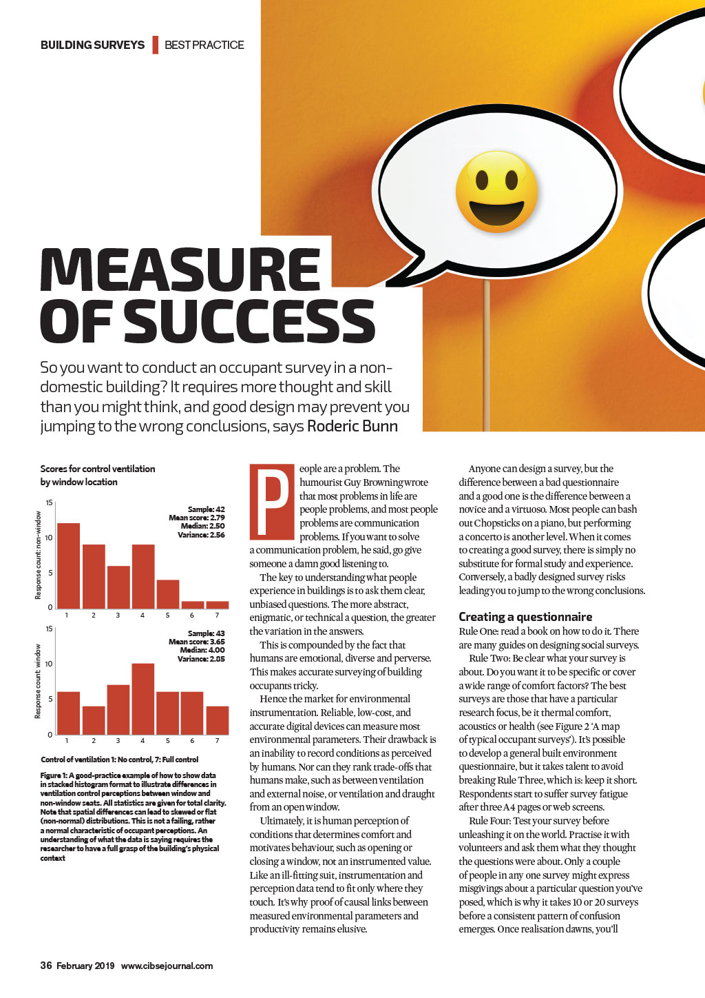 BUILDING SURVEYS | BEST PRACTICE MEASURE OF SUCCESS So you want to conduct an occupant survey in a nondomestic building? It requires more thought and skill than you might think, and good design may prevent you jumping to the wrong conclusions, says Roderic Bunn Scores for control ventilation by window location Response count: non-window 15 Sample: 42 Mean score: 2.79 Median: 2.50 Variance: 2.56 10 5 0 1 2 3 4 Response count: window 15 5 6 7 Sample: 43 Mean score: 3.65 Median: 4.00 Variance: 2.85 10 5 0 1 2 3 4 5 6 7 Control of ventilation 1: No control, 7: Full control Figure 1: A good-practice example of how to show data in stacked histogram format to illustrate differences in ventilation control perceptions between window and non-window seats. All statistics are given for total clarity. Note that spatial differences can lead to skewed or at (non-normal) distributions. This is not a failing, rather a normal characteristic of occupant perceptions. An understanding of what the data is saying requires the researcher to have a full grasp of the buildings physical context P eople are a problem. The humourist Guy Browning wrote that most problems in life are people problems, and most people problems are communication problems. If you want to solve a communication problem, he said, go give someone a damn good listening to. The key to understanding what people experience in buildings is to ask them clear, unbiased questions. The more abstract, enigmatic, or technical a question, the greater the variation in the answers. This is compounded by the fact that humans are emotional, diverse and perverse. This makes accurate surveying of building occupants tricky. Hence the market for environmental instrumentation. Reliable, low-cost, and accurate digital devices can measure most environmental parameters. Their drawback is an inability to record conditions as perceived by humans. Nor can they rank trade-offs that humans make, such as between ventilation and external noise, or ventilation and draught from an open window. Ultimately, it is human perception of conditions that determines comfort and motivates behaviour, such as opening or closing a window, not an instrumented value. Like an ill-fitting suit, instrumentation and perception data tend to fit only where they touch. Its why proof of causal links between measured environmental parameters and productivity remains elusive. Anyone can design a survey, but the difference between a bad questionnaire and a good one is the difference between a novice and a virtuoso. Most people can bash out Chopsticks on a piano, but performing a concerto is another level. When it comes to creating a good survey, there is simply no substitute for formal study and experience. Coversely, a badly designed survey risks leading you to jump to the wrong conclusions. Creating a questionnaire Rule One: read a book on how to do it. There are many guides on designing social surveys. Rule Two: Be clear what your survey is about. Do you want it to be specific or cover a wide range of comfort factors? The best surveys are those that have a particular research focus, be it thermal comfort, acoustics or health (see Figure 2 A map of typical occupant surveys). Its possible to develop a general built environment questionnaire, but it takes talent to avoid breaking Rule Three, which is: keep it short. Respondents start to suffer survey fatigue after three A4 pages or web screens. Rule Four: Test your survey before unleashing it on the world. Practise it with volunteers and ask them what they thought the questions were about. Only a couple of people in any one survey might express misgivings about a particular question youve posed, which is why it takes 10 or 20 surveys before a consistent pattern of confusion emerges. Once realisation dawns, youll 36 February 2019 www.cibsejournal.com CIBSE Feb19 pp36-38 Occupant survey JR.indd 36 28/01/2019 09:30