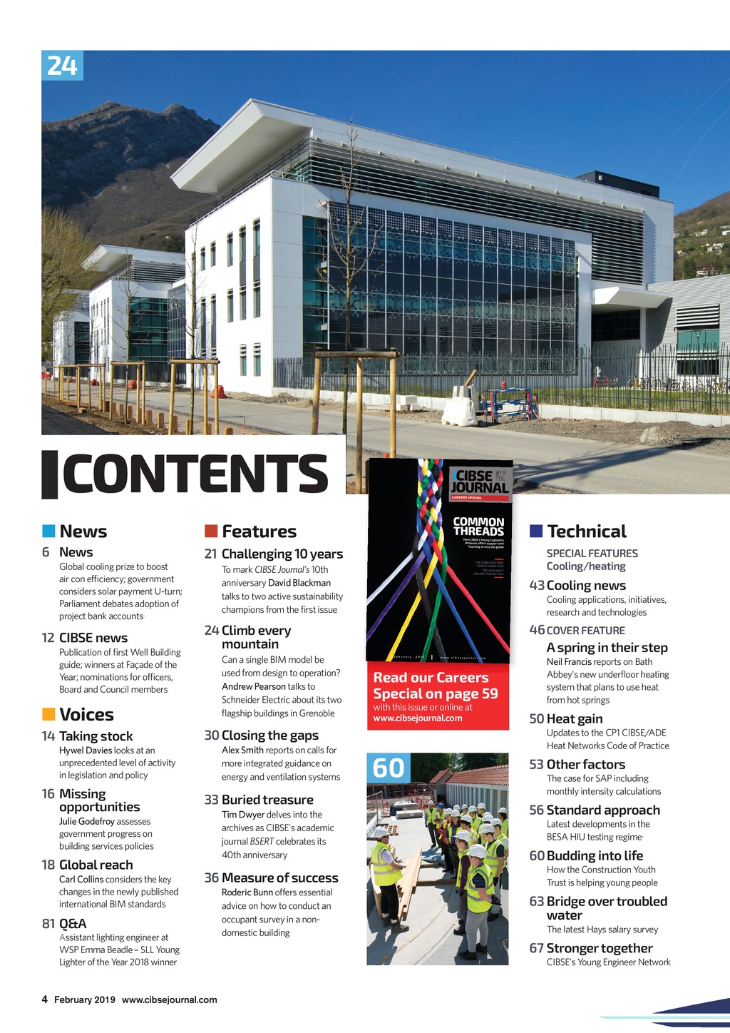 4 CONTENTS News Features 6 News 21 Challenging 10 years Global cooling prize to boost air con efciency; government considers solar payment U-turn; Parliament debates adoption of project bank accounts 12 CIBSE news Publication of rst Well Building guide; winners at Faade of the Year; nominations for ofcers, Board and Council members Can a single BIM model be used from design to operation? Andrew Pearson talks to Schneider Electric about its two agship buildings in Grenoble Carl Collins considers the key changes in the newly published international BIM standards Cooling applications, initiatives, research and technologies 46 COVER FEATURE A spring in their step Read our Careers Special on page 59 with this issue or online at www.cibsejournal.com Alex Smith reports on calls for more integrated guidance on energy and ventilation systems 33 Buried treasure Tim Dwyer delves into the archives as CIBSE s academic journal BSERT celebrates its 40th anniversary 36 Measure of success 81 Q&A Assistant lighting engineer at WSP Emma Beadle SLL Young Lighter of the Year 2018 winner Roderic Bunn offers essential advice on how to conduct an occupant survey in a nondomestic building Neil Francis reports on Bath Abbey s new underoor heating system that plans to use heat from hot springs 50 Heat gain Updates to the CP1 CIBSE/ADE Heat Networks Code of Practice 30 Closing the gaps Julie Godefroy assesses government progress on building services policies 18 Global reach 43 Cooling news 24 Climb every mountain Hywel Davies looks at an unprecedented level of activity in legislation and policy 16 Missing opportunities SPECIAL FEATURES Cooling/heating To mark CIBSE Journal s 10th anniversary David Blackman talks to two active sustainability champions from the rst issue Voices 14 Taking stock Technical 60 53 Other factors The case for SAP including monthly intensity calculations 56 Standard approach Latest developments in the BESA HIU testing regime 60 Budding into life How the Construction Youth Trust is helping young people 63 Bridge over troubled water The latest Hays salary survey 67 Stronger together CIBSE s Young Engineer Network 4 February 2019 www.cibsejournal.com CIBSE Feb19 pp04-05 Contents.indd 4 25/01/2019 18:26