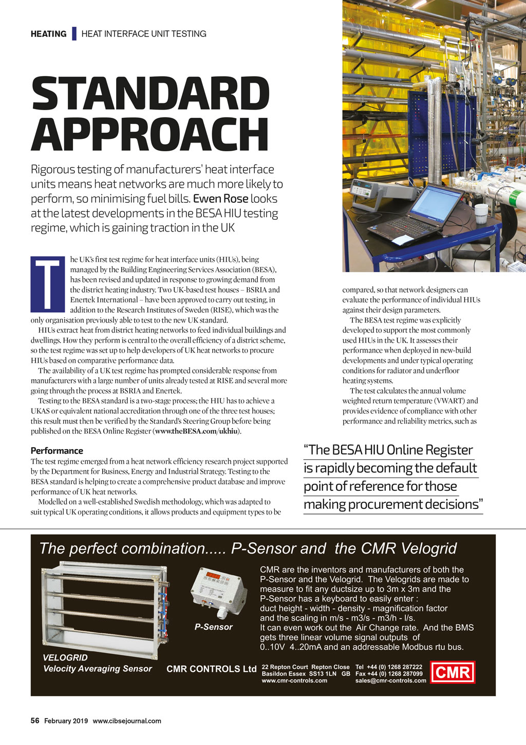 HEATING | HEAT INTERFACE UNIT TESTING STANDARD APPROACH Rigorous testing of manufacturers heat interface units means heat networks are much more likely to perform, so minimising fuel bills. Ewen Rose looks at the latest developments in the BESA HIU testing regime, which is gaining traction in the UK T he UKs first test regime for heat interface units (HIUs), being managed by the Building Engineering Services Association (BESA), has been revised and updated in response to growing demand from the district heating industry. Two UK-based test houses BSRIA and Enertek International have been approved to carry out testing, in addition to the Research Institutes of Sweden (RISE), which was the only organisation previously able to test to the new UK standard. HIUs extract heat from district heating networks to feed individual buildings and dwellings. How they perform is central to the overall efficiency of a district scheme, so the test regime was set up to help developers of UK heat networks to procure HIUs based on comparative performance data. The availability of a UK test regime has prompted considerable response from manufacturers with a large number of units already tested at RISE and several more going through the process at BSRIA and Enertek. Testing to the BESA standard is a two-stage process; the HIU has to achieve a UKAS or equivalent national accreditation through one of the three test houses; this result must then be verified by the Standards Steering Group before being published on the BESA Online Register (www.theBESA.com/ukhiu). Performance The test regime emerged from a heat network efficiency research project supported by the Department for Business, Energy and Industrial Strategy. Testing to the BESA standard is helping to create a comprehensive product database and improve performance of UK heat networks. Modelled on a well-established Swedish methodology, which was adapted to suit typical UK operating conditions, it allows products and equipment types to be compared, so that network designers can evaluate the performance of individual HIUs against their design parameters. The BESA test regime was explicitly developed to support the most commonly used HIUs in the UK. It assesses their performance when deployed in new-build developments and under typical operating conditions for radiator and underfloor heating systems. The test calculates the annual volume weighted return temperature (VWART) and provides evidence of compliance with other performance and reliability metrics, such as The BESA HIU Online Register is rapidly becoming the default point of reference for those making procurement decisions 56 February 2019 www.cibsejournal.com CIBSE Feb19 pp56-57 HIU article.indd 56 25/01/2019 16:16