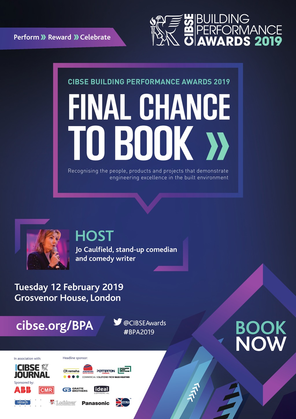 Perform Reward Celebrate CIBSE BUILDING PERFORMANCE AWARDS 2019 FINAL CHANCE TO BOOK Recognising the people, products and projects that demonstrate engineering excellence in the built environment HOST Jo Caulfield, stand-up comedian and comedy writer Tuesday 12 February 2019 Grosvenor House, London cibse.org/BPA In association with: @CIBSEAwards #BPA2019 BOOK NOW Headline sponsor: Sponsored by: 58 February 2019 www.cibsejournal.com p58_CIBSEMagFeb19.indd 58 21/01/2019 11:03