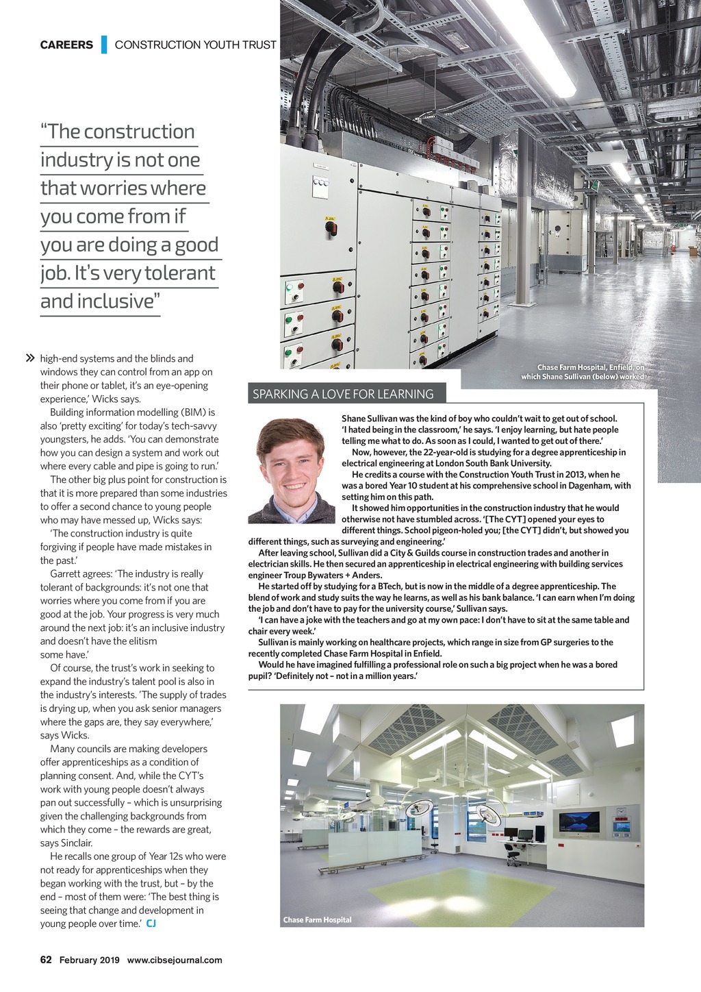 CAREERS | CONSTRUCTION YOUTH TRUST The construction industry is not one that worries where you come from if you are doing a good job. Its very tolerant and inclusive high-end systems and the blinds and windows they can control from an app on their phone or tablet, its an eye-opening experience, Wicks says. Building information modelling (BIM) is also pretty exciting for todays tech-savvy youngsters, he adds. You can demonstrate how you can design a system and work out where every cable and pipe is going to run. The other big plus point for construction is that it is more prepared than some industries to offer a second chance to young people who may have messed up, Wicks says: The construction industry is quite forgiving if people have made mistakes in the past. Garrett agrees: The industry is really tolerant of backgrounds: its not one that worries where you come from if you are good at the job. Your progress is very much around the next job: its an inclusive industry and doesnt have the elitism some have. Of course, the trusts work in seeking to expand the industrys talent pool is also in the industrys interests. The supply of trades is drying up, when you ask senior managers where the gaps are, they say everywhere, says Wicks. Many councils are making developers offer apprenticeships as a condition of planning consent. And, while the CYTs work with young people doesnt always pan out successfully which is unsurprising given the challenging backgrounds from which they come the rewards are great, says Sinclair. He recalls one group of Year 12s who were not ready for apprenticeships when they began working with the trust, but by the end most of them were: The best thing is seeing that change and development in young people over time. CJ Chase Farm Hospital, Eneld, on which Shane Sullivan (below) worked SPARKING A LOVE FOR LEARNING Shane Sullivan was the kind of boy who couldnt wait to get out of school. I hated being in the classroom, he says. I enjoy learning, but hate people telling me what to do. As soon as I could, I wanted to get out of there. Now, however, the 22-year-old is studying for a degree apprenticeship in electrical engineering at London South Bank University. He credits a course with the Construction Youth Trust in 2013, when he was a bored Year 10 student at his comprehensive school in Dagenham, with setting him on this path. It showed him opportunities in the construction industry that he would otherwise not have stumbled across. [The CYT] opened your eyes to different things. School pigeon-holed you; [the CYT] didnt, but showed you different things, such as surveying and engineering. After leaving school, Sullivan did a City & Guilds course in construction trades and another in electrician skills. He then secured an apprenticeship in electrical engineering with building services engineer Troup Bywaters + Anders. He started off by studying for a BTech, but is now in the middle of a degree apprenticeship. The blend of work and study suits the way he learns, as well as his bank balance. I can earn when Im doing the job and dont have to pay for the university course, Sullivan says. I can have a joke with the teachers and go at my own pace: I dont have to sit at the same table and chair every week. Sullivan is mainly working on healthcare projects, which range in size from GP surgeries to the recently completed Chase Farm Hospital in Eneld. Would he have imagined fullling a professional role on such a big project when he was a bored pupil? Denitely not not in a million years. Chase Farm Hospital 62 February 2019 www.cibsejournal.com CIBSE Feb19 pp60-62 CYT Supp.indd 62 25/01/2019 16:02