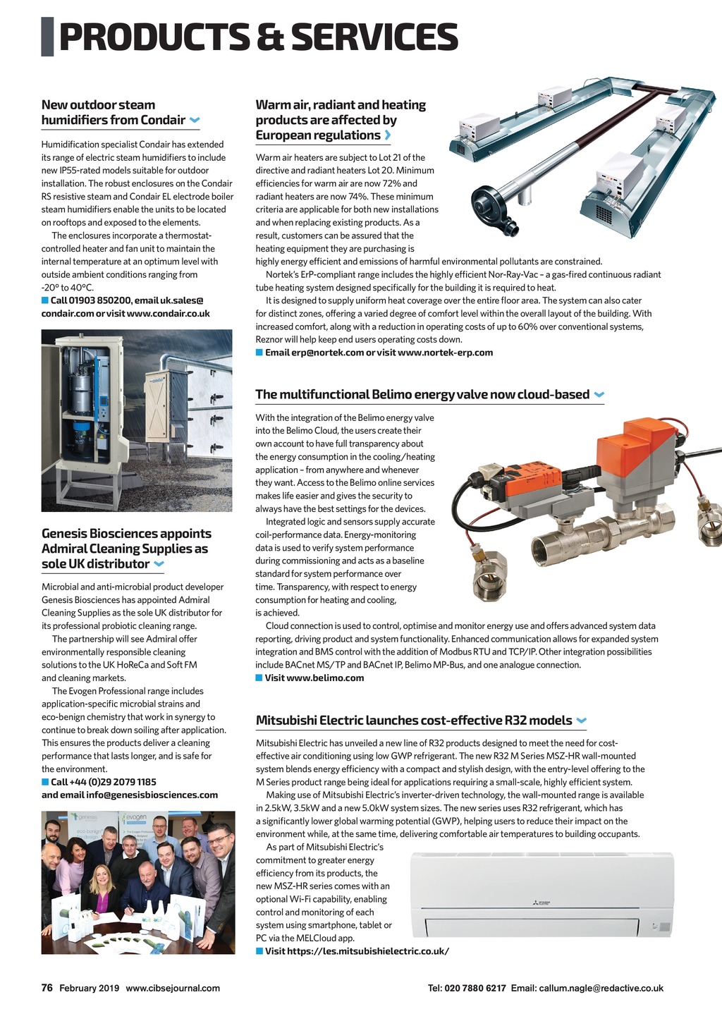 PRODUCTS & SERVICES New outdoor steam humidiers from Condair Humidification specialist Condair has extended its range of electric steam humidifiers to include new IP55-rated models suitable for outdoor installation. The robust enclosures on the Condair RS resistive steam and Condair EL electrode boiler steam humidifiers enable the units to be located on rooftops and exposed to the elements. The enclosures incorporate a thermostatcontrolled heater and fan unit to maintain the internal temperature at an optimum level with outside ambient conditions ranging from -20 to 40C. Call 01903 850200, email uk.sales@ condair.com or visit www.condair.co.uk Warm air, radiant and heating products are affected by European regulations Warm air heaters are subject to Lot 21 of the directive and radiant heaters Lot 20. Minimum efficiencies for warm air are now 72% and radiant heaters are now 74%. These minimum criteria are applicable for both new installations and when replacing existing products. As a result, customers can be assured that the heating equipment they are purchasing is highly energy efficient and emissions of harmful environmental pollutants are constrained. Norteks ErP-compliant range includes the highly efficient Nor-Ray-Vac a gas-fired continuous radiant tube heating system designed specifically for the building it is required to heat. It is designed to supply uniform heat coverage over the entire floor area. The system can also cater for distinct zones, offering a varied degree of comfort level within the overall layout of the building. With increased comfort, along with a reduction in operating costs of up to 60% over conventional systems, Reznor will help keep end users operating costs down. Email erp@nortek.com or visit www.nortek-erp.com The multifunctional Belimo energy valve now cloud-based Genesis Biosciences appoints Admiral Cleaning Supplies as sole UK distributor Microbial and anti-microbial product developer Genesis Biosciences has appointed Admiral Cleaning Supplies as the sole UK distributor for its professional probiotic cleaning range. The partnership will see Admiral offer environmentally responsible cleaning solutions to the UK HoReCa and Soft FM and cleaning markets. The Evogen Professional range includes application-specific microbial strains and eco-benign chemistry that work in synergy to continue to break down soiling after application. This ensures the products deliver a cleaning performance that lasts longer, and is safe for the environment. Call +44 (0)29 2079 1185 and email info@genesisbiosciences.com 76 February 2019 www.cibsejournal.com CIBSE Feb19 pp76-79 Products.indd 76 With the integration of the Belimo energy valve into the Belimo Cloud, the users create their own account to have full transparency about the energy consumption in the cooling/heating application from anywhere and whenever they want. Access to the Belimo online services makes life easier and gives the security to always have the best settings for the devices. Integrated logic and sensors supply accurate coil-performance data. Energy-monitoring data is used to verify system performance during commissioning and acts as a baseline standard for system performance over time. Transparency, with respect to energy consumption for heating and cooling, is achieved. Cloud connection is used to control, optimise and monitor energy use and offers advanced system data reporting, driving product and system functionality. Enhanced communication allows for expanded system integration and BMS control with the addition of Modbus RTU and TCP/IP. Other integration possibilities include BACnet MS/TP and BACnet IP, Belimo MP-Bus, and one analogue connection. Visit www.belimo.com Mitsubishi Electric launches cost-effective R32 models Mitsubishi Electric has unveiled a new line of R32 products designed to meet the need for costeffective air conditioning using low GWP refrigerant. The new R32 M Series MSZ-HR wall-mounted system blends energy efficiency with a compact and stylish design, with the entry-level offering to the M Series product range being ideal for applications requiring a small-scale, highly efficient system. Making use of Mitsubishi Electrics inverter-driven technology, the wall-mounted range is available in 2.5kW, 3.5kW and a new 5.0kW system sizes. The new series uses R32 refrigerant, which has a significantly lower global warming potential (GWP), helping users to reduce their impact on the environment while, at the same time, delivering comfortable air temperatures to building occupants. As part of Mitsubishi Electrics commitment to greater energy efficiency from its products, the new MSZ-HR series comes with an optional Wi-Fi capability, enabling control and monitoring of each system using smartphone, tablet or PC via the MELCloud app. Visit https://les.mitsubishielectric.co.uk/ Tel: 020 7880 6217 Email: callum.nagle@redactive.co.uk 25/01/2019 15:59