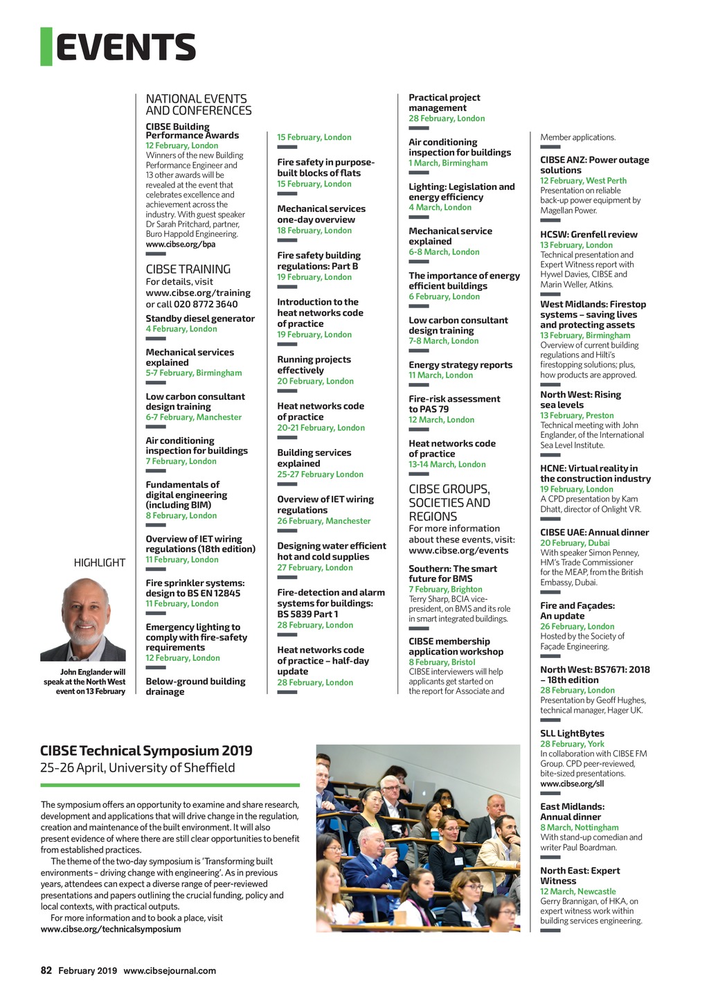 EVENTS NATIONAL EVENTS AND CONFERENCES CIBSE Building Performance Awards 12 February, London Winners of the new Building Performance Engineer and 13other awards will be revealed at the event that celebrates excellence and achievement across the industry. With guest speaker Dr Sarah Pritchard, partner, Buro Happold Engineering. www.cibse.org/bpa CIBSE TRAINING For details, visit www.cibse.org/training or call 020 8772 3640 Standby diesel generator 4 February, London Mechanical services explained 5-7 February, Birmingham Low carbon consultant design training 6-7 February, Manchester Practical project management 28 February, London 15 February, London Fire safety in purposebuilt blocks of flats 15 February, London Mechanical services one-day overview 18 February, London Fire safety building regulations: Part B 19 February, London Introduction to the heat networks code ofpractice 19 February, London Running projects effectively 20 February, London Heat networks code ofpractice 20-21 February, London Air conditioning inspection for buildings 7 February, London Fundamentals of digitalengineering (including BIM) 8 February, London Overview of IET wiring regulations (18th edition) HIGHLIGHT 11 February, London Fire sprinkler systems: design to BS EN 12845 11 February, London Emergency lighting to comply with fire-safety requirements 12 February, London John Englander will speak at the North West event on 13 February Below-ground building drainage Building services explained 25-27 February London Overview of IET wiring regulations 26 February, Manchester Designing water efficient hot and cold supplies 27 February, London Fire-detection and alarm systems for buildings: BS5839 Part 1 28 February, London Heat networks code of practice half-day update 28 February, London Air conditioning inspection for buildings 1 March, Birmingham Member applications. CIBSE ANZ: Power outage solutions Lighting: Legislation and energy efficiency 12 February, West Perth Presentation on reliable back-up power equipment by Magellan Power. Mechanical service explained HCSW: Grenfell review 4 March, London 6-8 March, London The importance of energy efficient buildings 6 February, London Low carbon consultant design training 13 February, London Technical presentation and Expert Witness report with Hywel Davies, CIBSE and Marin Weller, Atkins. West Midlands: Firestop systems saving lives and protecting assets 11 March, London 13 February, Birmingham Overview of current building regulations and Hiltis firestopping solutions; plus, how products are approved. Fire-risk assessment toPAS 79 North West: Rising sealevels 7-8 March, London Energy strategy reports 12 March, London Heat networks code ofpractice 13-14 March, London CIBSE GROUPS, SOCIETIES AND REGIONS For more information about these events, visit: www.cibse.org/events Southern: The smart future for BMS 7 February, Brighton Terry Sharp, BCIA vicepresident, on BMS and its role in smart integrated buildings. CIBSE membership application workshop 8 February, Bristol CIBSE interviewers will help applicants get started on the report for Associate and 13 February, Preston Technical meeting with John Englander, of the International Sea Level Institute. HCNE: Virtual reality in the construction industry 19 February, London A CPD presentation by Kam Dhatt, director of Onlight VR. CIBSE UAE: Annual dinner 20 February, Dubai With speaker Simon Penney, HMs Trade Commissioner for the MEAP, from the British Embassy, Dubai. Fire and Faades: Anupdate 26 February, London Hosted by the Society of Faade Engineering. North West: BS7671: 2018 18th edition 28 February, London Presentation by Geoff Hughes, technical manager, Hager UK. SLL LightBytes CIBSE Technical Symposium 2019 25-26 April, University of Sheffield The symposium offers an opportunity to examine and share research, development and applications that will drive change in the regulation, creation and maintenance of the built environment. It will also present evidence of where there are still clear opportunities to benefit from established practices. The theme of the two-day symposium is Transforming built environments driving change with engineering. As in previous years, attendees can expect a diverse range of peer-reviewed presentations and papers outlining the crucial funding, policy and local contexts, with practical outputs. For more information and to book a place, visit www.cibse.org/technicalsymposium 28 February, York In collaboration with CIBSE FM Group. CPD peer-reviewed, bite-sized presentations. www.cibse.org/sll East Midlands: Annualdinner 8 March, Nottingham With stand-up comedian and writer Paul Boardman. North East: Expert Witness 12 March, Newcastle Gerry Brannigan, of HKA, on expert witness work within building services engineering. 82 February 2019 www.cibsejournal.com CIBSE Feb19 pp82 Events.indd 82 25/01/2019 15:58