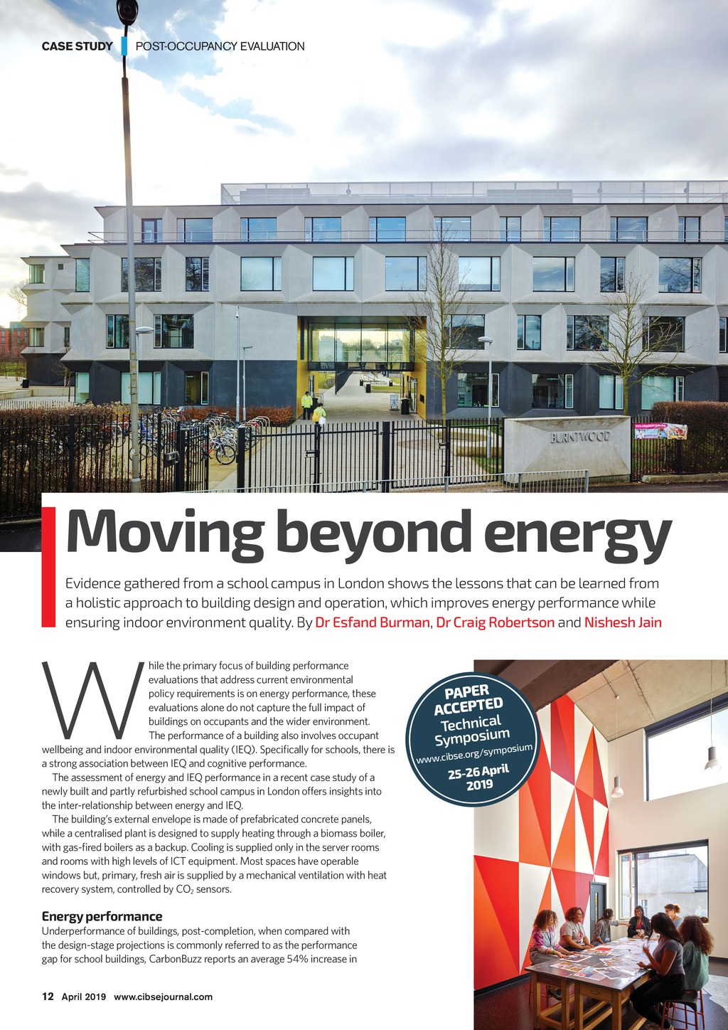 CASE STUDY | POST-OCCUPANCY EVALUATION Moving beyond energy Evidence gathered from a school campus in London shows the lessons that can be learned from a holistic approach to building design and operation, which improves energy performance while ensuring indoor environment quality. By Dr Esfand Burman, Dr Craig Robertson and Nishesh Jain W hile the primary focus of building performance evaluations that address current environmental policy requirements is on energy performance, these evaluations alone do not capture the full impact of buildings on occupants and the wider environment. The performance of a building also involves occupant wellbeing and indoor environmental quality (IEQ). Specifically for schools, there is a strong association between IEQ and cognitive performance. The assessment of energy and IEQ performance in a recent case study of a newly built and partly refurbished school campus in London offers insights into theinter-relationship between energy and IEQ. The buildings external envelope is made of prefabricated concrete panels, whilea centralised plant is designed to supply heating through a biomass boiler, with gas-fired boilers as a backup. Cooling is supplied only in the server rooms androoms with high levels of ICT equipment. Most spaces have operable windows but, primary, fresh air is supplied by a mechanical ventilation with heat recovery system, controlled by CO2 sensors. PAPER ACCEPTED Technicalm Symposiu sium o .org/symp www.cibse il 25-26 Apr 9 201 Energy performance Underperformance of buildings, post-completion, when compared with the design-stage projections is commonly referred to as the performance gapforschool buildings, CarbonBuzz reports an average 54% increase in 12 April 2019 www.cibsejournal.com CIBSE Apr19 pp12-14 School Supp POE.indd 12 22/03/2019 13:14