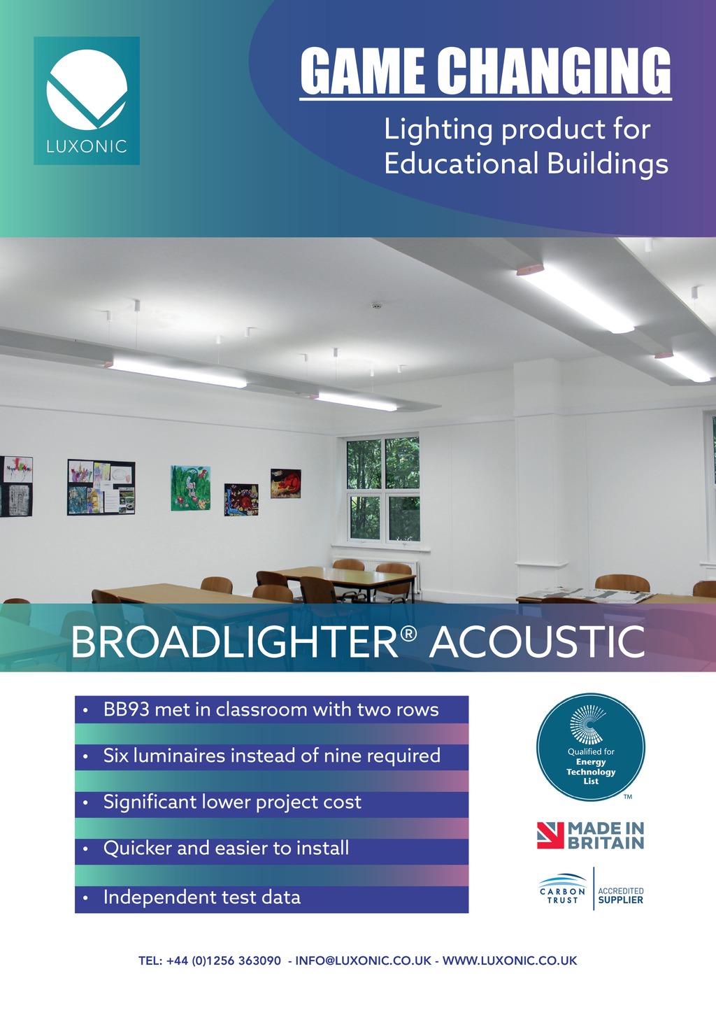 AME CHANGING Lighting product for Educational Buildings BROADLIGHTER ACOUSTIC BB93 met in classroom with two rows Six luminaires instead of nine required Signicant lower project cost Quicker and easier to install Independent test data TEL: +44 (0)1256 363090 - INFO@LUXONIC.CO.UK - WWW.LUXONIC.CO.UK 2 April 2019 www.cibsejournal.com p02_CIBSEEduApr19.indd 2 Luxonic FP.indd 1 19/03/2019 16:01 17:09 06/03/2019