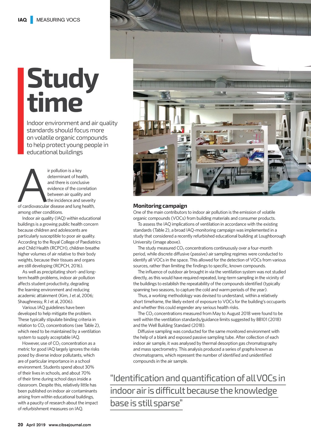 IAQ | MEASURING VOCS Study time Indoor environment and air quality standards should focus more on volatile organic compounds to help protect young people in educationalbuildings A ir pollution is a key determinant of health, and there is conclusive evidence of the correlation between air quality and the incidence and severity of cardiovascular disease and lung health, among other conditions. Indoor air quality (IAQ) within educational buildings is a growing public health concern because children and adolescents are particularly susceptible to poor air quality. According to the Royal College of Paediatrics and Child Health (RCPCH), children breathe higher volumes of air relative to their body weights, because their tissues and organs are still developing (RCPCH, 2016). As well as precipitating short- and longterm health problems, indoor air pollution affects student productivity, degrading the learning environment and reducing academic attainment (Kim, J et al, 2006; Shaughnessy, R J et al, 2006). Various IAQ guidelines have been developed to help mitigate the problem. These typically stipulate binding criteria in relation to CO2 concentrations (see Table 2), which need to be maintained by a ventilation system to supply acceptable IAQ. However, use of CO2 concentration as a metric for good IAQ largely ignores the risks posed by diverse indoor pollutants, which are of particular importance in a school environment. Students spend about 30% of their lives in schools, and about 70% of their time during school days inside a classroom. Despite this, relatively little has been published on indoor air contaminants arising from within educational buildings, with a paucity of research about the impact of refurbishment measures on IAQ. Monitoring campaign One of the main contributors to indoor air pollution is the emission of volatile organic compounds (VOCs) from building materials and consumer products. To assess the IAQ implications of ventilation in accordance with the existing standards (Table 2), a broad IAQ-monitoring campaign was implemented in a study that considered a recently refurbished educational building at Loughborough University (image above). The study measured CO2 concentrations continuously over a four-month period, while discrete diffusive (passive) air sampling regimes were conducted to identify all VOCs in the space. This allowed for the detection of VOCs from various sources, rather than limiting the findings to specific, known compounds. The influence of outdoor air brought in via the ventilation system was not studied directly, as this would have required repeated, long-term sampling in the vicinity of the buildings to establish the repeatability of the compounds identified (typically spanning two seasons, to capture the cold and warm periods of the year). Thus, a working methodology was devised to understand, within a relatively short timeframe, the likely extent of exposure to VOCs for the buildings occupants and whether this could engender any serious health risks. The CO2 concentrations measured from May to August 2018 were found to be well within the ventilation standards/guidance limits suggested by BB101 (2018) and the Well Building Standard (2018). Diffusive sampling was conducted for the same monitored environment with the help of a blank and exposed passive sampling tube. After collection of each indoor air sample, it was analysed by thermal desorption gas chromatography and mass spectrometry. This analysis produced a series of graphs known as chromatograms, which represent the number of identified and unidentified compounds in the air sample. Identification and quantification of all VOCs in indoor air is difficult because the knowledge base is still sparse 20 April 2019 www.cibsejournal.com CIBSE Apr19 pp20-22 School Supp VOCs.indd 20 22/03/2019 13:17