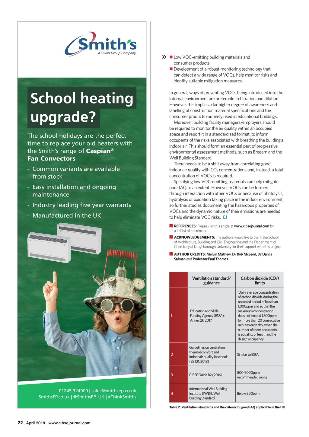 Low VOC-emitting building materials and consumerproducts Development of a robust monitoring technology that can detect a wide range of VOCs, help monitor risks and identify suitable mitigation measures. School heating upgrade? The school holidays are the perfect time to replace your old heaters with the Smiths range of Caspian Fan Convectors - Common variants are available from stock - Easy installation and ongoing maintenance - Industry leading five year warranty - Manufactured in the UK In general, ways of preventing VOCs being introduced into the internal environment are preferable to filtration and dilution. However, this implies a far higher degree of awareness and labelling of construction material specifications and the consumer products routinely used in educational buildings. Moreover, building facility managers/employers should be required to monitor the air quality within an occupied space and report it in a standardised format, to inform occupants of the risks associated with breathing the buildings indoor air. This should form an essential part of progressive environmental assessment methods, such as Breeam and the Well Building Standard. There needs to be a shift away from correlating good indoor air quality with CO2 concentrations and, instead, a total concentration of VOCs is required. Specifying low VOC-emitting materials can help mitigate poor IAQ to an extent. However, VOCs can be formed through interaction with other VOCs or because of photolysis, hydrolysis or oxidation taking place in the indoor environment, so further studies documenting the hazardous properties of VOCs and the dynamic nature of their emissions are needed to help eliminate VOC risks. CJ REFERENCES: Please visit this article at www.cibsejournal.com for a full list of references. ACKNOWLEDGEMENTS: The authors would like to thank the School of Architecture, Building and Civil Engineering and the Department of Chemistry at Loughborough University for their support with this project. AUTHOR CREDITS: Melvin Mathew, Dr Rob McLeod, Dr Dahlia Salman and Professor Paul Thomas Ventilation standard/ guidance 01245 324900 | sales@smithsep.co.uk SmithsEP.co.uk | @SmithsEP_UK | #ThinkSmiths Carbon dioxide (CO2) limits 1 Education and Skills FundingAgency (ESFA), Annex 2F, 2017 Daily average concentration of carbon dioxide during the occupied period of less than 1,000ppm and so that the maximum concentration does not exceed 1,500ppm for more than 20 consecutive minutes each day, when the number of room occupants is equal to, or less than, the designoccupancy 2 Guidelines on ventilation, thermal comfort and indoor air quality in schools (BB101,2018) Similar to ESFA 3 CIBSE Guide B2 (2016) 800-1,000ppm recommendedrange 4 International Well Building Institute (IWBI), Well BuildingStandard Below 800ppm Table 2: Ventilation standards and the criteria for good IAQ applicable in the UK 22 April 2019 www.cibsejournal.com CIBSE Apr19 pp20-22 School Supp VOCs.indd 22 22/03/2019 13:17