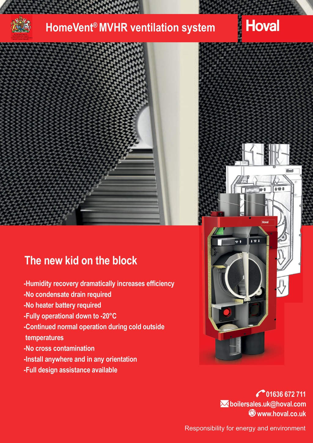 omeVent MVHR ventilation system The new kid on the block +XPLGLW\UHFRYHU\GUDPDWLFDOO\LQFUHDVHVHIFLHQF\ -No condensate drain required -No heater battery required -Fully operational down to -20C -Continued normal operation during cold outside temperatures -No cross contamination -Install anywhere and in any orientation -Full design assistance available 01636 672 711 boilersales.uk@hoval.com www.hoval.co.uk 4 April 2019 www.cibsejournal.com p04_CIBSEEduApr19.indd 4 Responsibility for energy and environment 19/03/2019 17:11