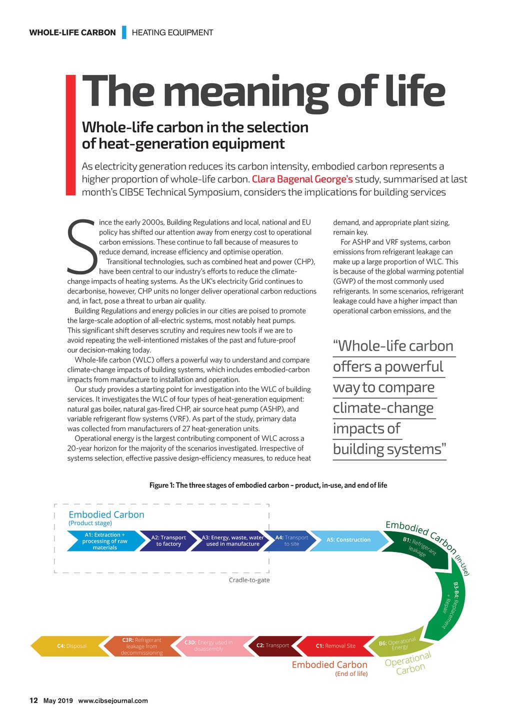 WHOLE-LIFE CARBON | HEATING EQUIPMENT The meaning of life Whole-life carbon in the selection of heat-generation equipment As electricity generation reduces its carbon intensity, embodied carbon represents a higher proportion of whole-life carbon. Clara Bagenal Georges study, summarised at last months CIBSE Technical Symposium, considers the implications for building services S ince the early 2000s, Building Regulations and local, national and EU policy has shifted our attention away from energy cost to operational carbon emissions. These continue to fall because of measures to reduce demand, increase efficiency and optimise operation. Transitional technologies, such as combined heat and power (CHP), have been central to our industrys efforts to reduce the climatechange impacts of heating systems. As the UKs electricity Grid continues to decarbonise, however, CHP units no longer deliver operational carbon reductions and, in fact,pose a threat to urban air quality. Building Regulations and energy policies in our cities are poised to promote the large-scale adoption of all-electric systems, most notably heat pumps. This significant shift deserves scrutiny and requires new tools if we are to avoid repeating the well-intentioned mistakes of the past and future-proof our decision-making today. Whole-life carbon (WLC) offers a powerful way to understand and compare climate-change impacts of building systems, which includes embodied-carbon impacts from manufacture to installation and operation. Our study provides a starting point for investigation into the WLC of building services. It investigates the WLC of four types of heat-generation equipment: natural gas boiler, natural gas-fired CHP, air source heat pump (ASHP), and variable refrigerant flow systems (VRF). As part of the study, primary data was collected from manufacturers of 27 heat-generation units. Operational energy is the largest contributing component of WLC across a 20-year horizon for the majority of the scenarios investigated. Irrespective of systems selection, effective passive design-efficiency measures, to reduce heat demand, and appropriate plant sizing, remain key. For ASHP and VRF systems, carbon emissions from refrigerant leakage can make up a large proportion of WLC. This is because of the global warming potential (GWP) of the most commonly used refrigerants. In some scenarios, refrigerant leakage could have a higher impact than operational carbon emissions, and the Whole-lifecarbon offers a powerful way to compare climate-change impacts of buildingsystems Figure 1: The three stages of embodied carbon product, in-use, and end of life 12 May 2019 www.cibsejournal.com CIBSE May19 pp12-14 Life cycle heat Supp.indd 12 26/04/2019 15:25