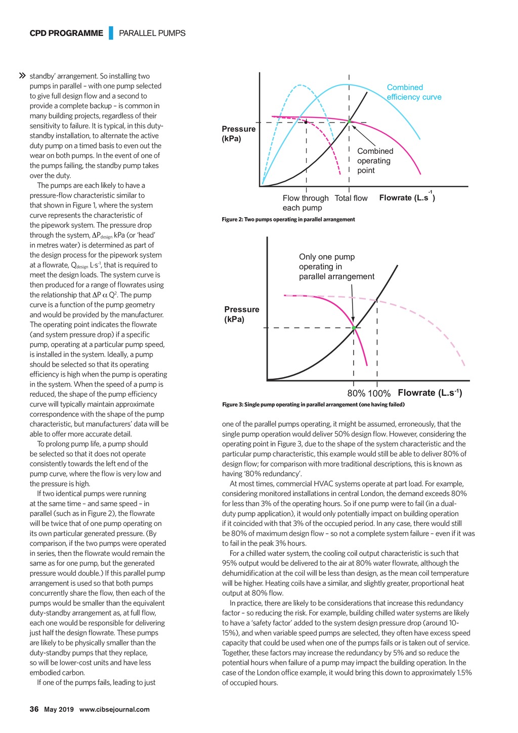 CPD PROGRAMME | PARALLEL PUMPS standby arrangement. So installing two pumps in parallel with one pump selected to give full design flow and a second to provide a complete backup is common in many building projects, regardless of their sensitivity to failure. It is typical, in this dutystandby installation, to alternate the active duty pump on a timed basis to even out the wear on both pumps. In the event of one of the pumps failing, the standby pump takes over the duty. The pumps are each likely to have a pressure-flow characteristic similar to that shown in Figure 1, where the system curve represents the characteristic of the pipework system. The pressure drop through the system, Pdesign kPa (or head in metres water) is determined as part of the design process for the pipework system at a flowrate, Qdesign Ls-1, that is required to meet the design loads. The system curve is then produced for a range of flowrates using the relationship that P Q2. The pump curve is a function of the pump geometry and would be provided by the manufacturer. The operating point indicates the flowrate (and system pressure drop) if a specific pump, operating at a particular pump speed, is installed in the system. Ideally, a pump should be selected so that its operating efficiency is high when the pump is operating in the system. When the speed of a pump is reduced, the shape of the pump efficiency curve will typically maintain approximate correspondence with the shape of the pump characteristic, but manufacturers data will be able to offer more accurate detail. To prolong pump life, a pump should be selected so that it does not operate consistently towards the left end of the pumpcurve, where the flow is very low and the pressure is high. If two identical pumps were running at the same time and same speed in parallel (such as in Figure 2), the flowrate will be twice that of one pump operating on its own particular generated pressure. (By comparison, if the two pumps were operated in series, then the flowrate would remain the same as for one pump, but the generated pressure would double.) If this parallel pump arrangement is used so that both pumps concurrently share the flow, then each of the pumps would be smaller than the equivalent duty-standby arrangement as, at full flow, each one would be responsible for delivering just half the design flowrate. These pumps are likely to be physically smaller than the duty-standby pumps that they replace, so willbe lower-cost units and have less embodied carbon. If one of the pumps fails, leading to just Combined efficiency curve Pressure (kPa) Combined operating point Flow through Total flow each pump -1 Flowrate (L.s ) Figure 2: Two pumps operating in parallel arrangement Only one pump operating in parallel arrangement Pressure (kPa) 80% 100% Flowrate (L.s-1) Figure 3: Single pump operating in parallel arrangement (one having failed) one of the parallel pumps operating, it might be assumed, erroneously, that the single pump operation would deliver 50% design flow. However, considering the operating point in Figure 3, due to the shape of the system characteristic and the particular pump characteristic, this example would still be able to deliver 80% of design flow; for comparison with more traditional descriptions, this is known as having 80% redundancy. At most times, commercial HVAC systems operate at part load. For example, considering monitored installations in central London, the demand exceeds 80% for less than 3% of the operating hours. So if one pump were to fail (in a dualduty pump application), it would only potentially impact on building operation ifit coincided with that 3% of the occupied period. In any case, there would still be80% of maximum design flow so not a complete system failure even if it was to fail in the peak 3% hours. For a chilled water system, the cooling coil output characteristic is such that 95% output would be delivered to the air at 80% water flowrate, although the dehumidification at the coil will be less than design, as the mean coil temperature will be higher. Heating coils have a similar, and slightly greater, proportional heat output at 80% flow. In practice, there are likely to be considerations that increase this redundancy factor so reducing the risk. For example, building chilled water systems are likely to have a safety factor added to the system design pressure drop (around 1015%), and when variable speed pumps are selected, they often have excess speed capacity that could be used when one of the pumps fails or is taken out of service. Together, these factors may increase the redundancy by 5% and so reduce the potential hours when failure of a pump may impact the building operation. In the case of the London office example, it would bring this down to approximately 1.5% of occupied hours. 36 May 2019 www.cibsejournal.com CIBSE May19 Supp pp35-38 CPD v2.indd 36 26/04/2019 15:37
