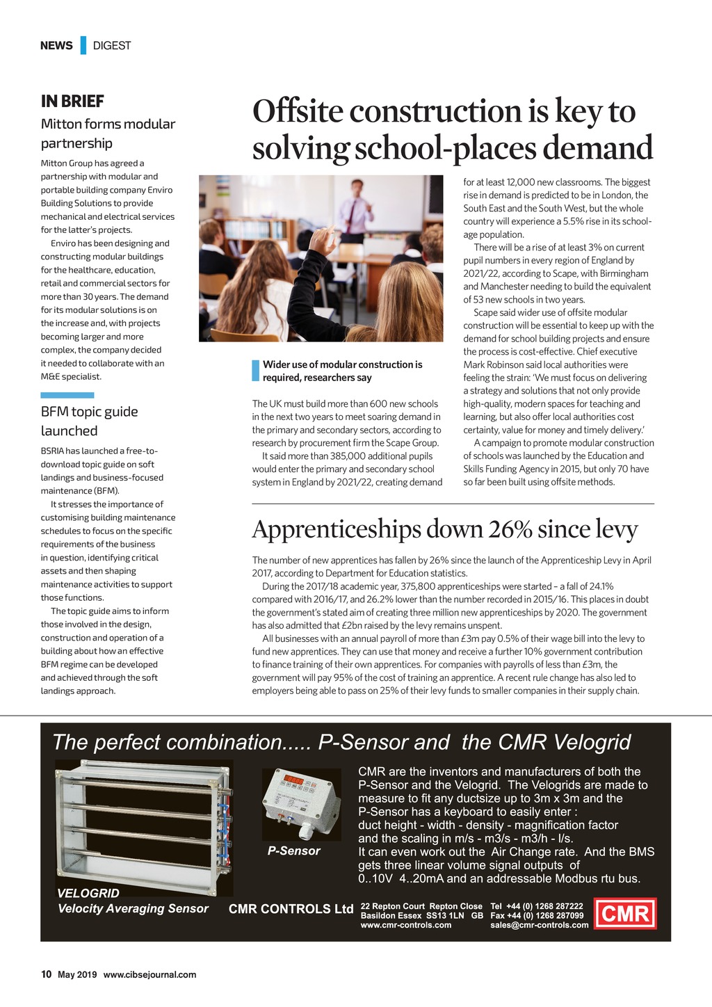 NEWS | DIGEST IN BRIEF Mitton forms modular partnership Mitton Group has agreed a partnership with modular and portable building company Enviro Building Solutions to provide mechanical and electrical services for the latters projects. Enviro has been designing and constructing modular buildings for the healthcare, education, retail and commercial sectors for more than 30 years. The demand for its modular solutions is on the increase and, with projects becoming larger and more complex, the company decided it needed to collaborate with an M&Especialist. BFM topic guide launched BSRIA has launched a free-todownload topic guide on soft landings and business-focused maintenance (BFM). It stresses the importance of customising building maintenance schedules to focus on the specific requirements of the business in question, identifying critical assetsand then shaping maintenance activities to support those functions. The topic guide aims to inform those involved in the design, construction and operation of a building about how an effective BFM regime can be developed and achieved through the soft landingsapproach. Offsite construction is key to solving school-places demand Wider use of modular construction is required, researchers say The UK must build more than 600 new schools in the next two years to meet soaring demand in the primary and secondary sectors, according to research by procurement firm the Scape Group. It said more than 385,000 additional pupils would enter the primary and secondary school system in England by 2021/22, creating demand for at least 12,000 new classrooms. The biggest rise in demand is predicted to be in London, the South East and the South West, but the whole country will experience a 5.5% rise in its schoolage population. There will be a rise of at least 3% on current pupil numbers in every region of England by 2021/22, according to Scape, with Birmingham and Manchester needing to build the equivalent of 53 new schools in two years. Scape said wider use of offsite modular construction will be essential to keep up with the demand for school building projects and ensure the process is cost-effective. Chief executive Mark Robinson said local authorities were feeling the strain: We must focus on delivering a strategy and solutions that not only provide high-quality, modern spaces for teaching and learning, but also offer local authorities cost certainty, value for money and timely delivery. A campaign to promote modular construction of schools was launched by the Education and Skills Funding Agency in 2015, but only 70 have so far been built using offsite methods. Apprenticeships down 26% since levy The number of new apprentices has fallen by 26% since the launch of the Apprenticeship Levy in April 2017, according to Department for Education statistics. During the 2017/18 academic year, 375,800 apprenticeships were started a fall of 24.1% compared with 2016/17, and 26.2% lower than the number recorded in 2015/16. This places in doubt the governments stated aim of creating three million new apprenticeships by 2020. The government has also admitted that 2bn raised by the levy remains unspent. All businesses with an annual payroll of more than 3m pay 0.5% of their wage bill into the levy to fund new apprentices. They can use that money and receive a further 10% government contribution to finance training of their own apprentices. For companies with payrolls of less than 3m, the government will pay 95% of the cost of training an apprentice. A recent rule change has also led to employers being able to pass on 25% of their levy funds to smaller companies in their supply chain. 10 May 2019 www.cibsejournal.com CIBSE May19 pp10 News.indd 10 26/04/2019 16:56