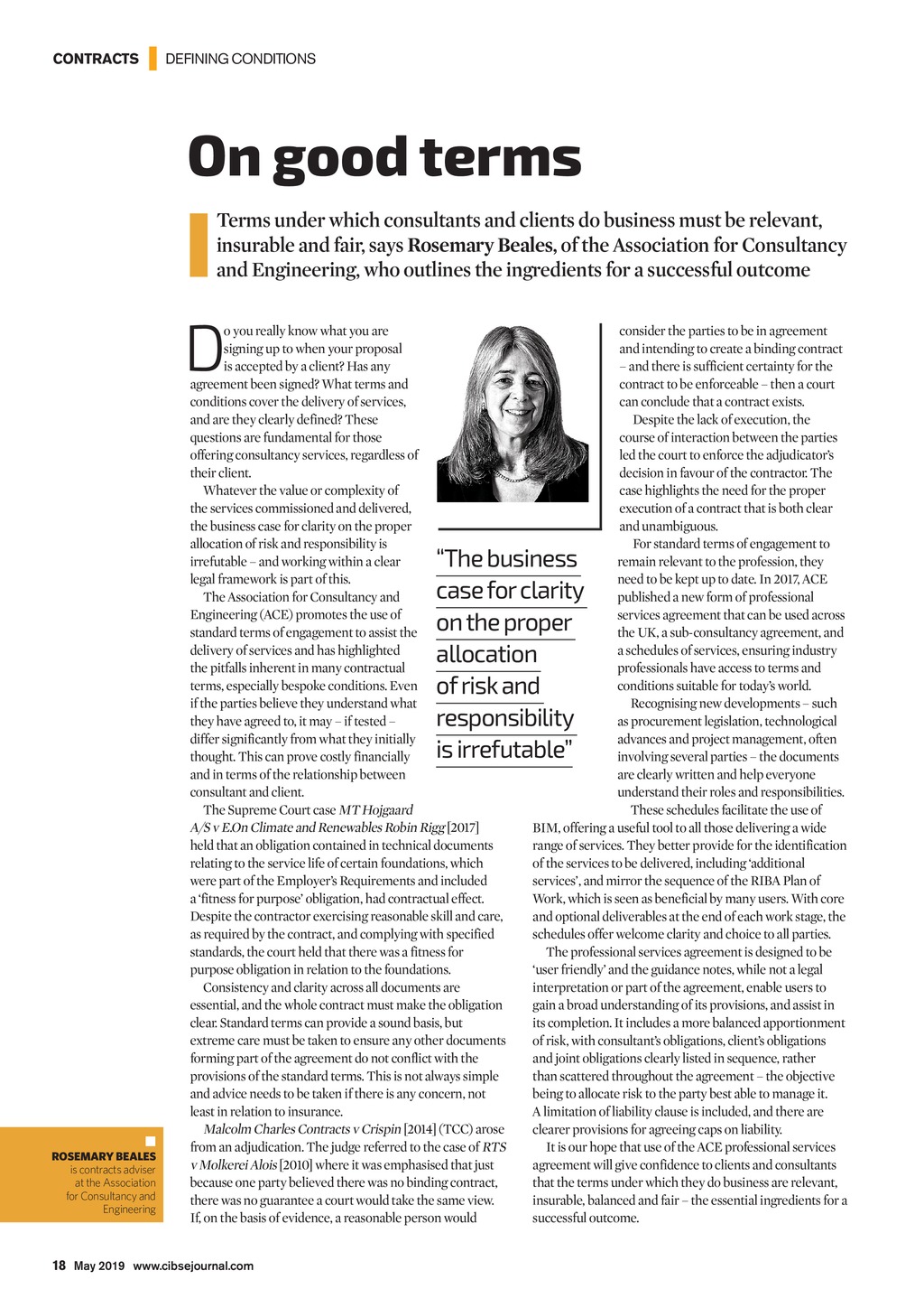 CONTRACTS | DEFINING CONDITIONS On good terms Terms under which consultants and clients do business must be relevant, insurable and fair, says Rosemary Beales, of the Association for Consultancy and Engineering, who outlines the ingredients for a successful outcome D o you really know what you are signing up to when your proposal is accepted by a client? Has any agreement been signed? What terms and conditions cover the delivery of services, and are they clearly defined? These questions are fundamental for those offering consultancy services, regardless of their client. Whatever the value or complexity of the services commissioned and delivered, the business case for clarity on the proper allocation of risk and responsibility is irrefutable and working within a clear legal framework is part of this. The Association for Consultancy and Engineering (ACE) promotes the use of standard terms of engagement to assist the delivery of services and has highlighted the pitfalls inherent in many contractual terms, especially bespoke conditions. Even if the parties believe they understand what they have agreed to, it may if tested differ significantly from what they initially thought. This can prove costly financially and in terms of the relationship between consultant and client. The Supreme Court case MT Hojgaard A/S v E.On Climate and Renewables Robin Rigg [2017] held that an obligation contained in technical documents relating to the service life of certain foundations, which were part of the Employers Requirements and included a fitness for purpose obligation, had contractual effect. Despite the contractor exercising reasonable skill and care, as required by the contract, and complying with specified standards, the court held that there was a fitness for purpose obligation in relation to the foundations. Consistency and clarity across all documents are essential, and the whole contract must make the obligation clear. Standard terms can provide a sound basis, but extreme care must be taken to ensure any other documents forming part of the agreement do not conflict with the provisions of the standard terms. This is not always simple and advice needs to be taken if there is any concern, not least in relation to insurance. Malcolm Charles Contracts v Crispin [2014] (TCC) arose from an adjudication. The judge referred to the case of RTS v Molkerei Alois [2010] where it was emphasised that just because one party believed there was no binding contract, there was no guarantee a court would take the same view. If, on the basis of evidence, a reasonable person would consider the parties to be in agreement and intending to create a binding contract and there is sufficient certainty for the contract to be enforceable then a court can conclude that a contract exists. Despite the lack of execution, the course of interaction between the parties led the court to enforce the adjudicators decision in favour of the contractor. The case highlights the need for the proper execution of a contract that is both clear and unambiguous. For standard terms of engagement to remain relevant to the profession, they need to be kept up to date. In 2017, ACE published a new form of professional services agreement that can be used across the UK, a sub-consultancy agreement, and a schedules of services, ensuring industry professionals have access to terms and conditions suitable for todays world. Recognising new developments such as procurement legislation, technological advances and project management, often involving several parties the documents are clearly written and help everyone understand their roles and responsibilities. These schedules facilitate the use of BIM, offering a useful tool to all those delivering a wide range of services. They better provide for the identification of the services to be delivered, including additional services, and mirror the sequence of the RIBA Plan of Work, which is seen as beneficial by many users. With core and optional deliverables at the end of each work stage, the schedules offer welcome clarity and choice to all parties. The professional services agreement is designed to be user friendly and the guidance notes, while not a legal interpretation or part of the agreement, enable users to gain a broad understanding of its provisions, and assist in its completion. It includes a more balanced apportionment of risk, with consultants obligations, clients obligations and joint obligations clearly listed in sequence, rather than scattered throughout the agreement the objective being to allocate risk to the party best able to manage it. A limitation of liability clause is included, and there are clearer provisions for agreeing caps on liability. It is our hope that use of the ACE professional services agreement will give confidence to clients and consultants that the terms under which they do business are relevant, insurable, balanced and fair the essential ingredients for a successful outcome. The business case for clarity on the proper allocation of risk and responsibility is irrefutable ROSEMARY BEALES is contracts adviser at the Association for Consultancy and Engineering 18 May 2019 www.cibsejournal.com CIBSE May19 pp18 Rosemary Beales.indd 18 26/04/2019 16:59