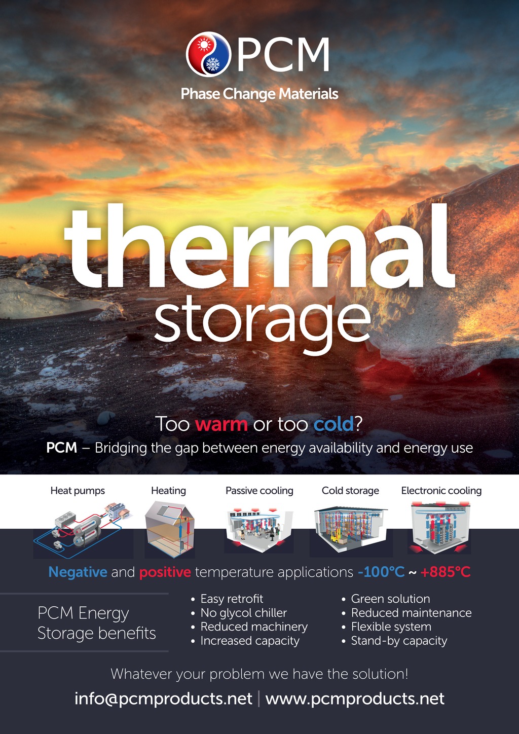 Phase Change Materials thermal storage Too warm or too cold? PCM Bridging the gap between energy availability and energy use Heat pumps Heating Passive cooling Cold storage Electronic cooling Negative and positive temperature applications -100C ~ +885C PCM Energy Storage benets Easy retrot No glycol chiller Reduced machinery Increased capacity Green solution Reduced maintenance Flexible system Stand-by capacity Whatever your problem we have the solution! info@pcmproducts.net | www.pcmproducts.net 44 May 2019 www.cibsejournal.com p44.CIBSEMagMAY19.indd 44 23/04/2019 13:34