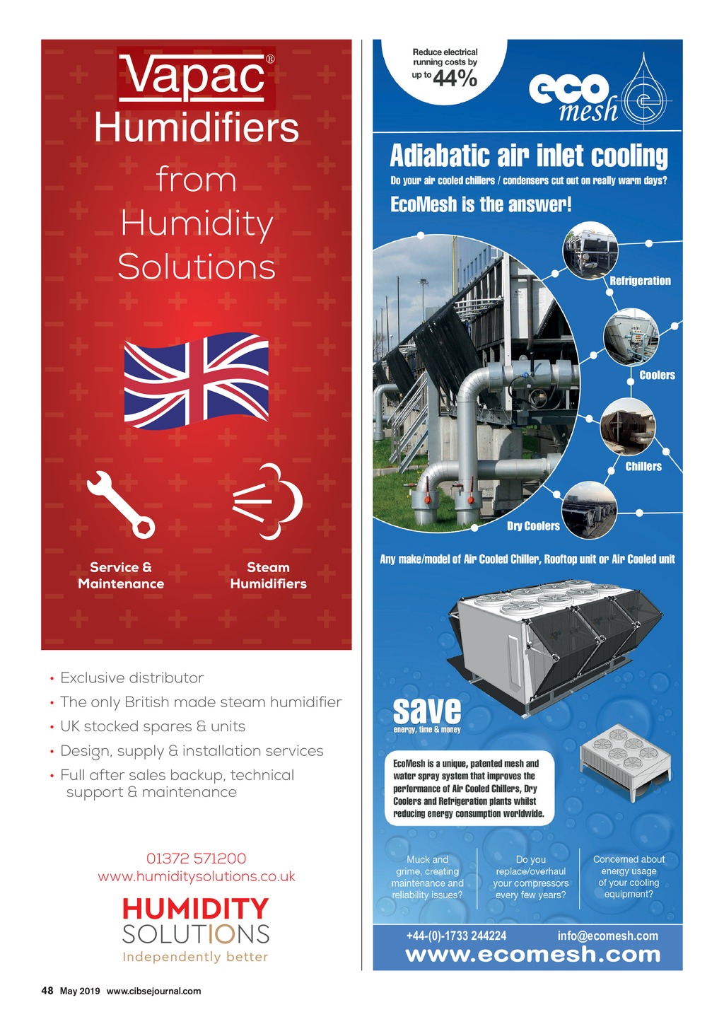 +XPLGLHUV from Humidity Solutions Refrigeration Coolers Chillers Dry Coolers Service & Maintenance Steam Humidifiers Exclusive distributor The only British made steam humidifier UK stocked spares & units Design, supply & installation services Full after sales backup, technical support & maintenance 01372 571200 www.humiditysolutions.co.uk +44-(0)-1733 244224 info@ecomesh.FRP 48 May 2019 www.cibsejournal.com p48.CIBSEMagMAY19.indd 48 23/04/2019 14:31