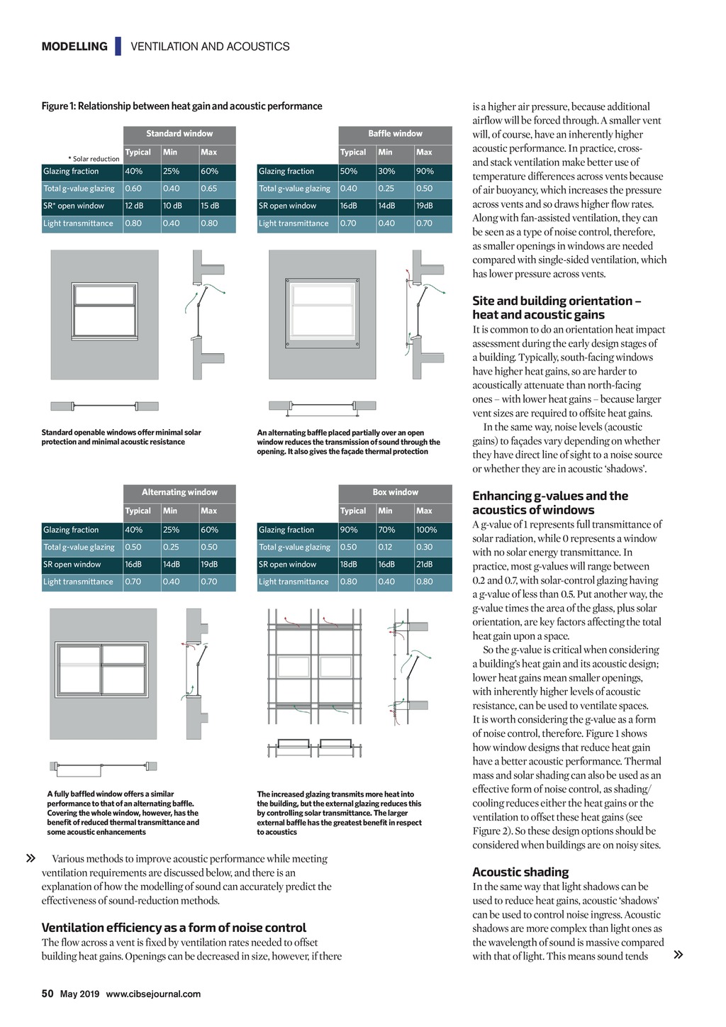 MODELLING | VENTILATION AND ACOUSTICS Figure 1: Relationship between heat gain and acoustic performance Standard window * Solar reduction Glazing fraction Typical Min Max 40% 25% 60% Baffle window Glazing fraction Typical Min Max 50% 30% 90% Total g-value glazing 0.60 0.40 0.65 Total g-value glazing 0.40 0.25 0.50 SR* open window 12 dB 10 dB 15 dB SR open window 16dB 14dB 19dB Light transmittance 0.80 0.40 0.80 Light transmittance 0.70 0.40 0.70 is a higher air pressure, because additional airflow will be forced through. A smaller vent will, of course, have an inherently higher acoustic performance. In practice, crossand stack ventilation make better use of temperature differences across vents because of air buoyancy, which increases the pressure across vents and so draws higher flow rates. Along with fan-assisted ventilation, they can be seen as a type of noise control, therefore, as smaller openings in windows are needed compared with single-sided ventilation, which has lower pressure across vents. Site and building orientation heat and acoustic gains Standard openable windows offer minimal solar protection and minimal acoustic resistance An alternating baffle placed partially over an open window reduces the transmission of sound through the opening. It also gives the faade thermal protection Alternating window Typical Min Max Glazing fraction 40% 25% 60% Total g-value glazing 0.50 0.25 0.50 Box window Typical Min Max Glazing fraction 90% 70% 100% Total g-value glazing 0.50 0.12 0.30 SR open window 16dB 14dB 19dB SR open window 18dB 16dB 21dB Light transmittance 0.70 0.40 0.70 Light transmittance 0.80 0.40 0.80 A fully baffled window offers a similar performance to that of an alternating baffle. Covering the whole window, however, has the benefit of reduced thermal transmittance and some acoustic enhancements The increased glazing transmits more heat into the building, but the external glazing reduces this by controlling solar transmittance. The larger external baffle has the greatest benefit in respect to acoustics Various methods to improve acoustic performance while meeting ventilation requirements are discussed below, and there is an explanation of how the modelling of sound can accurately predict the effectiveness of sound-reduction methods. Ventilation efficiency as a form of noise control The flow across a vent is fixed by ventilation rates needed to offset building heat gains. Openings can be decreased in size, however, if there It is common to do an orientation heat impact assessment during the early design stages of a building. Typically, south-facing windows have higher heat gains, so are harderto acoustically attenuate than north-facing ones with lower heat gains because larger vent sizes are required to offsite heat gains. In the same way, noise levels (acoustic gains) to faades vary depending on whether they have direct line of sight to a noise source or whether they are in acoustic shadows. Enhancing g-values and the acoustics of windows A g-value of 1 represents full transmittance of solar radiation, while 0 represents a window with no solar energy transmittance. In practice, most g-values will range between 0.2 and 0.7, with solar-control glazing having a g-value of less than 0.5. Put another way, the g-value times the area of the glass, plus solar orientation, are key factors affecting the total heat gain upon a space. So the g-value is critical when considering a buildings heat gain and its acoustic design; lower heat gains mean smaller openings, with inherently higher levels of acoustic resistance, can be used to ventilate spaces. It is worth considering the g-value as a form of noise control, therefore. Figure 1 shows how window designs that reduce heat gain have a better acoustic performance. Thermal mass and solar shading can also be used as an effective form of noise control, as shading/ cooling reduces either the heat gains or the ventilation to offset these heat gains (see Figure 2). So these design options should be considered when buildings are on noisy sites. Acoustic shading In the same way that light shadows can be used to reduce heat gains, acoustic shadows can be used to control noise ingress. Acoustic shadows are more complex than light ones as the wavelength of sound is massive compared with that of light. This means sound tends 50 May 2019 www.cibsejournal.com CIBSE May19 pp49-50, 52 Acoustics ventilation modelling.indd 50 26/04/2019 17:13