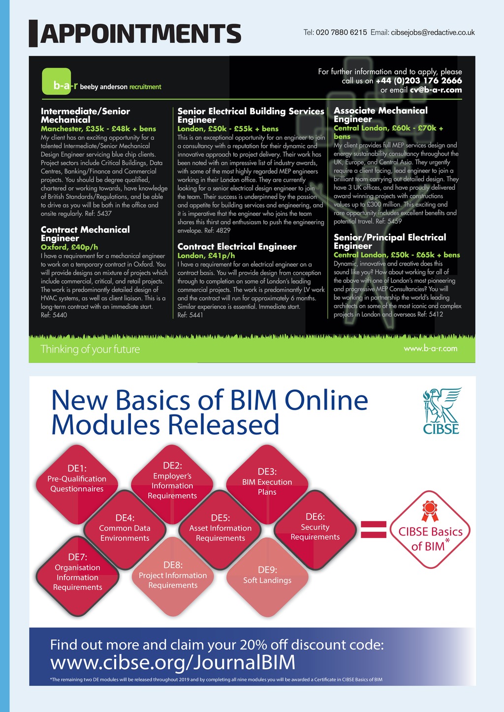 APPOINTMENTS Tel: 020 7880 6215 Email: cibsejobs@redactive.co.uk New Basics of BIM Online Modules Released DE2: DE1: Pre-Qualification Questionnaires DE4: DE7: BIM Execution Plans DE6: DE5: Common Data Environments Organisation Information Requirements DE3: Employers Information Requirements Security Requirements Asset Information Requirements DE8: Project Information Requirements = CIBSE Basics of BIM* DE9: Soft Landings Find out more and claim your 20% off discount code: www.cibse.org/JournalBIM *The remaining two DE modules will be released throughout 2019 and by completing all nine modules you will be awarded a Certificate in CIBSE Basics of BIM 64 May 2019 www.cibsejournal.com p64.CIBSEMagMAY19.indd 64 26/04/2019 07:55