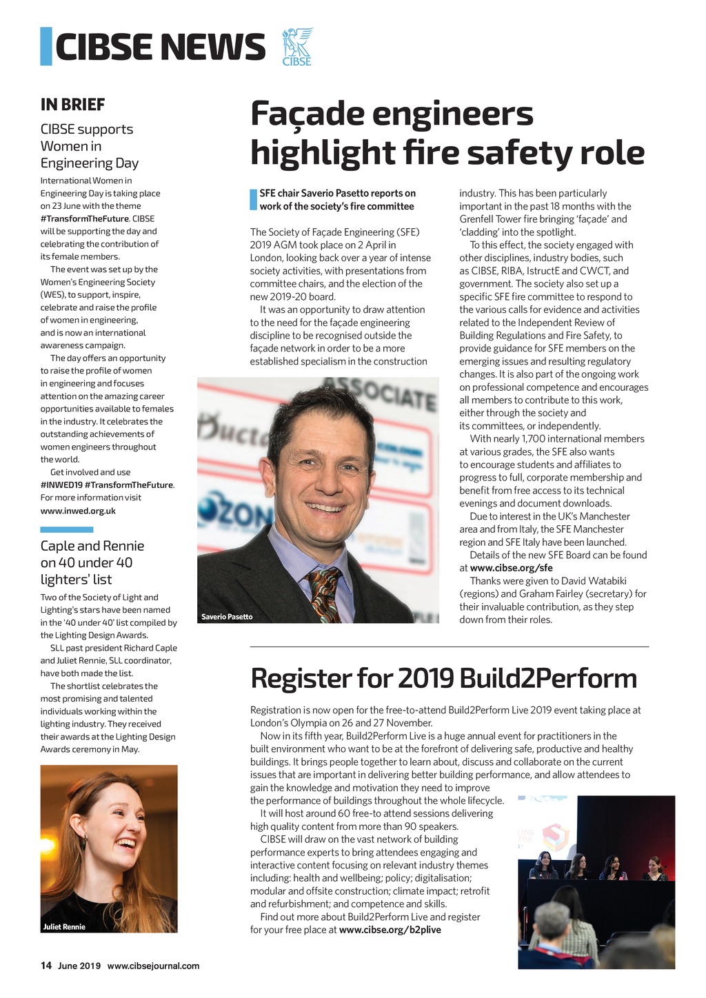 CIBSE NEWS IN BRIEF CIBSE supports Women in Engineering Day International Women in Engineering Day is taking place on 23 June with the theme #TransformTheFuture. CIBSE will be supporting the day and celebrating the contribution of its female members. The event was set up by the Womens Engineering Society (WES), to support, inspire, celebrate and raise the profile of women in engineering, and is now an international awarenesscampaign. The day offers an opportunity to raise the profile of women in engineering and focuses attention on the amazing career opportunities available to females in the industry. It celebrates the outstanding achievements of women engineers throughout the world. Get involved and use #INWED19 #TransformTheFuture. For more information visit www.inwed.org.uk Faade engineers highlight fire safety role SFE chair Saverio Pasetto reports on workof the societys fire committee The Society of Faade Engineering (SFE) 2019 AGM took place on 2 April in London, looking back over a year of intense society activities, with presentations from committee chairs, and the election of the new 2019-20 board. It was an opportunity to draw attention to the need for the faade engineering discipline to be recognised outside the faade network in order to be a more established specialism in the construction Caple and Rennie on 40 under 40 lighters list Two of the Society of Light and Lightings stars have been named in the 40 under 40 list compiled by the Lighting Design Awards. SLL past president Richard Caple and Juliet Rennie, SLL coordinator, have both made the list. The shortlist celebrates the most promising and talented individuals working within the lighting industry. They received their awards at the Lighting Design Awards ceremony in May. Juliet Rennie Saverio Pasetto industry. This has been particularly important in the past 18 months with the Grenfell Tower fire bringing faade and cladding into the spotlight. To this effect, the society engaged with other disciplines, industry bodies, such as CIBSE, RIBA, IstructE and CWCT, and government. The society also set up a specific SFE fire committee to respond to the various calls for evidence and activities related to the Independent Review of Building Regulations and Fire Safety, to provide guidance for SFE members on the emerging issues and resulting regulatory changes. It is also part of the ongoing work on professional competence and encourages all members to contribute to this work, either through the society and its committees, or independently. With nearly 1,700 international members at various grades, the SFE also wants to encourage students and affiliates to progress to full, corporate membership and benefit from free access to its technical evenings and document downloads. Due to interest in the UKs Manchester area and from Italy, the SFE Manchester region and SFE Italy have been launched. Details of the new SFE Board can be found at www.cibse.org/sfe Thanks were given to David Watabiki (regions) and Graham Fairley (secretary) for their invaluable contribution, as they step down from their roles. Register for 2019 Build2Perform Registration is now open for the free-to-attend Build2Perform Live 2019 event taking place at Londons Olympia on 26 and 27 November. Now in its fifth year, Build2Perform Live is a huge annual event for practitioners in the built environment who want to be at the forefront of delivering safe, productive and healthy buildings. It brings people together to learn about, discuss and collaborate on the current issues that are important in delivering better building performance, and allow attendees to gain the knowledge and motivation they need to improve the performance of buildings throughout the whole lifecycle. It will host around 60 free-to attend sessions delivering high quality content from more than 90 speakers. CIBSE will draw on the vast network of building performance experts to bring attendees engaging and interactive content focusing on relevant industry themes including: health and wellbeing; policy; digitalisation; modular and offsite construction; climate impact; retrofit and refurbishment; and competence and skills. Find out more about Build2Perform Live and register for your free place at www.cibse.org/b2plive 14 June 2019 www.cibsejournal.com CIBSE Jun19 pp14-16 CIBSE News.indd 14 24/05/2019 18:54