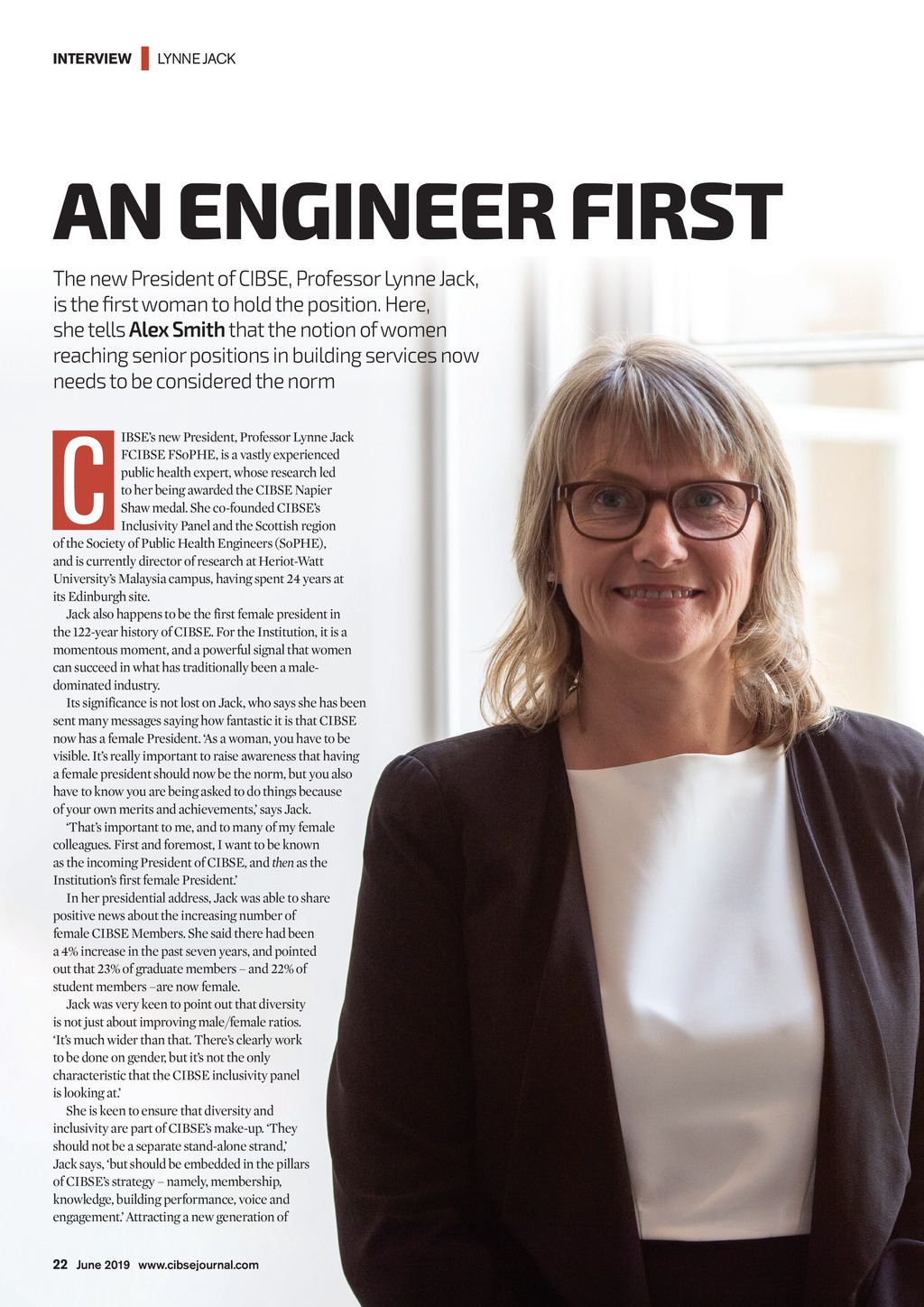INTERVIEW | LYNNE JACK AN ENGINEER FIRST The new President of CIBSE, Professor Lynne Jack, is the first woman to hold the position. Here, she tells Alex Smith that the notion of women reaching senior positions in building services now needs to be considered the norm C IBSEs new President, Professor Lynne Jack FCIBSE FSoPHE, is a vastly experienced public health expert, whose research led to her being awarded the CIBSE Napier Shaw medal. She co-founded CIBSEs Inclusivity Panel and the Scottish region of the Society of Public Health Engineers (SoPHE), and is currently director of research at Heriot-Watt Universitys Malaysia campus, having spent 24 years at its Edinburgh site. Jack also happens to be the first female president in the 122-year history of CIBSE. For the Institution, it is a momentous moment, and a powerful signal that women can succeed in what has traditionally been a maledominated industry. Its significance is not lost on Jack, who says she has been sent many messages saying how fantastic it is that CIBSE now has a female President. As a woman, you have to be visible. Its really important to raise awareness that having a female president should now be the norm, but you also have to know you are being asked to do things because of your own merits and achievements, says Jack. Thats important to me, and to many of my female colleagues. First and foremost, I want to be known as the incoming President of CIBSE, and then as the Institutions first female President. In her presidential address, Jack was able to share positive news about the increasing number of female CIBSE Members. She said there had been a 4% increase in the past seven years, and pointed out that 23% of graduate members and 22% of student members are now female. Jack was very keen to point out that diversity is not just about improving male/female ratios. Its much wider than that. Theres clearly work to be done on gender, but its not the only characteristic that the CIBSE inclusivity panel is looking at. She is keen to ensure that diversity and inclusivity are part of CIBSEs make-up. They should not be a separate stand-alone strand, Jack says, but should be embedded in the pillars of CIBSEs strategy namely, membership, knowledge, building performance, voice and engagement. Attracting a new generation of 22 June 2019 www.cibsejournal.com CIBSE Jun19 pp22-23 Lynne Jack.indd 22 24/05/2019 16:14