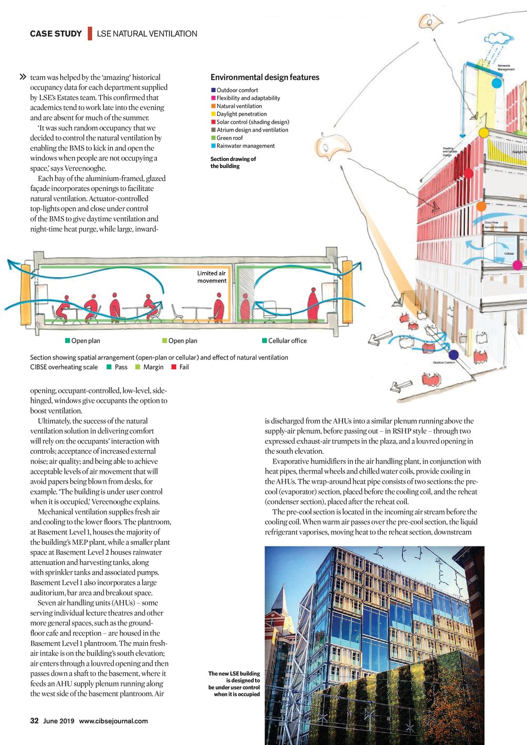 CASE STUDY | LSE NATURAL VENTILATION team was helped by the amazing historical occupancy data for each department supplied by LSEs Estates team. This confirmed that academics tend to work late into the evening and are absent for much of the summer. It was such random occupancy that we decided to control the natural ventilation by enabling the BMS to kick in and open the windows when people are not occupying a space, says Vereenooghe. Each bay of the aluminium-framed, glazed faade incorporates openings to facilitate natural ventilation. Actuator-controlled top-lights open and close under control oftheBMSto give daytime ventilation and night-time heat purge, while large, inward- Open plan Environmental design features Outdoor comfort Flexibility and adaptability Natural ventilation Daylight penetration Solar control (shading design) Atrium design and ventilation Green roof Rainwater management Section drawing of thebuilding Open plan Cellular office Section showing spatial arrangement (open-plan or cellular) and effect of natural ventilation CIBSE overheating scale Pass Margin Fail opening, occupant-controlled, low-level, sidehinged, windows give occupants the option to boost ventilation. Ultimately, the success of the natural ventilation solution in delivering comfort will rely on: the occupants interaction with controls; acceptance of increased external noise; air quality; and being able to achieve acceptable levels of air movement that will avoid papers being blown from desks, for example. The building is under user control when it is occupied, Vereenooghe explains. Mechanical ventilation supplies fresh air and cooling to the lower floors. The plantroom, at Basement Level 1, houses the majority of the buildings MEP plant, while a smaller plant space at Basement Level 2 houses rainwater attenuation and harvesting tanks, along with sprinkler tanks and associated pumps. Basement Level 1 also incorporates a large auditorium, bar area and breakout space. Seven air handling units (AHUs) some serving individual lecture theatres and other more general spaces, such as the groundfloor cafe and reception are housed in the Basement Level 1 plantroom. The main freshair intake is on the buildings south elevation; air enters through a louvred opening and then passes down a shaft to the basement, where it feeds an AHU supply plenum running along the west side of the basement plantroom. Air is discharged from the AHUs into a similar plenum running above the supply-air plenum, before passing out in RSHP style through two expressed exhaust-air trumpets in the plaza, and a louvred opening in the south elevation. Evaporative humidifiers in the air handling plant, in conjunction with heat pipes, thermal wheels and chilled water coils, provide cooling in the AHUs. The wrap-around heat pipe consists of two sections: the precool (evaporator) section, placed before the cooling coil, and the reheat (condenser section), placed after the reheat coil. The pre-cool section is located in the incoming air stream before the cooling coil. When warm air passes over the pre-cool section, the liquid refrigerant vaporises, moving heat to the reheat section, downstream The new LSE building is designed to beunderuser control when it is occupied 32 June 2019 www.cibsejournal.com CIBSE Jun19 pp30-33 LSE.indd 32 24/05/2019 18:58