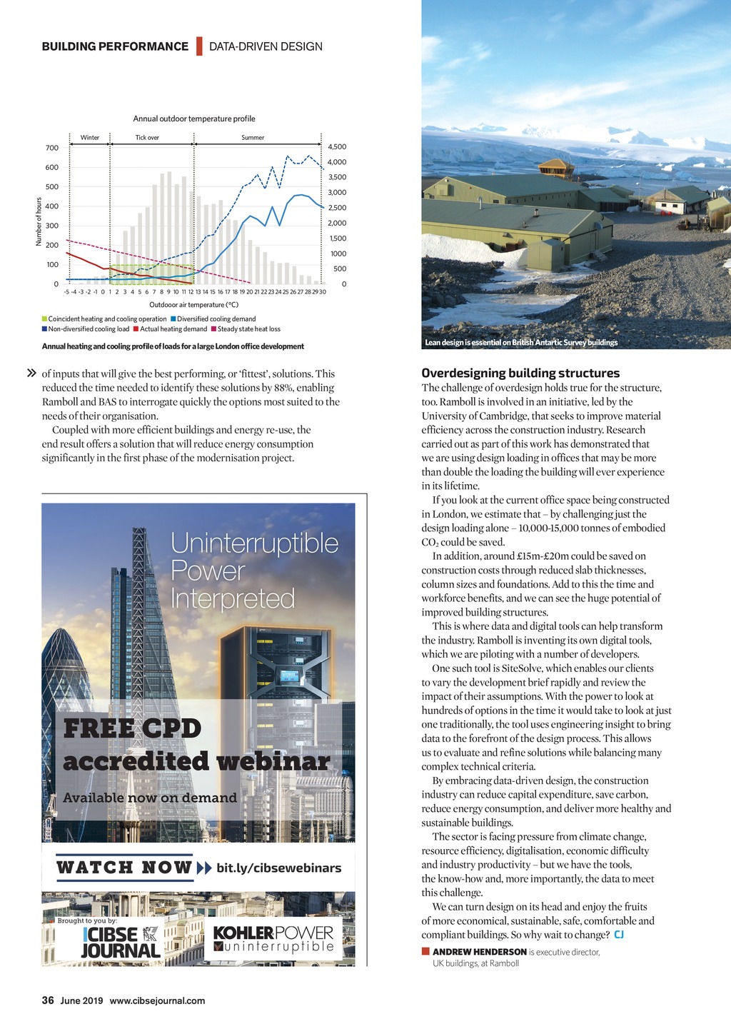 BUILDING PERFORMANCE | DATA-DRIVEN DESIGN Annual outdoor temperature profile Winter Tick over Summer 4,500 700 4,000 600 3,500 Number of hours 500 3,000 400 2,500 300 2,000 1,500 200 1000 100 500 0 0 -5 -4 -3 -2 -1 0 1 2 3 4 5 6 7 8 9 10 11 12 13 14 15 16 17 18 19 20 21 22 23 24 25 26 27 28 29 30 Outdooor air temperature (C) Coincident heating and cooling operation Diversified cooling demand Non-diversified cooling load Actual heating demand Steady state heat loss Annual heating and cooling profile of loads for a large London office development of inputs that will give the best performing, or fittest, solutions. This reduced the time needed to identify these solutions by 88%, enabling Ramboll and BAS to interrogate quickly the options most suited to the needs of their organisation. Coupled with more efficient buildings and energy re-use, the end result offers a solution that will reduce energy consumption significantly in the first phase of the modernisation project. Uninterruptible Power Interpreted FREE CPD accredited webinar Available now on demand WAT C H N O W Brought to you by: CIBSE JOURNAL bit.ly/cibsewebinars Lean design is essential on British Antartic Survey buildings Overdesigning building structures The challenge of overdesign holds true for the structure, too. Ramboll is involved in an initiative, led by the University of Cambridge, that seeks to improve material efficiency across the construction industry. Research carried out as part of this work has demonstrated that weare using design loading in offices that may be more than double the loading the building will ever experience in its lifetime. If you look at the current office space being constructed in London, we estimate that by challenging just the design loading alone 10,000-15,000 tonnes of embodied CO2 could be saved. In addition, around 15m-20m could be saved on construction costs through reduced slab thicknesses, column sizes and foundations. Add to this the time and workforce benefits, and we can see the huge potential of improved building structures. This is where data and digital tools can help transform the industry. Ramboll is inventing its own digital tools, which we are piloting with a number of developers. One such tool is SiteSolve, which enables our clients tovary the development brief rapidly and review the impact of their assumptions. With the power to look at hundreds of options in the time it would take to look at just one traditionally, the tool uses engineering insight to bring data to the forefront of the design process. This allows us to evaluate and refine solutions while balancing many complex technical criteria. By embracing data-driven design, the construction industry can reduce capital expenditure, save carbon, reduce energy consumption, and deliver more healthy and sustainable buildings. The sector is facing pressure from climate change, resource efficiency, digitalisation, economic difficulty andindustry productivity but we have the tools, theknow-how and, more importantly, the data to meet this challenge. We can turn design on its head and enjoy the fruits of more economical, sustainable, safe, comfortable and compliant buildings. So why wait to change? CJ ANDREW HENDERSON is executive director, UK buildings, atRamboll 36 June 2019 www.cibsejournal.com CIBSE Jun19 pp34-36 Ramboll.indd 36 24/05/2019 19:01