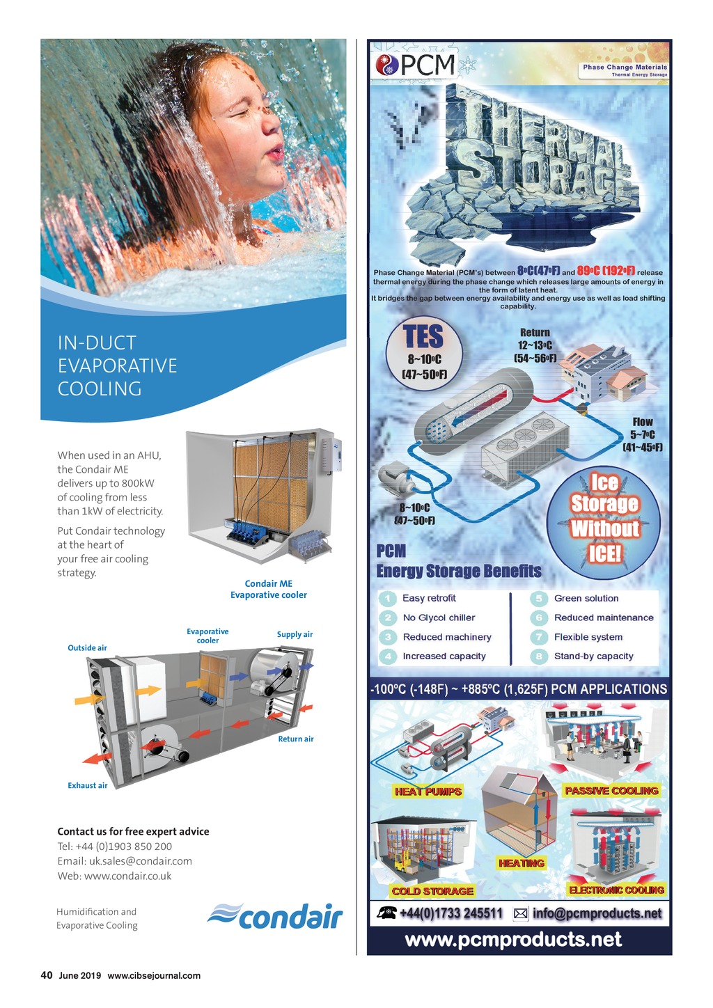 Phase Change Material (PCMs) between and release thermal energy during the phase change which releases large amounts of energy in the form of latent heat. It bridges the gap between energy availability and energy use as well as load shifting capability. IN-DUCT EVAPORATIVE COOLING 8~100C (47~500F) Return 12~130C (54~560F) Flow 5~70C (41~450F) When used in an AHU, the Condair ME delivers up to 800kW of cooling from less than 1kW of electricity. 8~100C (47~500F) Put Condair technology at the heart of your free air cooling strategy. Condair ME Evaporative cooler Outside air Evaporative cooler Supply air Return air Exhaust air Contact us for free expert advice Tel: +44 (0)1903 850 200 Email: uk.sales@condair.com Web: www.condair.co.uk Humidification and Evaporative Cooling +44(0)1733 245511 info@pcmproducts.net www.pcmproducts.net 40 June 2019 www.cibsejournal.com p40.CIBSEMagJUN19.indd 40 21/05/2019 12:29