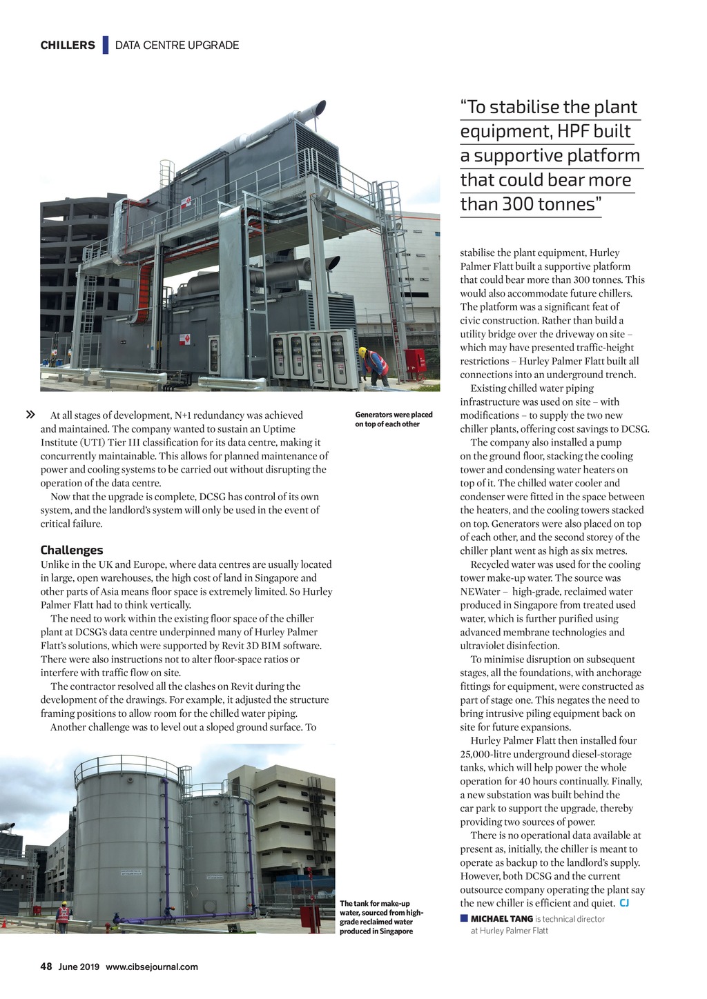 CHILLERS | DATA CENTRE UPGRADE To stabilise the plant equipment, HPF built a supportive platform that could bear more than 300 tonnes At all stages of development, N+1 redundancy was achieved and maintained. The company wanted to sustain an Uptime Institute (UTI) Tier III classification for its data centre, making it concurrently maintainable. This allows for planned maintenance of power and cooling systems tobe carried out without disrupting the operation of the data centre. Now that the upgrade is complete, DCSG has control of its own system, and the landlords system will only be used in the event of critical failure. Generators were placed on top of each other Challenges Unlike in the UK and Europe, where data centres are usually located in large, open warehouses, the high cost of land in Singapore and other parts of Asia means floor space is extremely limited. So Hurley Palmer Flatt had to think vertically. The need to work within the existing floor space of the chiller plant at DCSGs data centre underpinned many of Hurley Palmer Flatts solutions, which were supported by Revit 3D BIM software. There were also instructions not to alter floor-space ratios or interfere with traffic flow on site. The contractor resolved all the clashes on Revit during the development of the drawings. For example, it adjusted the structure framing positions to allow room for the chilled water piping. Another challenge was to level out a sloped ground surface. To The tank for make-up water, sourced from highgrade reclaimed water produced in Singapore stabilise the plant equipment, Hurley Palmer Flatt built a supportive platform that could bear more than 300 tonnes. This would also accommodate future chillers. The platform was a significant feat of civic construction. Rather than build a utility bridge over the driveway on site which may have presented traffic-height restrictions HurleyPalmer Flatt built all connections into an underground trench. Existing chilled water piping infrastructure was used on site with modifications to supply the two new chiller plants, offering cost savings to DCSG. The company also installed a pump on the ground floor, stacking the cooling tower and condensing water heaters on top of it. The chilled water cooler and condenser were fitted in the space between the heaters, and the cooling towers stacked on top. Generators were also placed on top of each other, and the second storey of the chiller plant went as high as six metres. Recycled water was used for the cooling tower make-up water. The source was NEWater high-grade, reclaimed water produced in Singapore from treated used water, which is further purified using advanced membrane technologies and ultraviolet disinfection. To minimise disruption on subsequent stages, all the foundations, with anchorage fittings for equipment, were constructed as part of stage one. This negates the need to bring intrusive piling equipment back on site for future expansions. Hurley Palmer Flatt then installed four 25,000-litre underground diesel-storage tanks, which will help power the whole operation for40 hours continually. Finally, a new substation was built behind the car parkto support the upgrade, thereby providing two sources of power. There is no operational data available at present as, initially, the chiller is meant to operate as backup to the landlords supply. However, both DCSG and the current outsource company operating the plant say the new chiller is efficient and quiet. CJ M ICHAEL TANG is technical director at Hurley Palmer Flatt 48 June 2019 www.cibsejournal.com CIBSE Jun19 pp47-48 DCSG chiller.indd 48 24/05/2019 19:01