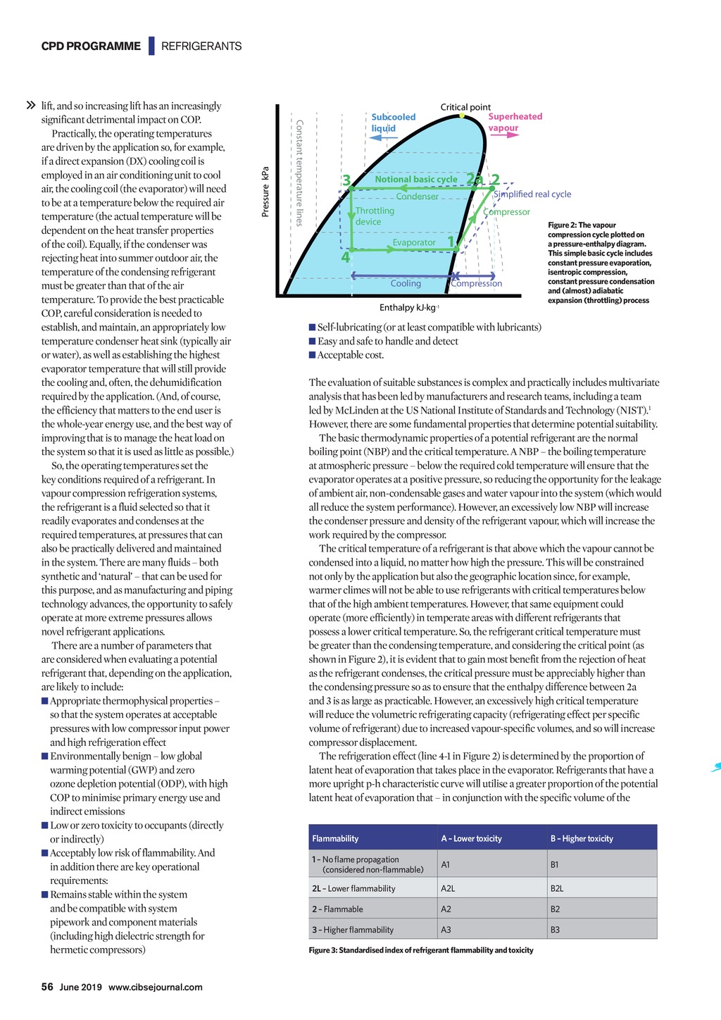| REFRIGERANTS Constant temperature lines lift, and so increasing lift has an increasingly significant detrimental impact on COP. Practically, the operating temperatures are driven by the application so, for example, if a direct expansion (DX) cooling coil is employed in an air conditioning unit to cool air, the cooling coil (the evaporator) will need to be at a temperature below the required air temperature (the actual temperature will be dependent on the heat transfer properties of the coil). Equally, if the condenser was rejecting heat into summer outdoor air, the temperature of the condensing refrigerant must be greater than that of the air temperature. To provide the best practicable COP, careful consideration is needed to establish, and maintain, an appropriately low temperature condenser heat sink (typically air or water), as well as establishing the highest evaporator temperature that will still provide the cooling and, often, the dehumidification required by the application. (And, of course, the efficiency that matters to the end user is the whole-year energy use, and the best way of improving that is to manage the heat load on the system so that it is used as little as possible.) So, the operating temperatures set the key conditions required of a refrigerant. In vapour compression refrigeration systems, the refrigerant is a fluid selected so that it readily evaporates and condenses at the required temperatures, at pressures that can also be practically delivered and maintained in the system. There are many fluids both synthetic and natural that can be used for this purpose, and as manufacturing and piping technology advances, the opportunity to safely operate at more extreme pressures allows novel refrigerant applications. There are a number of parameters that are considered when evaluating a potential refrigerant that, depending on the application, are likely to include: Appropriate thermophysical properties so that the system operates at acceptable pressures with low compressor input power and high refrigeration effect Environmentally benign low global warming potential (GWP) and zero ozonedepletion potential (ODP), with high COP to minimise primary energy use and indirect emissions Low or zero toxicity to occupants (directly or indirectly) Acceptably low risk of flammability. And in addition there are key operational requirements: Remains stable within the system and be compatible with system pipework and component materials (including high dielectric strength for hermeticcompressors) Pressure kPa CPD PROGRAMME Subcooled liquid 3 Critical point Superheated vapour Notional basic cycle 2a 2 Condenser Throttling device 4 Evaporator Compressor 1 Compression Cooling Enthalpy kJkg-1 Figure 2: The vapour compression cycle plotted on a pressure-enthalpy diagram. This simple basic cycle includes constant pressure evaporation, isentropic compression, constant pressure condensation and (almost) adiabatic expansion (throttling) process Self-lubricating (or at least compatible with lubricants) Easy and safe to handle and detect Acceptable cost. The evaluation of suitable substances is complex and practically includes multivariate analysis that has been led by manufacturers and research teams, including a team led by McLinden at the US National Institute of Standards and Technology (NIST).1 However, there are some fundamental properties that determine potential suitability. The basic thermodynamic properties of a potential refrigerant are the normal boiling point (NBP) and the critical temperature. A NBP the boiling temperature at atmospheric pressure below the required cold temperature will ensure that the evaporator operates at a positive pressure, so reducing the opportunity for the leakage of ambient air, non-condensable gases and water vapour into the system (which would all reduce the system performance). However, an excessively low NBP will increase the condenser pressure and density of the refrigerant vapour, which will increase the work required by the compressor. The critical temperature of a refrigerant is that above which the vapour cannot be condensed into a liquid, no matter how high the pressure. This will be constrained not only by the application but also the geographic location since, for example, warmer climes will not be able to use refrigerants with critical temperatures below that of the high ambient temperatures. However, that same equipment could operate (more efficiently) in temperate areas with different refrigerants that possess a lower critical temperature. So, the refrigerant critical temperature must be greater than the condensing temperature, and considering the critical point (as shown in Figure 2), it is evident that to gain most benefit from the rejection of heat as the refrigerant condenses, the critical pressure must be appreciably higher than the condensing pressure so as to ensure that the enthalpy difference between 2a and 3 is as large as practicable. However, an excessively high critical temperature will reduce the volumetric refrigerating capacity (refrigerating effect per specific volume of refrigerant) due to increased vapour-specific volumes, and so will increase compressordisplacement. The refrigeration effect (line 4-1 in Figure 2) is determined by the proportion of latent heat of evaporation that takes place in the evaporator. Refrigerants that have a more upright p-h characteristic curve will utilise a greater proportion of the potential latent heat of evaporation that in conjunction with the specific volume of the Flammability A Lower toxicity B Higher toxicity 1 No flame propagation (considered non-flammable) A1 B1 2L Lower flammability A2L B2L 2 Flammable A2 B2 3 Higher flammability A3 B3 Figure 3: Standardised index of refrigerant flammability and toxicity 56 June 2019 www.cibsejournal.com CIBSE Jun19 pp55-58 CPD 146 v4.indd 56 24/05/2019 16:26