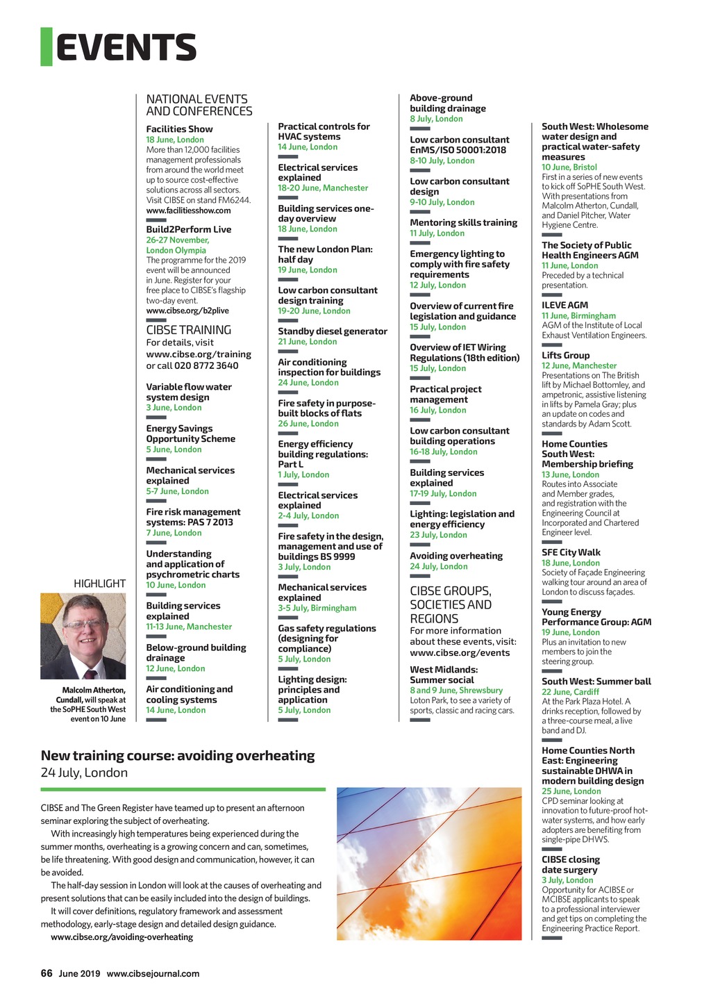 EVENTS NATIONAL EVENTS AND CONFERENCES Facilities Show 18 June, London More than 12,000 facilities management professionals from around the world meet up to source cost-effective solutions across all sectors. Visit CIBSE on stand FM6244. www.facilitiesshow.com Build2Perform Live 26-27 November, LondonOlympia The programme for the 2019 event will be announced in June. Register for your freeplace to CIBSEs flagship two-day event. www.cibse.org/b2plive CIBSE TRAINING For details, visit www.cibse.org/training or call 020 8772 3640 Variable flow water system design 3 June, London Energy Savings Opportunity Scheme 5 June, London Mechanical services explained 5-7 June, London Fire risk management systems: PAS 7 2013 7 June, London HIGHLIGHT Understanding and application of psychrometric charts 10 June, London Building services explained 11-13 June, Manchester Below-ground building drainage 12 June, London Malcolm Atherton, Cundall, will speak at the SoPHE South West event on 10 June Air conditioning and cooling systems 14 June, London Above-ground building drainage Practical controls for HVAC systems 14 June, London Electrical services explained 18-20 June, Manchester Building services oneday overview 18 June, London The new London Plan: half day 19 June, London Low carbon consultant design training 19-20 June, London Standby diesel generator 21 June, London Air conditioning inspection for buildings 24 June, London Fire safety in purposebuilt blocks of flats 26 June, London Energy efficiency building regulations: Part L 8 July, London Low carbon consultant EnMS/ISO 50001:2018 8-10 July, London Low carbon consultant design 9-10 July, London Mentoring skills training 11 July, London Emergency lighting to comply with fire safety requirements 12 July, London Overview of current fire legislation and guidance South West: Wholesome water design and practical water-safety measures 10 June, Bristol First in a series of new events to kick off SoPHE South West. With presentations from Malcolm Atherton, Cundall, and Daniel Pitcher, Water Hygiene Centre. The Society of Public Health Engineers AGM 11 June, London Preceded by a technical presentation. ILEVE AGM 15 July, London 11 June, Birmingham AGM of the Institute of Local Exhaust Ventilation Engineers. Overview of IET Wiring Regulations (18th edition) Lifts Group 15 July, London Practical project management 16 July, London Low carbon consultant building operations 16-18 July, London Building services explained 12 June, Manchester Presentations on The British lift by Michael Bottomley, and ampetronic, assistive listening in lifts by Pamela Gray; plus an update on codes and standards by Adam Scott. Home Counties SouthWest: Membershipbriefing Electrical services explained 17-19 July, London Fire safety in the design, management and use of buildings BS 9999 23 July, London 13 June, London Routes into Associate and Member grades, and registration with the Engineering Council at Incorporated and Chartered Engineer level. Avoiding overheating SFE City Walk CIBSE GROUPS, SOCIETIES AND REGIONS Young Energy Performance Group: AGM 1 July, London 2-4 July, London 3 July, London Mechanical services explained 3-5 July, Birmingham Gas safety regulations (designing for compliance) 5 July, London Lighting design: principles and application 5 July, London New training course: avoiding overheating 24 July, London CIBSE and The Green Register have teamed up to present an afternoon seminar exploring the subject of overheating. With increasingly high temperatures being experienced during the summer months, overheating isa growing concern and can, sometimes, belife threatening. With good design and communication, however, it can be avoided. The half-day session in London will look at the causes of overheating and present solutions that can be easily included into the design of buildings. It will cover definitions, regulatory framework and assessment methodology, early-stage design and detailed design guidance. www.cibse.org/avoiding-overheating Lighting: legislation and energy efficiency 24 July, London For more information about these events, visit: www.cibse.org/events West Midlands: Summer social 8 and 9 June, Shrewsbury Loton Park, to see a variety of sports, classic and racing cars. 18 June, London Society of Faade Engineering walking tour around an area of London to discuss faades. 19 June, London Plus an invitation to new members to join the steeringgroup. South West: Summer ball 22 June, Cardiff At the Park Plaza Hotel. A drinks reception, followed by athree-course meal, a live band and DJ. Home Counties North East: Engineering sustainable DHWA in modern building design 25 June, London CPD seminar looking at innovation to future-proof hotwater systems, and how early adopters are benefiting from single-pipe DHWS. CIBSE closing datesurgery 3 July, London Opportunity for ACIBSE or MCIBSE applicants to speak to a professional interviewer and get tips on completing the Engineering Practice Report. 66 June 2019 www.cibsejournal.com CIBSE Jun19 pp66 Events.indd 66 24/05/2019 16:58