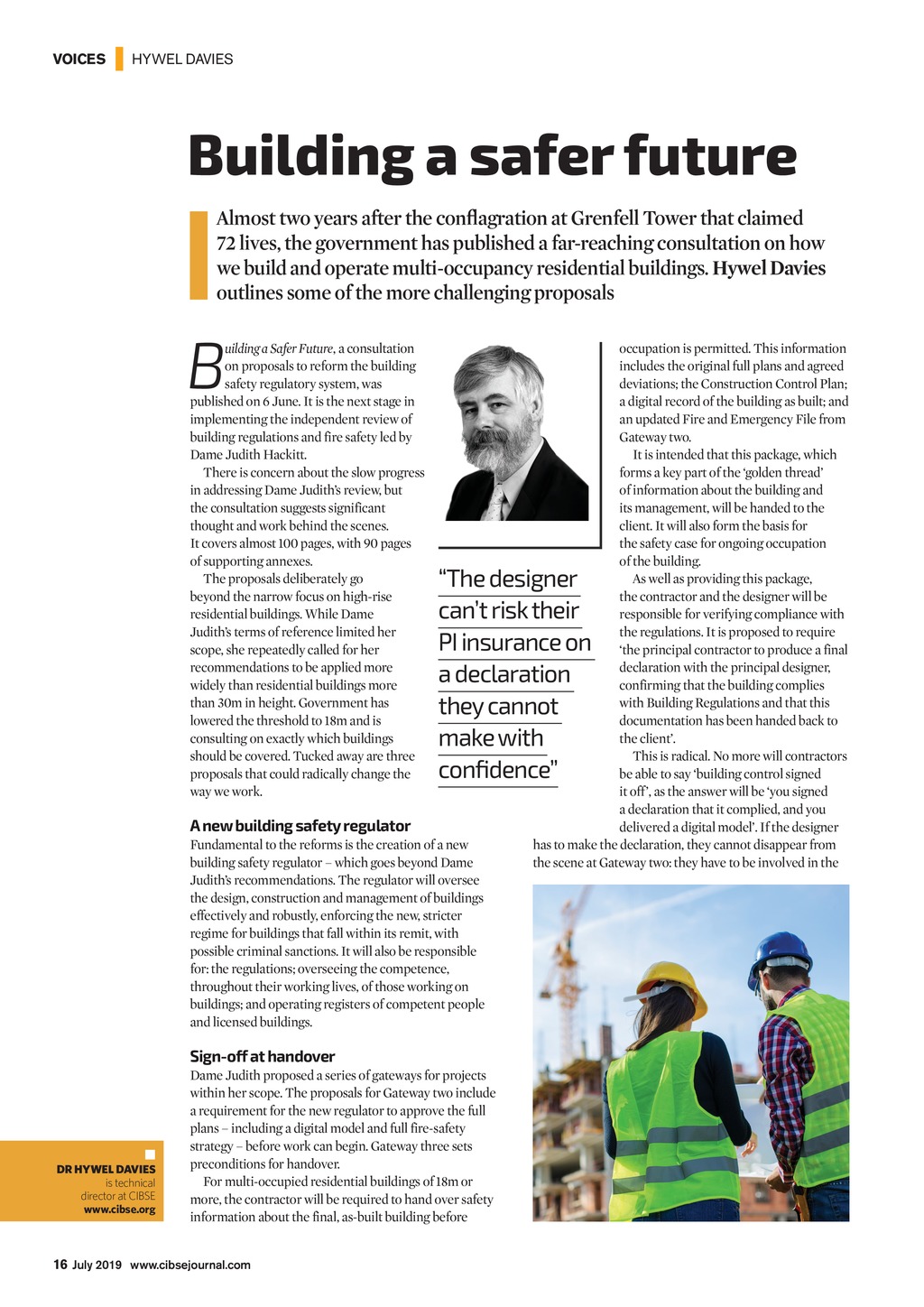 VOICES | HYWEL DAVIES Building a safer future Almost two years after the conflagration at Grenfell Tower that claimed 72lives, the government has published a far-reaching consultation on how we build and operate multi-occupancy residential buildings. Hywel Davies outlines some of the more challenging proposals B uilding a Safer Future, a consultation on proposals to reform the building safety regulatory system, was published on 6 June. It is the next stage in implementing the independent review of building regulations and fire safety led by Dame Judith Hackitt. There is concern about the slow progress in addressing Dame Judiths review, but the consultation suggests significant thought and work behind the scenes. Itcovers almost 100 pages, with 90 pages ofsupporting annexes. The proposals deliberately go beyond the narrow focus on high-rise residential buildings. While Dame Judiths terms of reference limited her scope, she repeatedly called for her recommendations to be applied more widely than residential buildings more than 30m in height. Government has lowered the threshold to 18m and is consulting on exactly which buildings should be covered. Tucked away are three proposals that could radically change the way we work. occupation is permitted. This information includes the original full plans and agreed deviations; the Construction Control Plan; a digital record of the building as built; and an updated Fire and Emergency File from Gateway two. It is intended that this package, which forms a key part of the golden thread ofinformation about the building and itsmanagement, will be handed to the client. It will also form the basis for thesafety case for ongoing occupation ofthe building. As well as providing this package, the contractor and the designer will be responsible for verifying compliance with the regulations. It is proposed to require the principal contractor to produce a final declaration with the principal designer, confirming that the building complies with Building Regulations and that this documentation has been handed back to the client. This is radical. No more will contractors be able to say building control signed it off, as the answer will be you signed a declaration that it complied, and you delivered a digital model. If the designer has to make the declaration, they cannot disappear from the scene at Gateway two: they have to be involved in the The designer cant risk their PI insurance on a declaration they cannot make with confidence A new building safety regulator Fundamental to the reforms is the creation of a new building safety regulator which goes beyond Dame Judiths recommendations. The regulator will oversee the design, construction and management of buildings effectively and robustly, enforcing the new, stricter regimefor buildings that fall within its remit, with possiblecriminal sanctions. It will also be responsible for:the regulations; overseeing the competence, throughout their working lives, of those working on buildings; and operating registers of competent people and licensed buildings. Sign-off at handover DR HYWEL DAVIES is technical director at CIBSE www.cibse.org Dame Judith proposed a series of gateways for projects within her scope. The proposals for Gateway two include a requirement for the new regulator to approve the full plans including a digital model and full fire-safety strategy before work can begin. Gateway three sets preconditions for handover. For multi-occupied residential buildings of 18m or more, the contractor will be required to hand over safety information about the final, as-built building before 16 July 2019 www.cibsejournal.com CIBSE July19 pp16-17 Hywel Davies / Patrons.indd 16 21/06/2019 14:42