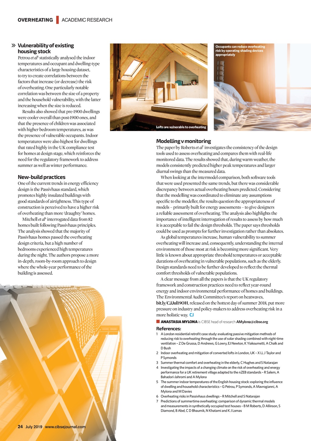 OVERHEATING | ACADEMIC RESEARCH Vulnerability of existing housing stock Petrou et al5 statistically analysed the indoor temperatures and occupant and dwelling-type characteristics of a large housing dataset, to try to create correlations between the factors that increase (or decrease) the risk of overheating. One particularly notable correlation was between the size of a property and the household vulnerability, with the latter increasing when the size is reduced. Results also showed that pre-1900 dwellings were cooler overall than post-1900 ones, and that the presence of children was associated with higher bedroom temperatures, as was the presence of vulnerable occupants. Indoor temperatures were also highest for dwellings that rated highly in the UK compliance test for homes at design stage, which reinforces the need for the regulatory framework to address summer as well as winter performance. New-build practices One of the current trends in energy efficiency design is the Passivhaus standard, which promotes highly insulated buildings with good standards of airtightness. This type of construction is perceived to have a higher risk of overheating than more draughty homes. Mitchell et al6 interrogated data from 82 homes built following Passivhaus principles. The analysis showed that the majority of Passivhaus homes passed the overheating design criteria, but a high number of bedrooms experienced high temperatures during the night. The authors propose a more in-depth, room-by-room approach to design where the whole-year performance of the building is assessed. Occupants can reduce overheating risk by operating shading devices appropriately Lofts are vulnerable to overheating Modelling v monitoring The paper by Roberts et al7 investigates the consistency of the design tools used to assess overheating and compares them with real-life monitored data. The results showed that, during warm weather, the models consistently predicted higher peak temperatures and larger diurnal swings than the measured data. When looking at the intermodel comparison, both software tools that were used presented the same trends, but there was considerable discrepancy between actual overheating hours predicted. Considering that the modelling was coordinated to eliminate any assumptions specific to the modeller, the results question the appropriateness of models primarily built for energy assessments to give designers a reliable assessment of overheating. The analysis also highlights the importance of intelligent interrogation of results to assess by how much it is acceptable to fail the design thresholds. The paper says thresholds could be used as prompts for further investigation rather than absolutes. As global temperatures increase, human vulnerability to summer overheating will increase and, consequently, understanding the internal environment of those most at risk is becoming more significant. Very little is known about appropriate threshold temperatures or acceptable durations of overheating in vulnerable populations, such as the elderly. Design standards need to be further developed to reflect the thermal comfort thresholds of vulnerable populations. A clear message from all the papers is that the UK regulatory framework and construction practices need to reflect year-round energy and indoor environmental performance of homes and buildings. The Environmental Audit Committees report on heatwaves, bit.ly/CJJul19OH, released on the hottest day of summer 2018, put more pressure on industry and policy-makers to address overheating risk in a more holistic way. CJ ANASTASIA MYLONA is CIBSE head of research AMylona@cibse.org References: 1 A London residential retrot case study: evaluating passive mitigation methods of reducing risk to overheating through the use of solar shading combined with night-time ventilation Z De Grussa, D Andrews, G Lowry, EJ Newton, K Yiakoumetti, A Chalk and D Bush 2 Indoor overheating and mitigation of converted lofts in London, UK X Li, J Taylor and P Symonds 3 Summer thermal comfort and overheating in the elderly, C Hughes and S Natarajan 4 Investigating the impacts of a changing climate on the risk of overheating and energy performance for a UK retirement village adapted to the nZEB standards R Salem, A Bahadori-Jahromi and A Mylona 5 The summer indoor temperatures of the English housing stock: exploring the inuence of dwelling and household characteristics G Petrou, P Symonds, A Mavrogianni, A Mylona and M Davies 6 Overheating risks in Passivhaus dwellings R Mitchell and S Natarajan 7 Predictions of summertime overheating: comparison of dynamic thermal models and measurements in synthetically occupied test houses B M Roberts, D Allinson, S Diamond, B Abel, C D Bhaumik, N Khatami and K J Lomas 24 July 2019 www.cibsejournal.com CIBSE July19 pp22-24 BSERT overheating.indd 24 21/06/2019 14:45