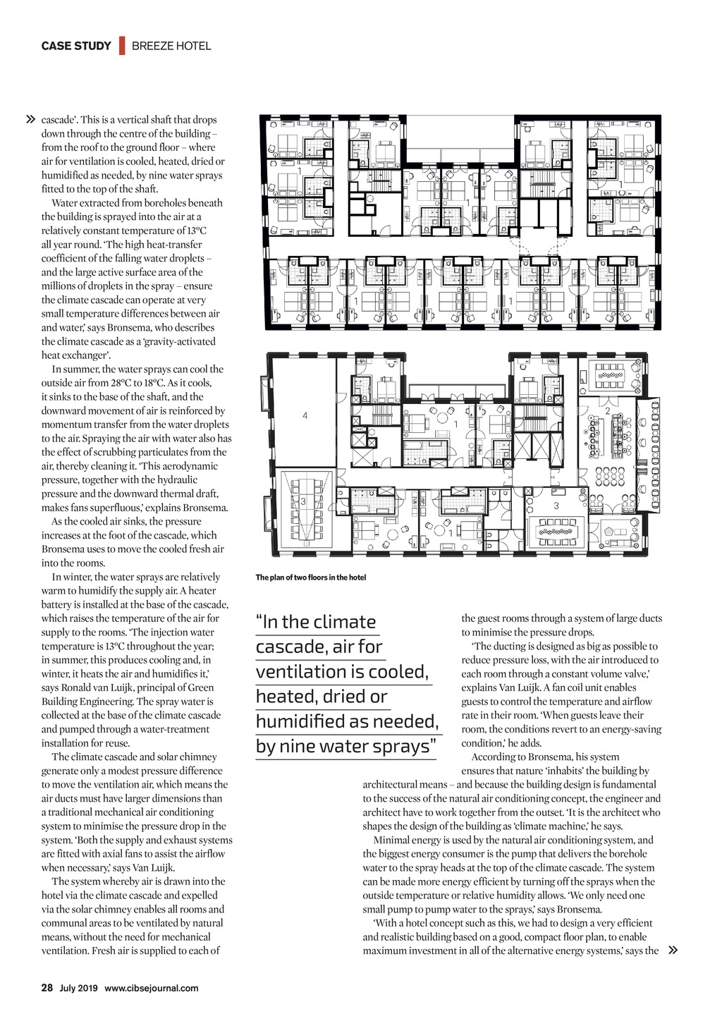 CASE STUDY | BREEZE HOTEL cascade. This is a vertical shaft that drops down through the centre of the building from the roof to the ground floor where air for ventilation is cooled, heated, dried or humidified as needed, by nine water sprays fitted to the top of the shaft. Water extracted from boreholes beneath the building is sprayed into the air at a relatively constant temperature of 13C all year round. The high heat-transfer coefficient of the falling water droplets and the large active surface area of the millions of droplets in the spray ensure the climate cascade can operate at very small temperature differences between air and water, says Bronsema, who describes the climate cascade as a gravity-activated heat exchanger. In summer, the water sprays can cool the outside air from 28C to 18C. As it cools, it sinks to the base of the shaft, and the downward movement of air is reinforced by momentum transfer from the water droplets to the air. Spraying the air with water also has the effect of scrubbing particulates from the air, thereby cleaning it. This aerodynamic pressure, together with the hydraulic pressure and the downward thermal draft, makes fans superfluous, explains Bronsema. As the cooled air sinks, the pressure increases at the foot of the cascade, which Bronsema uses to move the cooled fresh air into the rooms. In winter, the water sprays are relatively warm to humidify the supply air. A heater battery is installed at the base of the cascade, which raises the temperature of the air for supply to the rooms. The injection water temperature is 13C throughout the year; in summer, this produces cooling and, in winter, it heats the air and humidifies it, says Ronald van Luijk, principal of Green Building Engineering. The spray water is collected at the base of the climate cascade and pumped through a water-treatment installation for reuse. The climate cascade and solar chimney generate only a modest pressure difference to move the ventilation air, which means the air ducts must have larger dimensions than a traditional mechanical air conditioning system to minimise the pressure drop in the system. Both the supply and exhaust systems are fitted with axial fans to assist the airflow when necessary, says Van Luijk. The system whereby air is drawn into the hotel via the climate cascade and expelled via the solar chimney enables all rooms and communal areas to be ventilated by natural means, without the need for mechanical ventilation. Fresh air is supplied to each of The plan of two floors in the hotel In the climate cascade, air for ventilation is cooled, heated, dried or humidified as needed, by nine water sprays the guest rooms through a system of large ducts to minimise the pressure drops. The ducting is designed as big as possible to reduce pressure loss, with the air introduced to each room through a constant volume valve, explains Van Luijk. A fan coil unit enables guests to control the temperature and airflow rate in their room. When guests leave their room, the conditions revert to an energy-saving condition, he adds. According to Bronsema, his system ensures that nature inhabits the building by architectural means and because the building design is fundamental to the success of the natural air conditioning concept, the engineer and architect have to work together from the outset. It is the architect who shapes the design of the building as climate machine, he says. Minimal energy is used by the natural air conditioning system, and the biggest energy consumer is the pump that delivers the borehole water to the spray heads at the top of the climate cascade. The system can be made more energy efficient by turning off the sprays when the outside temperature or relative humidity allows. We only need one small pump to pump water to the sprays, says Bronsema. With a hotel concept such as this, we had to design a very efficient and realistic building based on a good, compact floor plan, to enable maximum investment in all of the alternative energy systems, says the 28 July 2019 www.cibsejournal.com CIBSE July19 pp26-28, 30 BreezeHotel.indd 28 21/06/2019 14:46