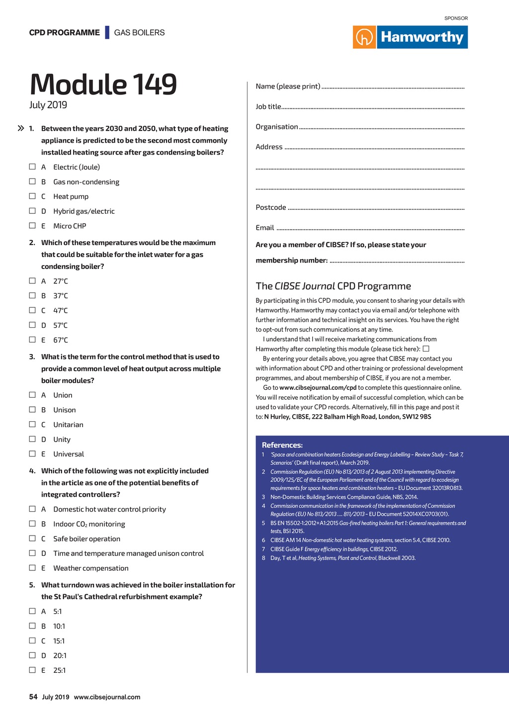 SPONSOR CPD PROGRAMME | GAS BOILERS Module 149 Name (please print).......................................................................................... July 2019 Job title................................................................................................................... 1.Between the years 2030 and 2050, what type of heating Organisation........................................................................................................ appliance is predicted to be the second most commonly installed heating source after gas condensing boilers? A Electric (Joule) B Gas non-condensing Address ................................................................................................................. .................................................................................................................................. .................................................................................................................................. C Heat pump D Hybrid gas/electric E Micro CHP 2.Which of these temperatures would be the maximum that could be suitable for the inlet water for a gas condensing boiler? A 27C B 37C C 47C D 57C E 67C 3.What is the term for the control method that is used to provide a common level of heat output across multiple boiler modules? A Union B Unison C Unitarian D Unity E Universal 4.Which of the following was not explicitly included in the article as one of the potential benefits of integrated controllers? A Domestic hot water control priority B Indoor CO2 monitoring C Safe boiler operation D Time and temperature managed unison control Postcode ............................................................................................................... Email ...................................................................................................................... Are you a member of CIBSE? If so, please state your membership number: ..................................................................................... The CIBSE Journal CPD Programme By participating in this CPD module, you consent to sharing your details with Hamworthy. Hamworthy may contact you via email and/or telephone with further information and technical insight on its services. You have the right to opt-out from such communications at any time. I understand that I will receive marketing communications from Hamworthy after completing this module (please tick here): By entering your details above, you agree that CIBSE may contact you with information about CPD and other training or professional development programmes, and about membership of CIBSE, if you are not a member. Go to www.cibsejournal.com/cpd to complete this questionnaire online. You will receive notification by email of successful completion, which can be used to validate your CPD records. Alternatively, fill in this page and post it to: N Hurley, CIBSE, 222 Balham High Road, London, SW12 9BS References: 1 Space and combination heaters Ecodesign and Energy Labelling Review Study Task 7, Scenarios (Draft final report), March 2019. 2 Commission Regulation (EU) No 813/2013 of 2 August 2013 implementing Directive 2009/125/EC of the European Parliament and of the Council with regard to ecodesign requirements for space heaters and combination heaters EU Document 32013R0813. 3 Non-Domestic Building Services Compliance Guide, NBS, 2014. 4 Commission communication in the framework of the implementation of Commission Regulation (EU) No 813/2013 . 811/2013 EU Document 52014XC0703(01). 5 BS EN 15502-1:2012+A1:2015 Gas-fired heating boilers Part 1: General requirements and tests, BSI 2015. 6 CIBSE AM 14 Non-domestic hot water heating systems, section 5.4, CIBSE 2010. 7 CIBSE Guide F Energy efficiency in buildings, CIBSE 2012. 8 Day, T et al, Heating Systems, Plant and Control, Blackwell 2003. E Weather compensation 5.What turndown was achieved in the boiler installation for the St Pauls Cathedral refurbishment example? A 5:1 B 10:1 C 15:1 D 20:1 E 25:1 54 July 2019 www.cibsejournal.com CIBSE July19 pp51-54 CPD v4indd.indd 54 21/06/2019 14:52