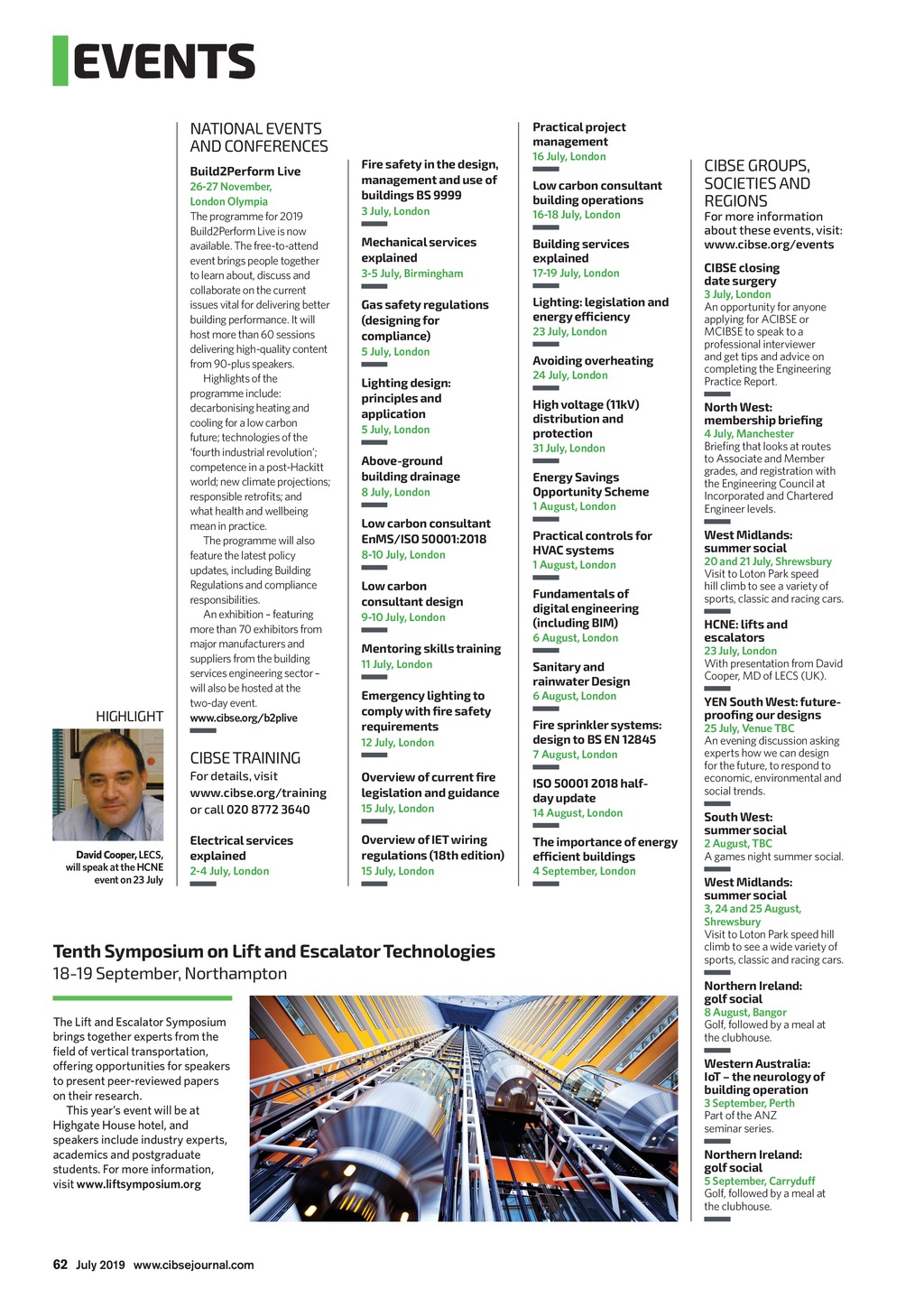 EVENTS NATIONAL EVENTS AND CONFERENCES Build2Perform Live HIGHLIGHT 26-27 November, LondonOlympia The programme for 2019 Build2Perform Live is now available. The free-to-attend event brings people together to learn about, discuss and collaborate on the current issues vital for delivering better building performance. It will host more than 60 sessions delivering high-quality content from 90-plus speakers. Highlights of the programme include: decarbonising heating and cooling for a low carbon future; technologies of the fourth industrial revolution; competence in a post-Hackitt world; new climate projections; responsible retrofits; and whathealth and wellbeing mean in practice. The programme will also feature the latest policy updates, including Building Regulations and compliance responsibilities. An exhibition featuring more than 70 exhibitors from major manufacturers and suppliers from the building services engineering sector will also be hosted at the two-day event. www.cibse.org/b2plive Fire safety in the design, management and use of buildings BS 9999 3 July, London Mechanical services explained 16 July, London Low carbon consultant building operations 16-18 July, London Building services explained 3-5 July, Birmingham 17-19 July, London Gas safety regulations (designing for compliance) Lighting: legislation and energy efficiency 5 July, London Lighting design: principles and application 5 July, London Above-ground buildingdrainage 8 July, London Low carbon consultant EnMS/ISO 50001:2018 8-10 July, London Low carbon consultantdesign 9-10 July, London Mentoring skills training 11 July, London Emergency lighting to comply with fire safety requirements 23 July, London Avoiding overheating 24 July, London High voltage (11kV) distribution and protection 1 August, London Fundamentals of digitalengineering (including BIM) 6 August, London Sanitary and rainwaterDesign 6 August, London ISO 50001 2018 halfdayupdate Electrical services explained Overview of IET wiring regulations (18th edition) 2-4 July, London 15 July, London The Lift and Escalator Symposium brings together experts from the field of vertical transportation, offering opportunities for speakers to present peer-reviewed papers on their research. This years event will be at Highgate House hotel, and speakers include industry experts, academics and postgraduate students. For more information, visit www.liftsymposium.org 3 July, London An opportunity for anyone applying for ACIBSE or MCIBSE to speak to a professional interviewer and get tips and advice on completing the Engineering Practice Report. North West: membershipbriefing West Midlands: summersocial Overview of current fire legislation and guidance 18-19 September, Northampton CIBSE closing datesurgery Practical controls for HVAC systems For details, visit www.cibse.org/training or call 020 8772 3640 Tenth Symposium on Lift and Escalator Technologies For more information about these events, visit: www.cibse.org/events 1 August, London Energy Savings Opportunity Scheme Fire sprinkler systems: design to BS EN 12845 15 July, London CIBSE GROUPS, SOCIETIES AND REGIONS 4 July, Manchester Briefing that looks at routes to Associate and Member grades, and registration with the Engineering Council at Incorporated and Chartered Engineer levels. 31 July, London 12 July, London CIBSE TRAINING David Cooper, LECS, will speak at the HCNE event on 23 July Practical project management 7 August, London 14 August, London The importance of energy efficient buildings 4 September, London 20 and 21 July, Shrewsbury Visit to Loton Park speed hill climb to see a variety of sports, classic and racing cars. HCNE: lifts and escalators 23 July, London With presentation from David Cooper, MD of LECS (UK). YEN South West: futureproofing our designs 25 July, Venue TBC An evening discussion asking experts how we can design for the future, to respond to economic, environmental and social trends. South West: summersocial 2 August, TBC A games night summer social. West Midlands: summersocial 3, 24 and 25 August, Shrewsbury Visit to Loton Park speed hill climb to see a wide variety of sports, classic and racing cars. Northern Ireland: golfsocial 8 August, Bangor Golf, followed by a meal at theclubhouse. Western Australia: IoT the neurology of buildingoperation 3 September, Perth Part of the ANZ seminar series. Northern Ireland: golfsocial 5 September, Carryduff Golf, followed by a meal at theclubhouse. 62 July 2019 www.cibsejournal.com CIBSE July19 pp62 Events.indd 62 21/06/2019 15:37