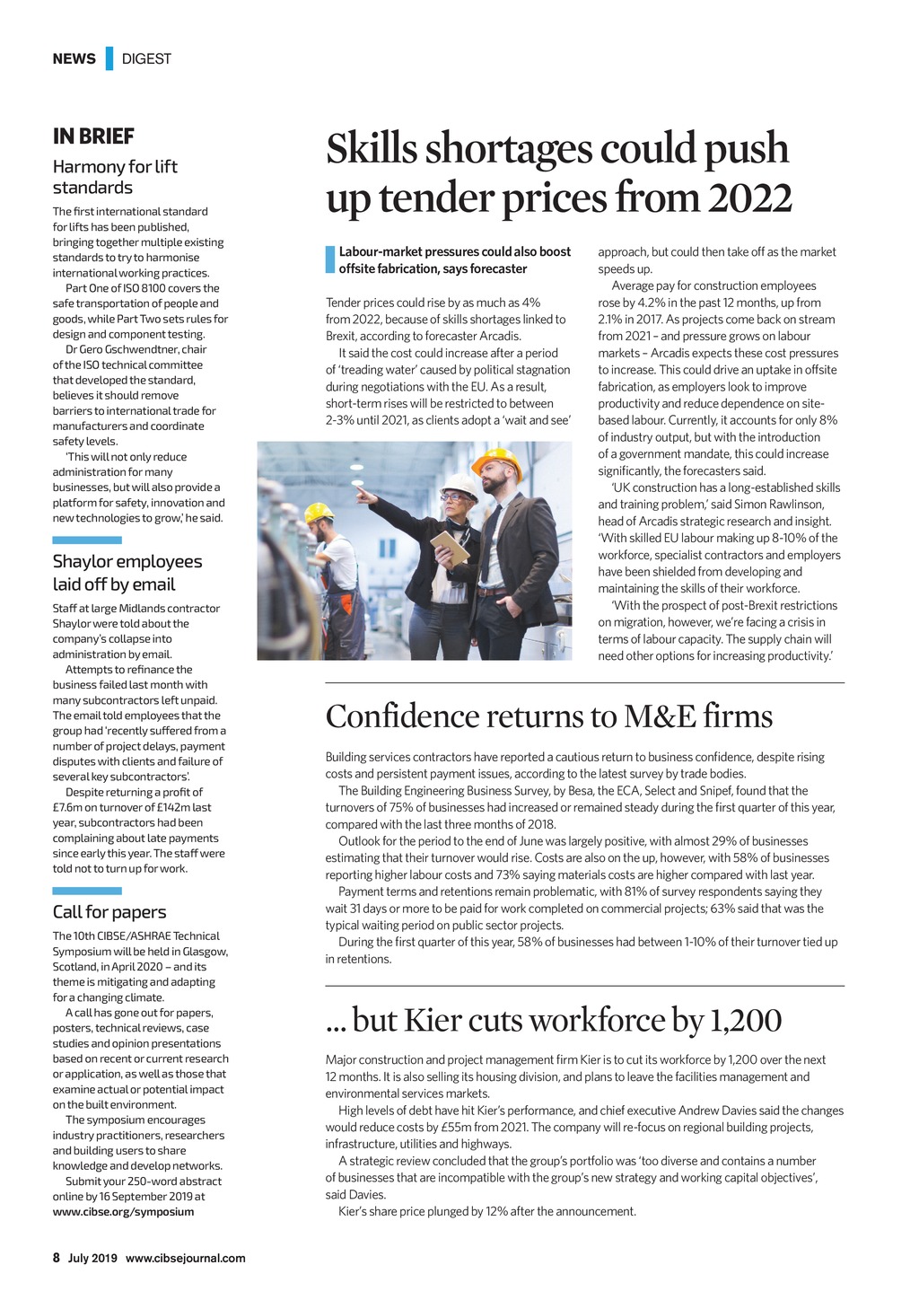 EWS | DIGEST IN BRIEF Harmony for lift standards The first international standard for lifts has been published, bringing together multiple existing standards to try to harmonise international working practices. Part One of ISO 8100 covers the safe transportation of people and goods, while Part Two sets rules for design and component testing. Dr Gero Gschwendtner, chair of the ISO technical committee that developed the standard, believes it should remove barriers to international trade for manufacturers and coordinate safety levels. This will not only reduce administration for many businesses, but will also provide a platform for safety, innovation and new technologies to grow, he said. Shaylor employees laid off by email Staff at large Midlands contractor Shaylor were told about the companys collapse into administration by email. Attempts to refinance the business failed last month with many subcontractors left unpaid. The email told employees that the group had recently suffered from a number of project delays, payment disputes with clients and failure of several key subcontractors. Despite returning a profit of 7.6m on turnover of 142m last year, subcontractors had been complaining about late payments since early this year. The staff were told not to turn up for work. Call for papers The 10th CIBSE/ASHRAE Technical Symposium will be held in Glasgow, Scotland, in April 2020 and its theme is mitigating and adapting for a changing climate. A call has gone out for papers, posters, technical reviews, case studies and opinion presentations based on recent or current research or application, as well as those that examine actual or potential impact on the built environment. The symposium encourages industry practitioners, researchers and building users to share knowledge and develop networks. Submit your 250-word abstract online by 16 September 2019 at www.cibse.org/symposium Skills shortages could push up tender prices from 2022 Labour-market pressures could also boost offsite fabrication, says forecaster Tender prices could rise by as much as 4% from 2022, because of skills shortages linked to Brexit, according to forecaster Arcadis. It said the cost could increase after a period of treading water caused by political stagnation during negotiations with the EU. As a result, short-term rises will be restricted to between 2-3% until 2021, as clients adopt a wait and see approach, but could then take off as the market speeds up. Average pay for construction employees rose by 4.2% in the past 12 months, up from 2.1% in 2017. As projects come back on stream from 2021 and pressure grows on labour markets Arcadis expects these cost pressures to increase. This could drive an uptake in offsite fabrication, as employers look to improve productivity and reduce dependence on sitebased labour. Currently, it accounts for only 8% of industry output, but with the introduction of a government mandate, this could increase significantly, the forecasters said. UK construction has a long-established skills and training problem, said Simon Rawlinson, head of Arcadis strategic research and insight. With skilled EU labour making up 8-10% of the workforce, specialist contractors and employers have been shielded from developing and maintaining the skills of their workforce. With the prospect of post-Brexit restrictions on migration, however, were facing a crisis in terms of labour capacity. The supply chain will need other options for increasing productivity. Confidence returns to M&E firms Building services contractors have reported a cautious return to business confidence, despite rising costs and persistent payment issues, according to the latest survey by trade bodies. The Building Engineering Business Survey, by Besa, the ECA, Select and Snipef, found that the turnovers of 75% of businesses had increased or remained steady during the first quarter of this year, compared with the last three months of 2018. Outlook for the period to the end of June was largely positive, with almost 29% of businesses estimating that their turnover would rise. Costs are also on the up, however, with 58% of businesses reporting higher labour costs and 73% saying materials costs are higher compared with last year. Payment terms and retentions remain problematic, with 81% of survey respondents saying they wait 31 days or more to be paid for work completed on commercial projects; 63% said that was the typical waiting period on public sector projects. During the first quarter of this year, 58% of businesses had between 1-10% of their turnover tied up in retentions. but Kier cuts workforce by 1,200 Major construction and project management firm Kier is to cut its workforce by 1,200 over the next 12 months. It is also selling its housing division, and plans to leave the facilities management and environmental services markets. High levels of debt have hit Kiers performance, and chief executive Andrew Davies said the changes would reduce costs by 55m from 2021. The company will re-focus on regional building projects, infrastructure, utilities and highways. A strategic review concluded that the groups portfolio was too diverse and contains a number ofbusinesses that are incompatible with the groups new strategy and working capital objectives, saidDavies. Kiers share price plunged by 12% after the announcement. 8 July 2019 www.cibsejournal.com CIBSE July19 pp08-09 News.indd 8 21/06/2019 15:28