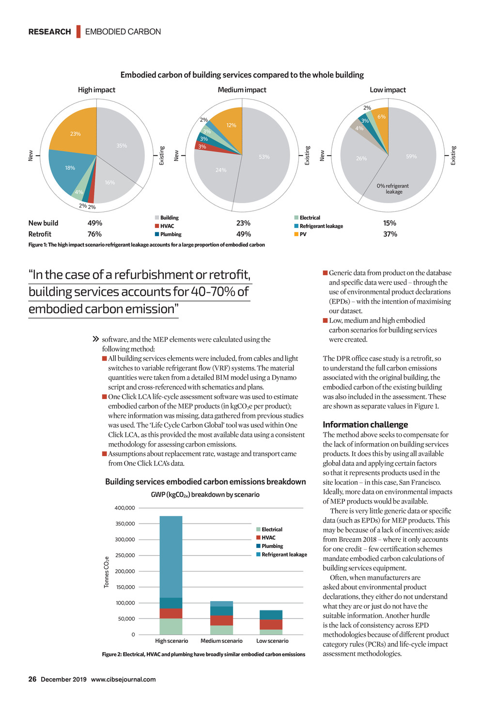 RESEARCH | EMBODIED CARBON Embodied carbon of building services compared to the whole building High impact Medium impact Low impact 2% 18% 53% New New New Existing 35% Existing 3% 3% 3% 23% 3% 4% 12% 6% 59% 26% Existing 2% 24% 16% 0% refrigerant leakage 4% 2% 2% New build Retrofit Building HVAC Plumbing 49% 76% Electrical Refrigerant leakage PV 23% 49% 15% 37% Figure 1: The high impact scenario refrigerant leakage accounts for a large proportion of embodied carbon In the case of a refurbishment or retrofit, building services accounts for 40-70% of embodied carbon emission Generic data from product on the database software, and the MEP elements were calculated using the following method: All building services elements were included, from cables and light switches to variable refrigerant flow (VRF) systems. The material quantities were taken from a detailed BIM model using a Dynamo script and cross-referenced with schematics and plans. One Click LCA life-cycle assessment software was used to estimate embodied carbon of the MEP products (in kgCO2e per product); where information was missing, data gathered from previous studies was used. The Life Cycle Carbon Global tool was used within One Click LCA, as this provided the most available data using a consistent methodology for assessing carbon emissions. Assumptions about replacement rate, wastage and transport came from One Click LCAs data. Building services embodied carbon emissions breakdown GWP (kgCO2e) breakdown by scenario 400,000 350,000 Electrical HVAC Plumbing Refrigerant leakage Tonnes CO2e 300,000 250,000 200,000 150,000 100,000 50,000 0 High scenario Medium scenario Low scenario Figure 2: Electrical, HVAC and plumbing have broadly similar embodied carbon emissions and specific data were used through the use of environmental product declarations (EPDs) with the intention of maximising our dataset. Low, medium and high embodied carbon scenarios for building services were created. The DPR office case study is a retrofit, so to understand the full carbon emissions associated with the original building, the embodied carbon of the existing building was also included in the assessment. These are shown as separate values in Figure 1. Information challenge The method above seeks to compensate for the lack of information on building services products. It does this by using all available global data and applying certain factors so that it represents products used in the site location in this case, San Francisco. Ideally, more data on environmental impacts of MEP products would be available. There is very little generic data or specific data (such as EPDs) for MEP products. This may be because of a lack of incentives; aside from Breeam 2018 where it only accounts for one credit few certification schemes mandate embodied carbon calculations of building services equipment. Often, when manufacturers are asked about environmental product declarations, they either do not understand what they are or just do not have the suitable information. Another hurdle is the lack of consistency across EPD methodologies because of different product category rules (PCRs) and life-cycle impact assessment methodologies. 26 December 2019 www.cibsejournal.com CIBSE Dec19 pp25-27 Embodied carbon.indd 26 22/11/2019 16:58