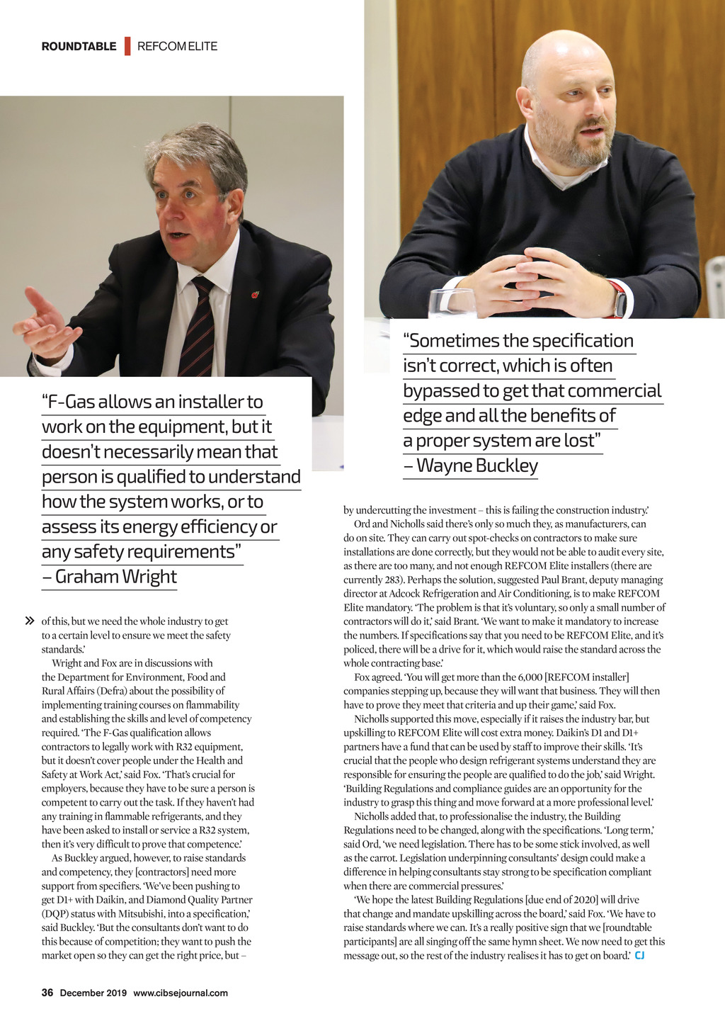 ROUNDTABLE | REFCOM ELITE F-Gas allows an installer to work on the equipment, but it doesnt necessarily mean that person is qualified to understand how the system works, or to assess its energy efficiency or any safety requirements Graham Wright of this, but we need the whole industry to get to a certain level to ensure we meet the safety standards. Wright and Fox are in discussions with the Department for Environment, Food and Rural Affairs (Defra) about the possibility of implementing training courses on flammability and establishing the skills and level of competency required. The F-Gas qualification allows contractors to legally work with R32 equipment, but it doesnt cover people under the Health and Safety at Work Act, said Fox. Thats crucial for employers, because they have to be sure a person is competent to carry out the task. If they havent had any training in flammable refrigerants, and they have been asked to install or service a R32 system, then its very difficult to prove that competence. As Buckley argued, however, to raise standards and competency, they [contractors] need more support from specifiers. Weve been pushing to get D1+ with Daikin, and Diamond Quality Partner (DQP) status with Mitsubishi, into a specification, said Buckley. But the consultants dont want to do this because of competition; they want to push the market open so they can get the right price, but Sometimes the specification isnt correct, which is often bypassed to get that commercial edge and all the benefits of a proper system are lost Wayne Buckley by undercutting the investment this is failing the construction industry. Ord and Nicholls said theres only so much they, as manufacturers, can do on site. They can carry out spot-checks on contractors to make sure installations are done correctly, but they would not be able to audit every site, as there are too many, and not enough REFCOM Elite installers (there are currently 283). Perhaps the solution, suggested Paul Brant, deputy managing director at Adcock Refrigeration and Air Conditioning, is to make REFCOM Elite mandatory. The problem is that its voluntary, so only a small number of contractors will do it, said Brant. We want to make it mandatory to increase the numbers. If specifications say that you need to be REFCOM Elite, and its policed, there will be a drive for it, which would raise the standard across the whole contracting base. Fox agreed. You will get more than the 6,000 [REFCOM installer] companies stepping up, because they will want that business. They will then have to prove they meet that criteria and up their game, said Fox. Nicholls supported this move, especially if it raises the industry bar, but upskilling to REFCOM Elite will cost extra money. Daikins D1 and D1+ partners have a fund that can be used by staff to improve their skills. Its crucial that the people who design refrigerant systems understand they are responsible for ensuring the people are qualified to do the job, said Wright. Building Regulations and compliance guides are an opportunity for the industry to grasp this thing and move forward at a more professional level. Nicholls added that, to professionalise the industry, the Building Regulations need to be changed, along with the specifications. Long term, said Ord, we need legislation. There has to be some stick involved, as well as the carrot. Legislation underpinning consultants design could make a difference in helping consultants stay strong to be specification compliant when there are commercial pressures. We hope the latest Building Regulations [due end of 2020] will drive that change and mandate upskilling across the board, said Fox. We have to raise standards where we can. Its a really positive sign that we [roundtable participants] are all singing off the same hymn sheet. We now need to get this message out, so the rest of the industry realises it has to get on board. CJ 36 December 2019 www.cibsejournal.com CIBSE Dec19 pp33-36 REFCOM Roundtable.indd 36 22/11/2019 15:24