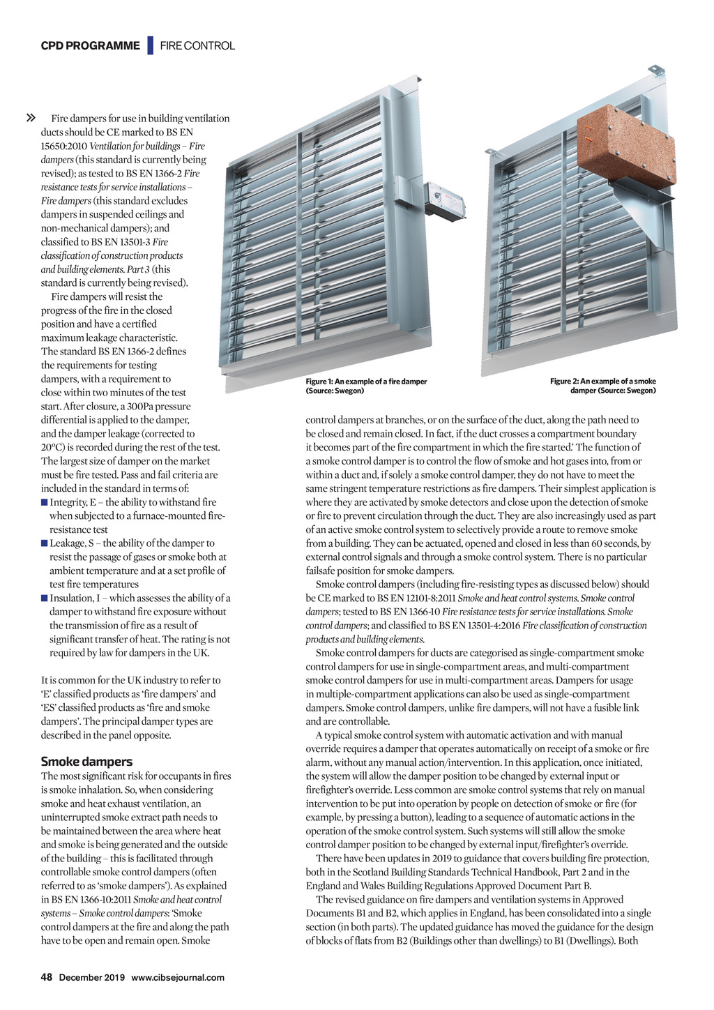 CPD PROGRAMME | FIRE CONTROL Fire dampers for use in building ventilation ducts should be CE marked to BS EN 15650:2010 Ventilation for buildings Fire dampers (this standard is currently being revised); as tested to BS EN 1366-2 Fire resistance tests for service installations Fire dampers (this standard excludes dampers in suspended ceilings and non-mechanical dampers); and classified to BS EN 13501-3 Fire classification of construction products and building elements. Part 3 (this standard is currently being revised). Fire dampers will resist the progress of the fire in the closed position and have a certified maximum leakage characteristic. The standard BS EN 1366-2 defines the requirements for testing dampers, with a requirement to close within two minutes of the test start. After closure, a 300Pa pressure differential is applied to the damper, and the damper leakage (corrected to 20C) is recorded during the rest of the test. The largest size of damper on the market must be fire tested. Pass and fail criteria are included in the standard in terms of: Integrity, E the ability to withstand fire when subjected to a furnace-mounted fireresistance test Leakage, S the ability of the damper to resist the passage of gases or smoke both at ambient temperature and at a set profile of test fire temperatures Insulation, I which assesses the ability of a damper to withstand fire exposure without the transmission of fire as a result of significant transfer of heat. The rating is not required by law for dampers in the UK. It is common for the UK industry to refer to E classified products as fire dampers and ES classified products as fire and smoke dampers. The principal damper types are described in the panel opposite. Smoke dampers The most significant risk for occupants in fires is smoke inhalation. So, when considering smoke and heat exhaust ventilation, an uninterrupted smoke extract path needs to be maintained between the area where heat and smoke is being generated and the outside of the building this is facilitated through controllable smoke control dampers (often referred to as smoke dampers). As explained in BS EN 1366-10:2011 Smoke and heat control systems Smoke control dampers: Smoke control dampers at the fire and along the path have to be open and remain open. Smoke Figure 1: An example of a fire damper (Source: Swegon) Figure 2: An example of a smoke damper (Source: Swegon) control dampers at branches, or on the surface of the duct, along the path need to be closed and remain closed. In fact, if the duct crosses a compartment boundary it becomes part of the fire compartment in which the fire started. The function of a smoke control damper is to control the flow of smoke and hot gases into, from or within a duct and, if solely a smoke control damper, they do not have to meet the same stringent temperature restrictions as fire dampers. Their simplest application is where they are activated by smoke detectors and close upon the detection of smoke or fire to prevent circulation through the duct. They are also increasingly used as part of an active smoke control system to selectively provide a route to remove smoke from a building. They can be actuated, opened and closed in less than 60 seconds, by external control signals and through a smoke control system. There is no particular failsafe position for smoke dampers. Smoke control dampers (including fire-resisting types as discussed below) should be CE marked to BS EN 12101-8:2011 Smoke and heat control systems. Smoke control dampers; tested to BS EN 1366-10 Fire resistance tests for service installations. Smoke control dampers; and classified to BS EN 13501-4:2016 Fire classification of construction products and building elements. Smoke control dampers for ducts are categorised as single-compartment smoke control dampers for use in single-compartment areas, and multi-compartment smoke control dampers for use in multi-compartment areas. Dampers for usage in multiple-compartment applications can also be used as single-compartment dampers. Smoke control dampers, unlike fire dampers, will not have a fusible link and are controllable. A typical smoke control system with automatic activation and with manual override requires a damper that operates automatically on receipt of a smoke or fire alarm, without any manual action/intervention. In this application, once initiated, the system will allow the damper position to be changed by external input or firefighters override. Less common are smoke control systems that rely on manual intervention to be put into operation by people on detection of smoke or fire (for example, by pressing a button), leading to a sequence of automatic actions in the operation of the smoke control system. Such systems will still allow the smoke control damper position to be changed by external input/firefighters override. There have been updates in 2019 to guidance that covers building fire protection, both in the Scotland Building Standards Technical Handbook, Part 2 and in the England and Wales Building Regulations Approved Document Part B. The revised guidance on fire dampers and ventilation systems in Approved Documents B1 and B2, which applies in England, has been consolidated into a single section (in both parts). The updated guidance has moved the guidance for the design of blocks of flats from B2 (Buildings other than dwellings) to B1 (Dwellings). Both 48 December 2019 www.cibsejournal.com CIBSE Dec19 pp47-50 CPD.indd 48 22/11/2019 15:28