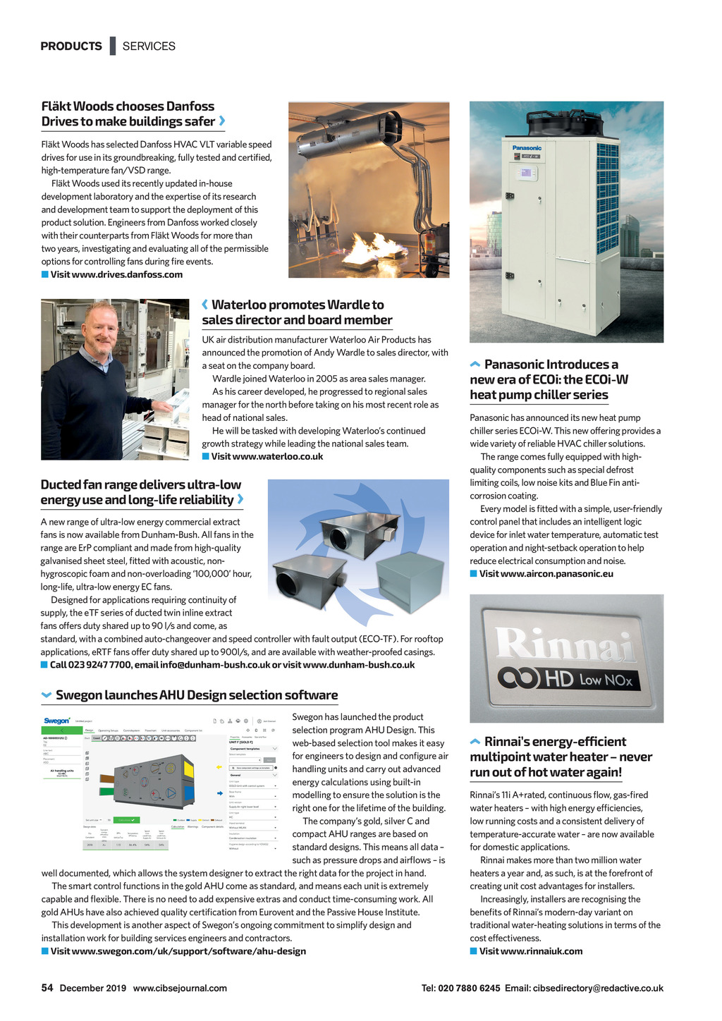 PRODUCTS | SERVICES Flkt Woods chooses Danfoss Drives to make buildings safer Flkt Woods has selected Danfoss HVAC VLT variable speed drives for use in its groundbreaking, fully tested and certied, high-temperature fan/VSD range. Flkt Woods used its recently updated in-house development laboratory and the expertise of its research and development team to support the deployment of this product solution. Engineers from Danfoss worked closely with their counterparts from Flkt Woods for more than two years, investigating and evaluating all of the permissible options for controlling fans during re events. Visit www.drives.danfoss.com Waterloo promotes Wardle to sales director and board member UK air distribution manufacturer Waterloo Air Products has announced the promotion of Andy Wardle to sales director, with a seat on the company board. Wardle joined Waterloo in 2005 as area sales manager. As his career developed, he progressed to regional sales manager for the north before taking on his most recent role as head of national sales. He will be tasked with developing Waterloos continued growth strategy while leading the national sales team. Visit www.waterloo.co.uk Ducted fan range delivers ultra-low energy use and long-life reliability A new range of ultra-low energy commercial extract fans is now available from Dunham-Bush. All fans in the range are ErP compliant and made from high-quality galvanised sheet steel, tted with acoustic, nonhygroscopic foam and non-overloading 100,000 hour, long-life, ultra-low energy EC fans. Designed for applications requiring continuity of supply, the eTF series of ducted twin inline extract fans offers duty shared up to 90 l/s and come, as standard, with a combined auto-changeover and speed controller with fault output (ECO-TF). For rooftop applications, eRTF fans offer duty shared up to 900l/s, and are available with weather-proofed casings. Call 023 9247 7700, email info@dunham-bush.co.uk or visit www.dunham-bush.co.uk Panasonic Introduces a new era of ECOi: the ECOi-W heat pump chiller series Panasonic has announced its new heat pump chiller series ECOi-W. This new offering provides a wide variety of reliable HVAC chiller solutions. The range comes fully equipped with highquality components such as special defrost limiting coils, low noise kits and Blue Fin anticorrosion coating. Every model is tted with a simple, user-friendly control panel that includes an intelligent logic device for inlet water temperature, automatic test operation and night-setback operation to help reduce electrical consumption and noise. Visit www.aircon.panasonic.eu Swegon launches AHU Design selection software Swegon has launched the product selection program AHU Design. This web-based selection tool makes it easy for engineers to design and congure air handling units and carry out advanced energy calculations using built-in modelling to ensure the solution is the right one for the lifetime of the building. The companys gold, silver C and compact AHU ranges are based on standard designs. This means all data such as pressure drops and airows is well documented, which allows the system designer to extract the right data for the project in hand. The smart control functions in the gold AHU come as standard, and means each unit is extremely capable and exible. There is no need to add expensive extras and conduct time-consuming work. All gold AHUs have also achieved quality certication from Eurovent and the Passive House Institute. This development is another aspect of Swegons ongoing commitment to simplify design and installation work for building services engineers and contractors. Visit www.swegon.com/uk/support/software/ahu-design 54 December 2019 www.cibsejournal.com CIBSE Dec19 pp52-55 Products.indd 54 Rinnais energy-efficient multipoint water heater never run out of hot water again! Rinnais 11i A+rated, continuous ow, gas-red water heaters with high energy efciencies, low running costs and a consistent delivery of temperature-accurate water are now available for domestic applications. Rinnai makes more than two million water heaters a year and, as such, is at the forefront of creating unit cost advantages for installers. Increasingly, installers are recognising the benets of Rinnais modern-day variant on traditional water-heating solutions in terms of the cost effectiveness. Visit www.rinnaiuk.com Tel: 020 7880 6245 Email: cibsedirectory@redactive.co.uk 22/11/2019 15:31
