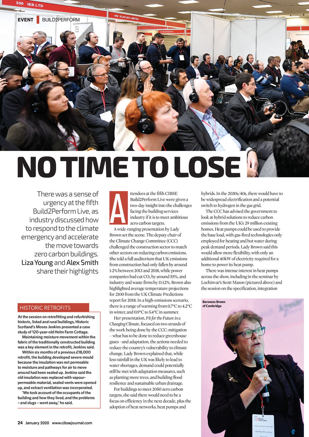 EVENT | BUILD2PERFORM NO TIME TO LOSE There was a sense of urgency at the fifth Build2Perform Live, as industry discussed how to respond to the climate emergency and accelerate the move towards zero carbon buildings. Liza Young and Alex Smith share their highlights HISTORIC RETROFITS At the session on retrofitting and refurbishing historic, listed and rural buildings, Historic Scotlands Moses Jenkins presented a case study of 120-year-old Holm Farm Cottage. Maintaining moisture movement within the fabric of the traditionally constructed building was a key element in the retrofit, Jenkins said. Within six months of a previous 18,000 retrofit, the building developed severe mould because the insulation was not permeable to moisture and pathways for air to move around had been sealed up. Jenkins said the old insulation was replaced with vapourpermeable material, sealed vents were opened up, and extract ventilation was incorporated. We took account of the occupants of the building and how they lived, and the problems and slugs went away, he said. A ttendees at the fifth CIBSE Build2Perform Live were given a two-day insight into the challenges facing the building services industry if it is to meet ambitious zero carbon targets. A wide-ranging presentation by Lady Brown set the scene. The deputy chair of the Climate Change Committee (CCC) challenged the construction sector to match other sectors on reducing carbon emissions. She told a full auditorium that UK emissions from construction had only fallen by around 1-2% between 2013 and 2018, while power companies had cut CO2 by around 55%, and industry and waste firms by 11-12%. Brown also highlighted average temperature projections for 2100 from the UK Climate Predictions report for 2018. In a high-emissions scenario, there is a range of warming from 0.7C to 4.2C in winter, and 0.9C to 5.4C in summer. Her presentation, Fit for the Future in a Changing Climate, focused on two strands of the work being done by the CCC: mitigation what has to be done to reduce greenhouse gases and adaptation, the actions needed to reduce the countrys vulnerability to climate change. Lady Brown explained that, while less rainfall in the UK was likely to lead to water shortages, demand could potentially still be met with adaptation measures, such as planting more trees, and building flood resilience and sustainable urban drainage. For buildings to meet 2050 zero carbon targets, she said there would need to be a focus on efficiency in the next decade, plus the adoption of heat networks, heat pumps and hybrids. In the 2030s/40s, there would have to be widespread electrification and a potential switch to hydrogen in the gas grid. The CCC has advised the government to look at hybrid solutions to reduce carbon emissions from the UKs 29 million existing homes. Heat pumps could be used to provide the base load, with gas-fired technologies only employed for heating and hot water during peak demand periods. Lady Brown said this would allow more flexibility, with only an additional 40kW of electricity required for a home to power its heat pump. There was intense interest in heat pumps across the show, including in the seminar by Lochinvars Scott Mason (pictured above) and the session on the specification, integration Baroness Brown of Cambridge 24 January 2020 www.cibsejournal.com CIBSE Jan20 pp24-27 Build2Perform v2.indd 24 20/12/2019 15:14
