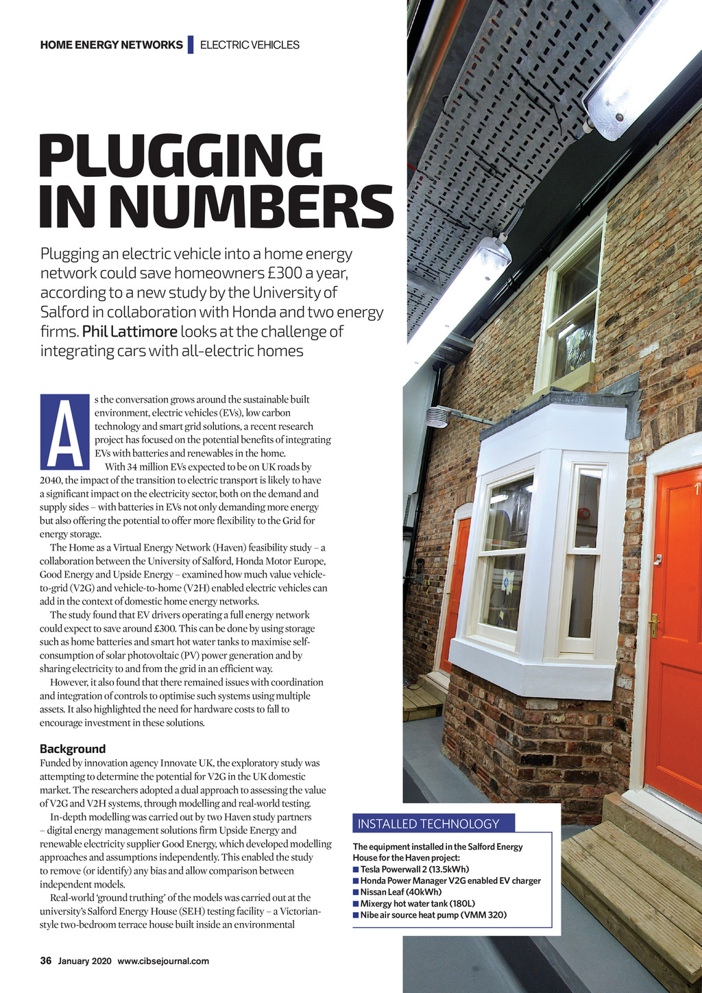 HOME ENERGY NETWORKS | ELECTRIC VEHICLES PLUGGING IN NUMBERS Plugging an electric vehicle into a home energy network could save homeowners 300 a year, according to a new study by the University of Salford in collaboration with Honda and two energy firms. Phil Lattimore looks at the challenge of integrating cars with all-electric homes A s the conversation grows around the sustainable built environment, electric vehicles (EVs), low carbon technology and smart grid solutions, a recent research project has focused on the potential benefits of integrating EVs with batteries and renewables in the home. With 34 million EVs expected to be on UK roads by 2040, the impact of the transition to electric transport is likely to have a significant impact on the electricity sector, both on the demand and supply sides with batteries in EVs not only demanding more energy but also offering the potential to offer more flexibility to the Grid for energy storage. The Home as a Virtual Energy Network (Haven) feasibility study a collaboration between the University of Salford, Honda Motor Europe, Good Energy and Upside Energy examined how much value vehicleto-grid (V2G) and vehicle-to-home (V2H) enabled electric vehicles can add in the context of domestic home energy networks. The study found that EV drivers operating a full energy network could expect to save around 300. This can be done by using storage such as home batteries and smart hot water tanks to maximise selfconsumption of solar photovoltaic (PV) power generation and by sharing electricity to and from the grid in an efficient way. However, it also found that there remained issues with coordination and integration of controls to optimise such systems using multiple assets. It also highlighted the need for hardware costs to fall to encourage investment in these solutions. Background Funded by innovation agency Innovate UK, the exploratory study was attempting to determine the potential for V2G in the UK domestic market. The researchers adopted a dual approach to assessing the value of V2G and V2H systems, through modelling and real-world testing. In-depth modelling was carried out by two Haven study partners digital energy management solutions firm Upside Energy and renewable electricity supplier Good Energy, which developed modelling approaches and assumptions independently. This enabled the study to remove (or identify) any bias and allow comparison between independent models. Real-world ground truthing of the models was carried out at the universitys Salford Energy House (SEH) testing facility a Victorianstyle two-bedroom terrace house built inside an environmental INSTALLED TECHNOLOGY The equipment installed in the Salford Energy House for the Haven project: Tesla Powerwall 2 (13.5kWh) Honda Power Manager V2G enabled EV charger Nissan Leaf (40kWh) Mixergy hot water tank (180L) Nibe air source heat pump (VMM 320) 36 January 2020 www.cibsejournal.com CIBSE Jan20 pp36-38 Electric vehicle.indd 36 20/12/2019 15:27