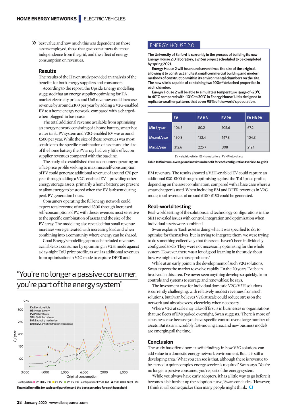 HOME ENERGY NETWORKS | ELECTRIC VEHICLES best value and how much this was dependent on those assets employed, those that gave consumers the most independence from the grid, and the effect of energy consumption on revenues. Results The results of the Haven study provided an analysis of the benefits for both energy suppliers and consumers. According to the report, the Upside Energy modelling suggested that an energy supplier optimising for DA market electricity prices and UoS revenues could increase revenue by around 100 per year by adding a V2G-enabled EV to a home energy network, compared with a chargedwhen-plugged-in base case. The total additional revenue available from optimising an energy network consisting of a home battery, smart hot water tank, PV system and V2G-enabled EV was around 500 per year. While the size of these revenues was most sensitive to the specific combination of assets and the size of the home battery the PV array had very little effect on supplier revenues compared with the baseline. The study also established that a consumer operating on a flat-price profile seeking to maximise self-consumption of PV could generate additional revenue of around 70 per year through adding a V2G-enabled EV providing other energy storage assets, primarily a home battery, are present to allow energy to be stored when the EV is absent during peak PV generation hours. Consumers operating the full energy network could expect total revenue of around 300 through increased self-consumption of PV, with these revenues most sensitive to the specific combination of assets and the size of the PV array. The modelling also revealed that small revenue increases were generated with increasing load and when combining into a community where energy can be shared. Good Energys modelling approach included revenues available to a consumer by optimising in V2H mode against a day-night ToU price profile, as well as additional revenues from optimisation in V2G mode to capture DFFR and Youre no longer a passive consumer, youre part of the energy system V2G 300 / year 250 EV: Electric vehicle HB: House battery PV: Photovoltaics V2H: Vehicle-to-home BM: Balancing mechanism DFFR: Dynamic firm frequency response 200 The University of Salford is currently in the process of building its new Energy House 2.0 laboratory, a 16m project scheduled to be completed by spring 2021. Energy House 2 will be around seven times the size of the original, allowing it to construct and test small commercial building and modern methods of construction within its environmental chambers on the site. The new site is capable of containing two 100m2 detached properties in each chamber. Energy House 2 will be able to simulate a temperature range of -20oC to 40oC compared with -10oC to 30oC in Energy House 1. It is designed to replicate weather patterns that cover 95% of the worlds population. EV EV HB EV PV EV HB PV Min /year 106.5 80.2 105.6 67.2 Mean /year 150.8 122.4 147.8 104.3 Max /year 312.6 225.7 308 212.1 EV electric vehicle EB home battery PV Photovoltaics Table 1: Minimum, average and maximum benefit for each configuration (vehicle-to-grid) BM revenues. The results showed a V2H-enabled EV could capture an additional 30-100 through optimising against the ToU price profile, depending on the asset combination, compared with a base case where a smart charger is used. When including BM and DFFR revenues in V2G mode, total revenues of around 100-150 could be generated. Real-world testing Real-world testing of the solutions and technology configurations in the SEH revealed issues with control, integration and optimisation when individual assets were combined. Swan explains: Each asset is doing what it was specified to do, to optimise for themselves, but in trying to integrate them, we were trying to do something collectively that the assets havent been individually configured to do. They were not necessarily optimising for the whole system. However, there was a lot of good learning in the study about how we might solve those problems. While at an early point in the development of such V2G solutions, Swan expects the market to evolve rapidly. In the 20 years Ive been involved in this area, Ive never seen anything develop so quickly, from controls and systems to storage and renewables, he says. The investment case for individual domestic V2G/V2H solutions is currently challenging, with relatively modest revenues from such solutions, but Swan believes V2G at scale could reduce stress on the network and absorb excess electricity when necessary. Where V2G at scale may take off first is in businesses or organisations that use fleets of EVs parked overnight, Swan suggests. There is more of a business case because you have specific control over a large number of assets. But its an incredibly fast-moving area, and new business models are emerging all the time. Conclusion 150 100 3,000 ENERGY HOUSE 2.0 4,000 5,000 6,000 7,000 8,000 Original consumption Configuration EV EV_HB EV_PV EV_PV_HB Configuration V2H_BM V2H_DFFR_Night_ BM Financial benefits for each configuration and the best scenarios for each household The study has offered some useful findings in how V2G solutions can add value in a domestic energy network environment. But, it is still a developing area. What you can see is that, although there is revenue to be earned, a quite complex energy service is required, Swan says. Youre no longer a passive consumer, youre part of the energy system. While you always have early adopters, it has a little way to go before it becomes a bit further up the adoption curve, Swan concludes. However, I think it will come quicker than many people might think. CJ 38 January 2020 www.cibsejournal.com CIBSE Jan20 pp36-38 Electric vehicle.indd 38 20/12/2019 15:28