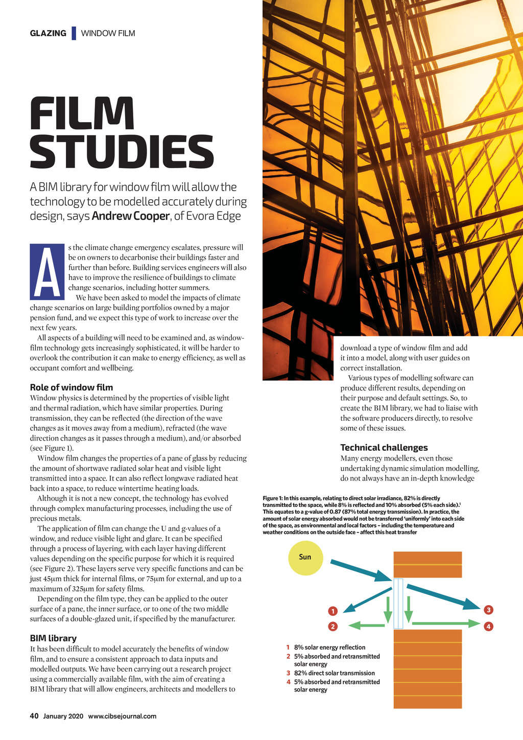 GLAZING | WINDOW FILM FILM STUDIES A BIM library for window film will allow the technology to be modelled accurately during design, says Andrew Cooper, of Evora Edge A s the climate change emergency escalates, pressure will be on owners to decarbonise their buildings faster and further than before. Building services engineers will also have to improve the resilience of buildings to climate change scenarios, including hotter summers. We have been asked to model the impacts of climate change scenarios on large building portfolios owned by a major pension fund, and we expect this type of work to increase over the next few years. All aspects of a building will need to be examined and, as windowfilm technology gets increasingly sophisticated, it will be harder to overlook the contribution it can make to energy efficiency, as well as occupant comfort and wellbeing. download a type of window film and add it into a model, along with user guides on correct installation. Various types of modelling software can produce different results, depending on their purpose and default settings. So, to create the BIM library, we had to liaise with the software producers directly, to resolve some of these issues. Role of window film Window physics is determined by the properties of visible light and thermal radiation, which have similar properties. During transmission, they can be reflected (the direction of the wave changes as it moves away from a medium), refracted (the wave direction changes as it passes through a medium), and/or absorbed (see Figure 1). Window film changes the properties of a pane of glass by reducing the amount of shortwave radiated solar heat and visible light transmitted into a space. It can also reflect longwave radiated heat back into a space, to reduce wintertime heating loads. Although it is not a new concept, the technology has evolved through complex manufacturing processes, including the use of precious metals. The application of film can change the U and g-values of a window, and reduce visible light and glare. It can be specified through a process of layering, with each layer having different values depending on the specific purpose for which it is required (see Figure 2). These layers serve very specific functions and can be just 45m thick for internal films, or 75m for external, and up to a maximum of 325m for safety films. Depending on the film type, they can be applied to the outer surface of a pane, the inner surface, or to one of the two middle surfaces of a double-glazed unit, if specified by the manufacturer. BIM library It has been difficult to model accurately the benefits of window film, and to ensure a consistent approach to data inputs and modelled outputs. We have been carrying out a research project using a commercially available film, with the aim of creating a BIM library that will allow engineers, architects and modellers to Technical challenges Many energy modellers, even those undertaking dynamic simulation modelling, do not always have an in-depth knowledge Figure 1: In this example, relating to direct solar irradiance, 82% is directly transmitted to the space, while 8% is reflected and 10% absorbed (5% each side).1 This equates to a g-value of 0.87 (87% total energy transmission). In practice, the amount of solar energy absorbed would not be transferred uniformly into each side of the space, as environmental and local factors including the temperature and weather conditions on the outside face affect this heat transfer Sun 1 8% solar energy reflection 2 5% absorbed and retransmitted solar energy 382% direct solar transmission 45% absorbed and retransmitted solar energy 40 January 2020 www.cibsejournal.com CIBSE Jan20 pp40-42 Window film.indd 40 20/12/2019 15:28