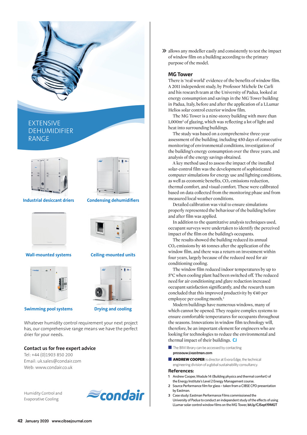 allows any modeller easily and consistently to test the impact of window film on a building according to the primary purpose of the model. MG Tower EXTENSIVE DEHUMIDIFIER RANGE Industrial desiccant driers Condensing dehumidifiers Wall-mounted systems Ceiling-mounted units Swimming pool systems Drying and cooling Whatever humidity control requirement your next project has, our comprehensive range means we have the perfect drier for your needs. There is real world evidence of the benefits of window film. A 2011 independent study, by Professor Michele De Carli and his research team at the University of Padua, looked at energy consumption and savings in the MG Tower building in Padua, Italy, before and after the application of a LLumar Helios solar control exterior window film. The MG Tower is a nine-storey building with more than 1,000m2 of glazing, which was reflecting a lot of light and heat into surrounding buildings. The study was based on a comprehensive three-year assessment of the building, including 450 days of consecutive monitoring of environmental conditions, investigation of the buildings energy consumption over the three years, and analysis of the energy savings obtained. A key method used to assess the impact of the installed solar-control film was the development of sophisticated computer simulations for energy use and lighting conditions, as well as economic benefits, CO2 emissions reduction, thermal comfort, and visual comfort. These were calibrated based on data collected from the monitoring phase and from measured local weather conditions. Detailed calibration was vital to ensure simulations properly represented the behaviour of the building before and after film was applied. In addition to the quantitative analysis techniques used, occupant surveys were undertaken to identify the perceived impact of the film on the buildings occupants. The results showed the building reduced its annual CO2 emissions by 46 tonnes after the application of the window film, and there was a return on investment within four years, largely because of the reduced need for air conditioning cooling. The window film reduced indoor temperatures by up to 5C when cooling plant had been switched off. The reduced need for air conditioning and glare reduction increased occupant satisfaction significantly, and the research team concluded that this improved productivity by 40 per employee per cooling month.3 Modern buildings have numerous windows, many of which cannot be opened. They require complex systems to ensure comfortable temperatures for occupants throughout the seasons. Innovations in window film technology will, therefore, be an important element for engineers who are looking for technologies to reduce the environmental and thermal impact of their buildings. CJ Contact us for free expert advice The BIM library can be accessed by contacting Tel: +44 (0)1903 850 200 Email: uk.sales@condair.com Web: www.condair.co.uk ANDREW COOPER is director at Evora Edge, the technical Humidity Control and Evaporative Cooling prossouw@eastman.com engineering division of a global sustainability consultancy. References: 1 Andrew Cooper, Module 14 (Building physics and thermal comfort) of the Energy Institutes Level 2 Energy Management course. 2 Source Performance film for glass taken from a CIBSE CPD presentation by Eastman. 3 Case study: Eastman Performance Films commissioned the University of Padua to conduct an independent study of the effects of using LLumar solar control window films on the MG Tower, bit.ly/CJSept19MGT 42 January 2020 www.cibsejournal.com CIBSE Jan20 pp40-42 Window film.indd 42 20/12/2019 15:29