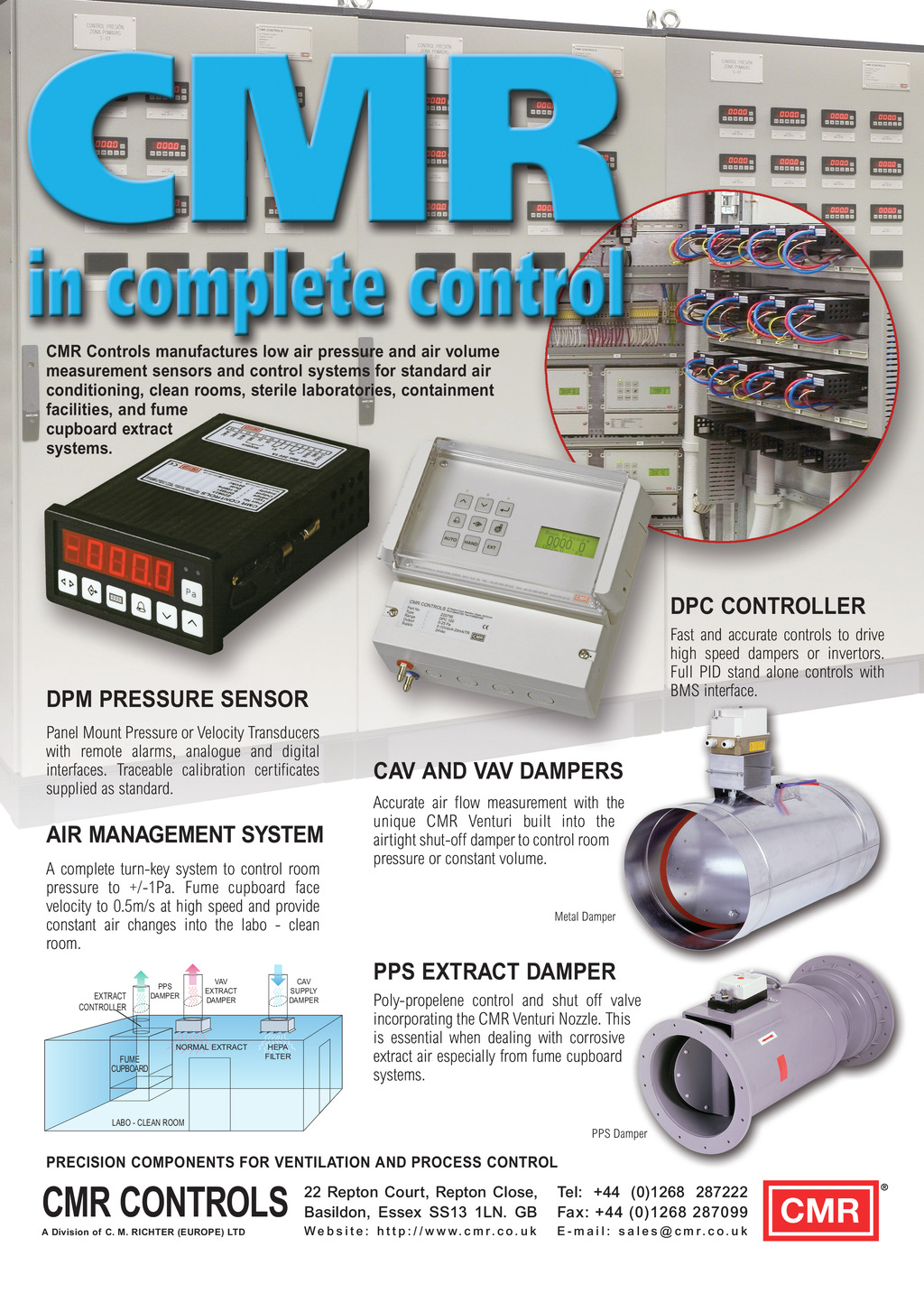 CMR Controls manufactures low air pressure and air volume measurement sensors and control systems for standard air conditioning, clean rooms, sterile laboratories, containment facilities, and fume cupboard extract systems. DPC CONTROLLER Fast and accurate controls to drive high speed dampers or invertors. Full PID stand alone controls with BMS interface. DPM PRESSURE SENSOR Panel Mount Pressure or Velocity Transducers with remote alarms, analogue and digital interfaces. Traceable calibration certificates supplied as standard. AIR MANAGEMENT SYSTEM A complete turn-key system to control room pressure to +/-1Pa. Fume cupboard face velocity to 0.5m/s at high speed and provide constant air changes into the labo - clean room. EXTRACT CONTROLLER PPS DAMPER VAV EXTRACT DAMPER NORMAL EXTRACT FUME CUPBOARD CAV SUPPLY DAMPER HEPA FILTER CAV AND VAV DAMPERS Accurate air flow measurement with the unique CMR Venturi built into the airtight shut-off damper to control room pressure or constant volume. Metal Damper PPS EXTRACT DAMPER Poly-propelene control and shut off valve incorporating the CMR Venturi Nozzle. This is essential when dealing with corrosive extract air especially from fume cupboard systems. LABO - CLEAN ROOM PPS Damper PRECISION COMPONENTS FOR VENTILATION AND PROCESS CONTROL CMR CONTROLS 22 Repton Court, Repton Close, Basildon, Essex SS13 1LN. GB Tel: +44 (0)1268 287222 Fax: +44 (0)1268 287099 A Division of C. M. RICHTER (EUROPE) LTD W e b s i t e : h t t p : / / w w w. c m r . c o . u k E - m a i l : s a l e s @ c m r. c o. u k 60 January 2020 www.cibsejournal.com p60.CIBSEMagJAN20.indd 60 18/12/2019 11:45