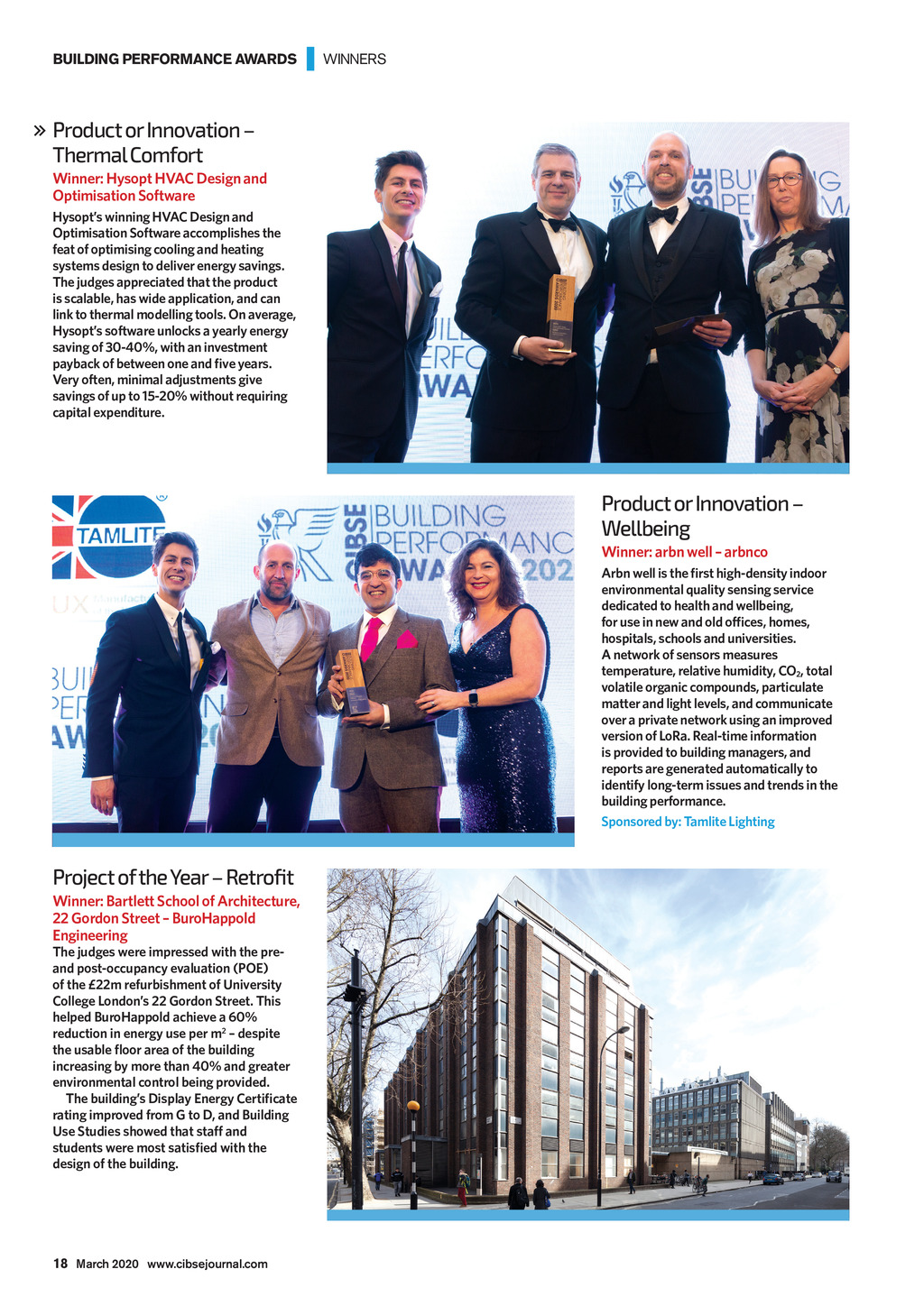 BUILDING PERFORMANCE AWARDS | WINNERS Product or Innovation Thermal Comfort Winner: Hysopt HVAC Design and Optimisation Software Hysopts winning HVAC Design and Optimisation Software accomplishes the feat of optimising cooling and heating systems design to deliver energy savings. The judges appreciated that the product is scalable, has wide application, and can link to thermal modelling tools. On average, Hysopts software unlocks a yearly energy saving of 30-40%, with an investment payback of between one and five years. Very often, minimal adjustments give savings of up to 15-20% without requiring capital expenditure. Product or Innovation Wellbeing Winner: arbn well arbnco Arbn well is the first high-density indoor environmental quality sensing service dedicated to health and wellbeing, for use in new and old offices, homes, hospitals, schools and universities. A network of sensors measures temperature, relative humidity, CO2, total volatile organic compounds, particulate matter and light levels, and communicate over a private network using an improved version of LoRa. Real-time information is provided to building managers, and reports are generated automatically to identify long-term issues and trends in the building performance. Sponsored by: Tamlite Lighting Project of the Year Retrofit Winner: Bartlett School of Architecture, 22 Gordon Street BuroHappold Engineering The judges were impressed with the preand post-occupancy evaluation (POE) of the 22m refurbishment of University College Londons 22 Gordon Street. This helped BuroHappold achieve a 60% reduction in energy use per m2 despite the usable floor area of the building increasing by more than 40% and greater environmental control being provided. The buildings Display Energy Certificate rating improved from G to D, and Building Use Studies showed that staff and students were most satisfied with the design of the building. 18 March 2020 www.cibsejournal.com CIBSE Mar20 pp14-20 Awards.indd 18 21/02/2020 14:43
