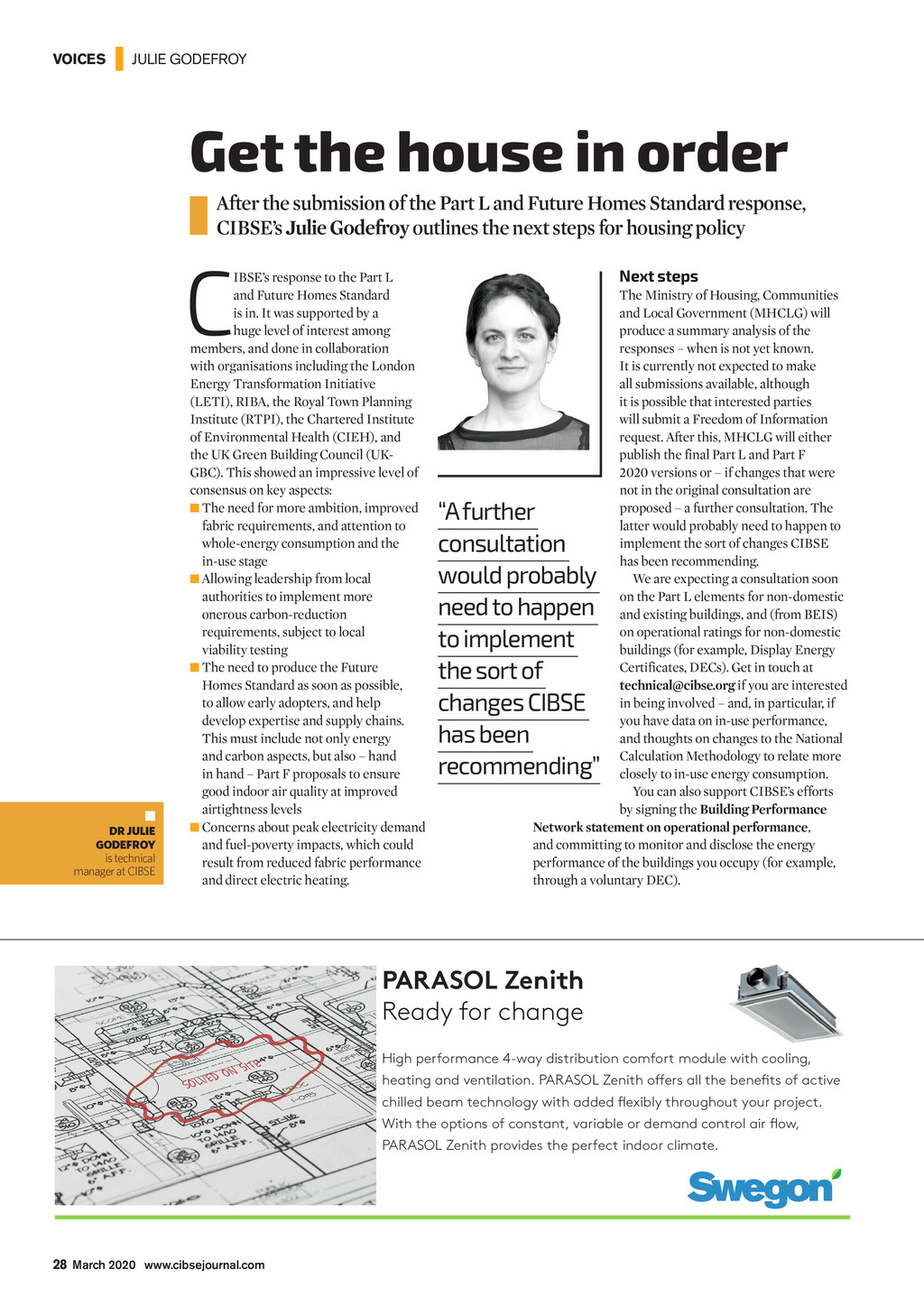 VOICES | JULIE GODEFROY Get the house in order After the submission of the Part L and Future Homes Standard response, CIBSEs Julie Godefroy outlines the next steps for housing policy C DR JULIE GODEFROY is technical manager at CIBSE IBSEs response to the Part L and Future Homes Standard is in. It was supported by a huge level of interest among members, and done in collaboration with organisations including the London Energy Transformation Initiative (LETI), RIBA, the Royal Town Planning Institute (RTPI), the Chartered Institute of Environmental Health (CIEH), and the UK Green Building Council (UKGBC). This showed an impressive level of consensus on key aspects: The need for more ambition, improved fabric requirements, and attention to whole-energy consumption and the in-use stage Allowing leadership from local authorities to implement more onerous carbon-reduction requirements, subject to local viability testing The need to produce the Future Homes Standard as soon as possible, to allow early adopters, and help develop expertise and supply chains. This must include not only energy and carbon aspects, but also hand in hand Part F proposals to ensure good indoor air quality at improved airtightness levels Concerns about peak electricity demand and fuel-poverty impacts, which could result from reduced fabric performance and direct electric heating. Next steps The Ministry of Housing, Communities and Local Government (MHCLG) will produce a summary analysis of the responses when is not yet known. It is currently not expected to make all submissions available, although it is possible that interested parties will submit a Freedom of Information request. After this, MHCLG will either publish the final Part L and Part F 2020 versions or if changes that were not in the original consultation are proposed a further consultation. The latter would probably need to happen to implement the sort of changes CIBSE has been recommending. We are expecting a consultation soon on the Part L elements for non-domestic and existing buildings, and (from BEIS) on operational ratings for non-domestic buildings (for example, Display Energy Certificates, DECs). Get in touch at technical@cibse.org if you are interested in being involved and, in particular, if you have data on in-use performance, and thoughts on changes to the National Calculation Methodology to relate more closely to in-use energy consumption. You can also support CIBSEs efforts by signing the Building Performance Network statement on operational performance, and committing to monitor and disclose the energy performance of the buildings you occupy (for example, through a voluntary DEC). A further consultation would probably need to happen to implement the sort of changes CIBSE has been recommending PARASOL Zenith Ready for change SITE D ON E SOLV High performance 4-way distribution comfort module with cooling, heating and ventilation. PARASOL Zenith offers all the benefits of active chilled beam technology with added flexibly throughout your project. With the options of constant, variable or demand control air flow, PARASOL Zenith provides the perfect indoor climate. 28 March 2020 Parasol Zenith Ad Folderwww.cibsejournal.com CIBSE.indd 1 CIBSE Mar20 pp28-29 Julie Godefroy.indd 28 13/02/2020 15:45:45 21/02/2020 14:50