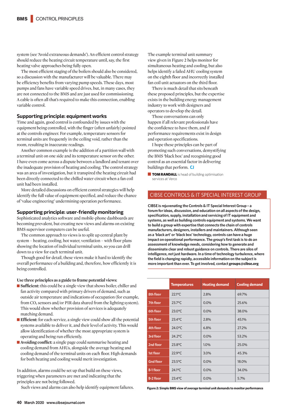 BMS | CONTROL PRINCIPLES system (see Avoid extraneous demands). An efficient control strategy should reduce the heating circuit temperature until, say, the first heating valve approaches being fully open. The most efficient staging of the boilers should also be considered, so a discussion with the manufacturer will be valuable. There may be efficiency benefits from varying pump speeds. These days, most pumps and fans have variable speed drives, but, in many cases, they are not connected to the BMS and are just used for commissioning. A cable is often all thats required to make this connection, enabling variable control. Supporting principle: equipment works Time and again, good control is confounded by issues with the equipment being controlled, with the finger (often unfairly) pointed at the controls engineer. For example, temperature sensors for terminal units are frequently in the ceiling void, rather than the room, resulting in inaccurate readings. Another common example is the addition of a partition wall with a terminal unit on one side and its temperature sensor on the other. I have even come across a dispute between a landlord and tenant over the inadequate provision of heating and cooling. The control strategy was an area of investigation, but it transpired the heating circuit had been directly connected to the chilled water circuit when a fan coil unit had been installed. More detailed discussions on efficient control strategies will help identify the full value of equipment specified, and reduce the chance of value engineering undermining operation performance. Supporting principle: user-friendly monitoring Sophisticated analytics software and mobile-phone dashboards are becoming prevalent, but creating new views and alarms on existing BMS supervisor computers can be useful. The common approach to views is to split up central plant by system heating, cooling, hot water, ventilation with floor plans showing the location of individual terminal units, so you can drill down to a view for each terminal unit. Though good for detail, these views make it hard to identify the overall performance of a building and, therefore, how efficiently it is being controlled. Use three principles as a guide to frame potential views: Sufficient: this could be a single view that shows boiler, chiller and fan activity compared with primary drivers of demand, such as outside air temperature and indications of occupation (for example, from CO2 sensors and/or PIR data shared from the lighting system). This would show whether provision of services is adequately matching demand. Efficient: for each service, a single view could show all the potential systems available to deliver it, and their level of activity. This would allow identification of whether the most appropriate system is operating and being run efficiently. Avoiding conflict: a single page could summarise heating and cooling demand from AHUs, alongside the average heating and cooling demand of the terminal units on each floor. High demands for both heating and cooling would merit investigation. In addition, alarms could be set up that build on these views, triggering when parameters are met and indicating that the principles are not being followed. Such views and alarms can also help identify equipment failures. The example terminal unit summary view given in Figure 2 helps monitor for simultaneous heating and cooling, but also helps identify a failed AHU cooling system on the eighth floor and incorrectly installed fan coil unit actuators on the third floor. There is much detail that sits beneath these proposed principles, but the expertise exists in the building energy management industry to work with designers and operators to develop the detail. Those conversations can only happen if all relevant professionals have the confidence to have them, and if performance requirements exist in design and operation specifications. I hope these principles can be part of promoting such conversations, demystifying the BMS black box and recognising good control as an essential factor in delivering buildings that perform. CJ TOM RANDALL is head of building optimisation services at Verco CIBSE CONTROLS & IT SPECIAL INTEREST GROUP CIBSE is rejuvenating the Controls & IT Special Interest Group a forum for ideas, discussion, and education on all aspects of the design, specification, supply, installation and servicing of IT equipment and systems, as well as building controls equipment and systems. We want to build a group with expertise that connects the chain of controls manufacturers, designers, installers and maintainers. Although seen as a black art or black box technology, controls can have a huge impact on operational performance. The groups first task is to do an assessment of knowledge needs, considering how to generate and disseminate clear and robust guidance on controls. There are silos of intelligence, not just hardware. In a time of technology turbulence, where the field is changing rapidly, accessible information on the subject is more important than ever. To get involved, contact groups@cibse.org Temperatures Heating demand Cooling demand 8th floor 22.1C 2.8% 69.7% 7th floor 23.7C 0.0% 25.6% 6th floor 23.0C 0.0% 38.0% 5th floor 23.4C 2.8% 45.1% 4th floor 24.0C 6.8% 27.2% 3rd floor 24.2C 0.0% 53.2% 2nd floor 23.8C 1.0% 25.0% 1st floor 22.9C 3.0% 45.3% Gnd floor 23.5C 0.0% 18.0% B-1 floor 24.1C 0.0% 34.0% B-2 floor 23.4C 0.0% 5.7% Figure 2: Simple BMS view of average terminal unit demands to monitor performance 40 March 2020 www.cibsejournal.com CIBSE Mar20 pp38-40 Controls.indd 40 21/02/2020 14:54