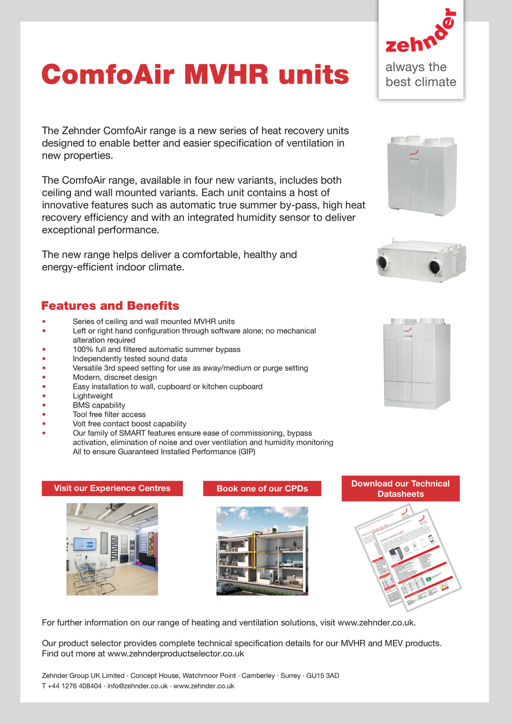The Zehnder ComfoAir range is a new series of heat recovery units designed to enable better and easier specification of ventilation in new properties. The ComfoAir range, available in four new variants, includes both ceiling and wall mounted variants. Each unit contains a host of innovative features such as automatic true summer by-pass, high heat recovery efficiency and with an integrated humidity sensor to deliver exceptional performance. The new range helps deliver a comfortable, healthy and energy-efficient indoor climate. Series of ceiling and wall mounted MVHR units Left or right hand configuration through software alone; no mechanical alteration required 100% full and filtered automatic summer bypass Independently tested sound data Versatile 3rd speed setting for use as away/medium or purge setting Modern, discreet design Easy installation to wall, cupboard or kitchen cupboard Lightweight BMS capability Tool free filter access Volt free contact boost capability Our family of SMART features ensure ease of commissioning, bypass activation, elimination of noise and over ventilation and humidity monitoring All to ensure Guaranteed Installed Performance (GIP) Visit our Experience Centres Book one of our CPDs Download our Technical Datasheets For further information on our range of heating and ventilation solutions, visit www.zehnder.co.uk. Our product selector provides complete technical specification details for our MVHR and MEV products. Find out more at www.zehnderproductselector.co.uk Zehnder Group UK Limited Concept House, Watchmoor Point Camberley Surrey GU15 3AD T +44 1276 408404 info@zehnder.co.uk www.zehnder.co.uk 60 March 2020 www.cibsejournal.com p60.CIBSEMagMAR20.indd 60 18/02/2020 09:06