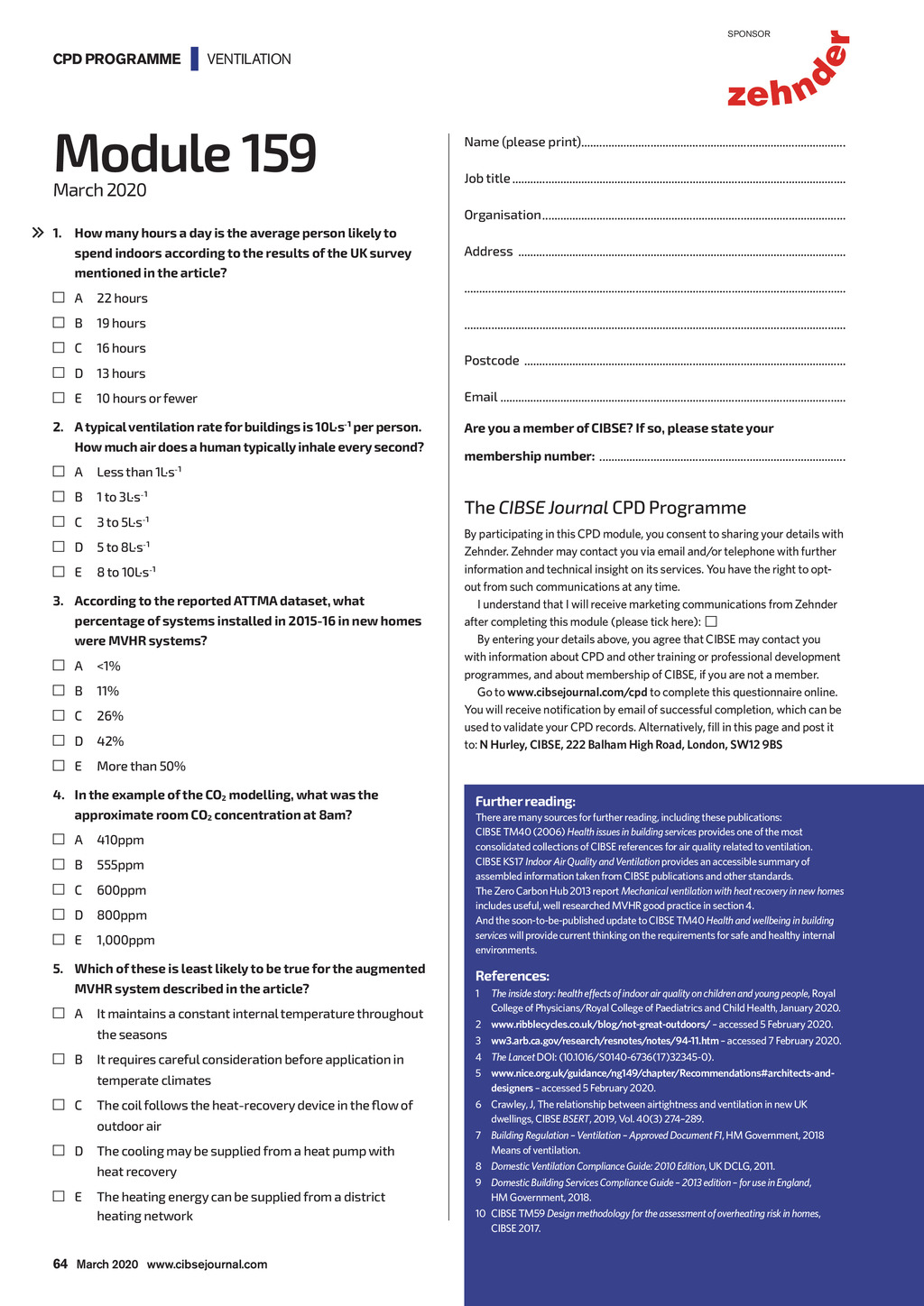 SPONSOR CPD PROGRAMME | VENTILATION Module 159 March 2020 Name (please print)......................................................................................... Job title................................................................................................................ Organisation...................................................................................................... 1.How many hours a day is the average person likely to spend indoors according to the results of the UK survey mentioned in the article? A 22 hours B 19 hours C 16 hours D 13 hours E 10 hours or fewer 2.A typical ventilation rate for buildings is 10Ls- per person. How much air does a human typically inhale every second? A Less than 1Ls- B 1 to 3Ls- C 3 to 5Ls- D 5 to 8Ls- E 8 to 10Ls- 3.According to the reported ATTMA dataset, what percentage of systems installed in 2015-16 in new homes were MVHR systems? A <1% B 11% C 26% D 42% E More than 50% 4.In the example of the CO2 modelling, what was the approximate room CO2 concentration at 8am? A 410ppm B 555ppm C 600ppm D 800ppm E 1,000ppm 5.Which of these is least likely to be true for the augmented MVHR system described in the article? A It maintains a constant internal temperature throughout the seasons B It requires careful consideration before application in temperate climates C The coil follows the heat-recovery device in the flow of outdoor air D The cooling may be supplied from a heat pump with heat recovery E The heating energy can be supplied from a district heating network Address .............................................................................................................. ............................................................................................................................... ............................................................................................................................... Postcode ............................................................................................................ Email .................................................................................................................... Are you a member of CIBSE? If so, please state your membership number: ................................................................................... The CIBSE Journal CPD Programme By participating in this CPD module, you consent to sharing your details with Zehnder. Zehnder may contact you via email and/or telephone with further information and technical insight on its services. You have the right to optout from such communications at any time. I understand that I will receive marketing communications from Zehnder after completing this module (please tick here): By entering your details above, you agree that CIBSE may contact you with information about CPD and other training or professional development programmes, and about membership of CIBSE, if you are not a member. Go to www.cibsejournal.com/cpd to complete this questionnaire online. You will receive notification by email of successful completion, which can be used to validate your CPD records. Alternatively, fill in this page and post it to: N Hurley, CIBSE, 222 Balham High Road, London, SW12 9BS Further reading: There are many sources for further reading, including these publications: CIBSE TM40 (2006) Health issues in building services provides one of the most consolidated collections of CIBSE references for air quality related to ventilation. CIBSE KS17 Indoor Air Quality and Ventilation provides an accessible summary of assembled information taken from CIBSE publications and other standards. The Zero Carbon Hub 2013 report Mechanical ventilation with heat recovery in new homes includes useful, well researched MVHR good practice in section 4. And the soon-to-be-published update to CIBSE TM40 Health and wellbeing in building services will provide current thinking on the requirements for safe and healthy internal environments. References: 1 The inside story: health effects of indoor air quality on children and young people, Royal College of Physicians/Royal College of Paediatrics and Child Health, January 2020. 2 www.ribblecycles.co.uk/blog/not-great-outdoors/ accessed 5 February 2020. 3 ww3.arb.ca.gov/research/resnotes/notes/94-11.htm accessed 7 February 2020. 4 The Lancet DOI: (10.1016/S0140-6736(17)32345-0). 5 www.nice.org.uk/guidance/ng149/chapter/Recommendations#architects-anddesigners accessed 5 February 2020. 6 Crawley, J, The relationship between airtightness and ventilation in new UK dwellings, CIBSE BSERT, 2019, Vol. 40(3) 274289. 7 Building Regulation Ventilation Approved Document F1, HM Government, 2018 Means of ventilation. 8 Domestic Ventilation Compliance Guide: 2010 Edition, UK DCLG, 2011. 9 Domestic Building Services Compliance Guide 2013 edition for use in England, HM Government, 2018. 10 CIBSE TM59 Design methodology for the assessment of overheating risk in homes, CIBSE 2017. 64 March 2020 www.cibsejournal.com CIBSE Mar20 pp61-64 CPD v3.indd 64 21/02/2020 15:08